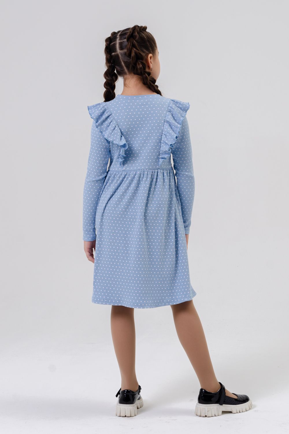 Платье для девочки в садик с длинным рукавом из трикотажного полотна в рубчик с рисунком, расширенное от линии талии, приталенного силуэта, верхние части переда и спинки с присборенными крылышками, по линии талии по центру пришит декоративный элемент. Сшито из набивного мягкого материала 95% хлопок 5% лайкра - лапша. Идеально платье в детский сад, для прогулок, для праздника и на каждый день, обладает прочностью, которая позволяет Вашей девочке активно играть и веселиться, не ограничивая движения. Прекрасная посадка позволяет использовать, как повседневное, а ещё наше платье для девочки не имеет застежек, что делает его легким в надевании и снятии, ребёнок сможет самостоятельно одеваться и чувствовать себя самой красивой принцессой. В нашей одежде не будет жарко в период включенного отопления осенью, весной и зимой. Подойдёт в качестве подарка на Новый 2024 Год, выпускной, день рождения.