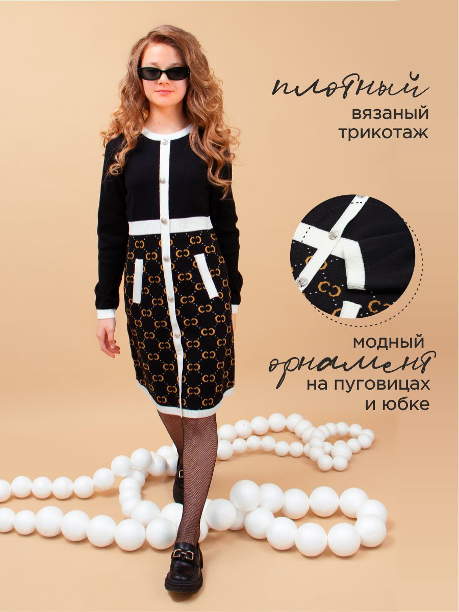 Прекрасное теплое платье для девочки. Мягкий, вязаный трикотаж не сковывает движений, обладает хорошей воздухопроницаемостью и приятно облегает тело. Модель декорирована пуговицами и рисунком. Идеальный выбор для красивого образа на каждый день.