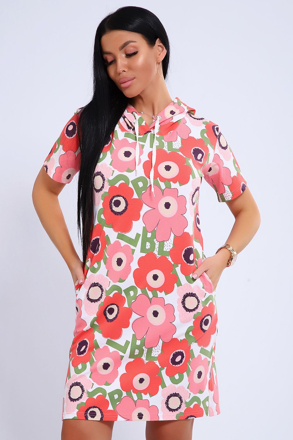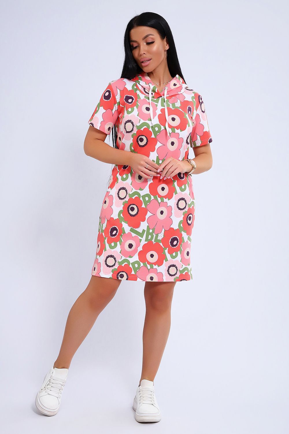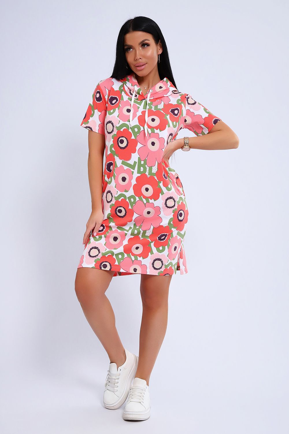 Легкое трикотажное платье из хлопковой ткани представлена в 2-х ярких летних расцветках. Свободный фасон подчеркнет вашу женственность и красоту, платье имеет удобный свободный крой и чуть приспущенный короткий рукав. Горловина декорирована капюшоном, объем которого регулируют кокетливые шнурки. В боковых швах спрятаны два глубоких кармана, что добавляет комфорта и практичности – ведь так удобно всегда иметь под рукой телефон или другие мелочи. Если вы хотите купить трикотажное изделие и ощущать в нем комфорт и свободу, то наше платье вам абсолютно подойдет!