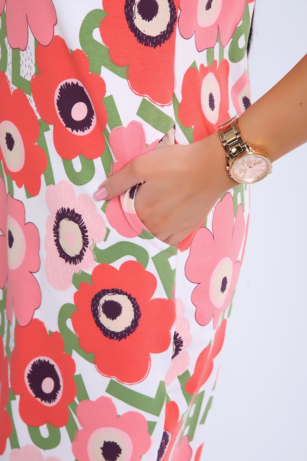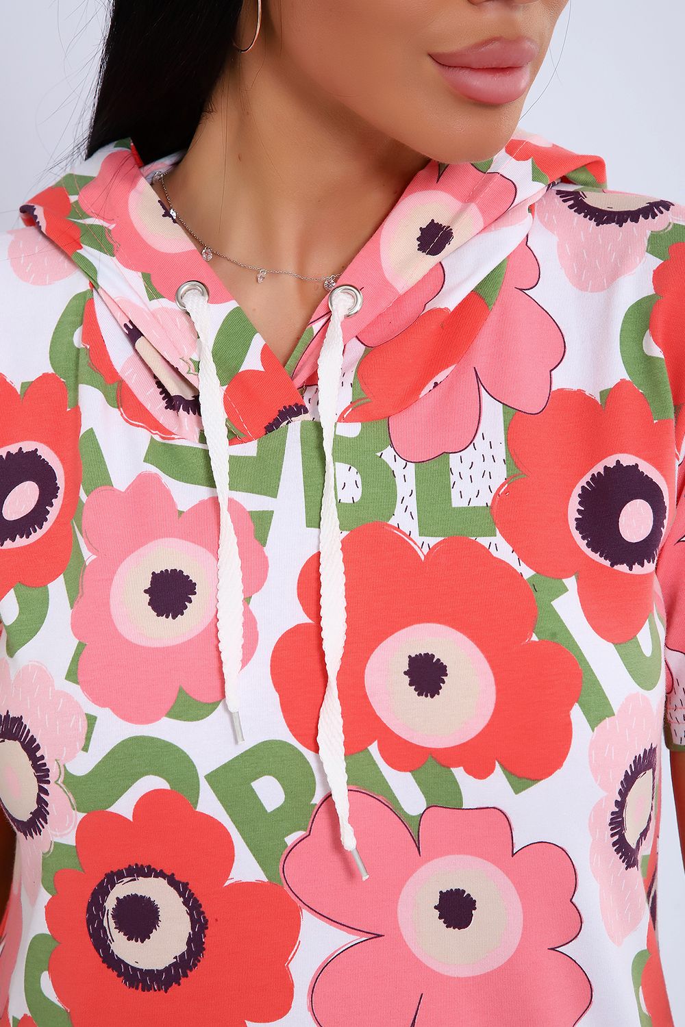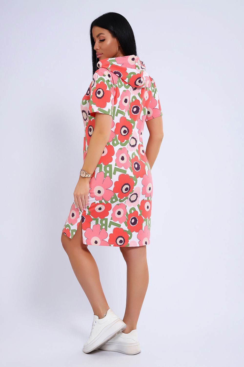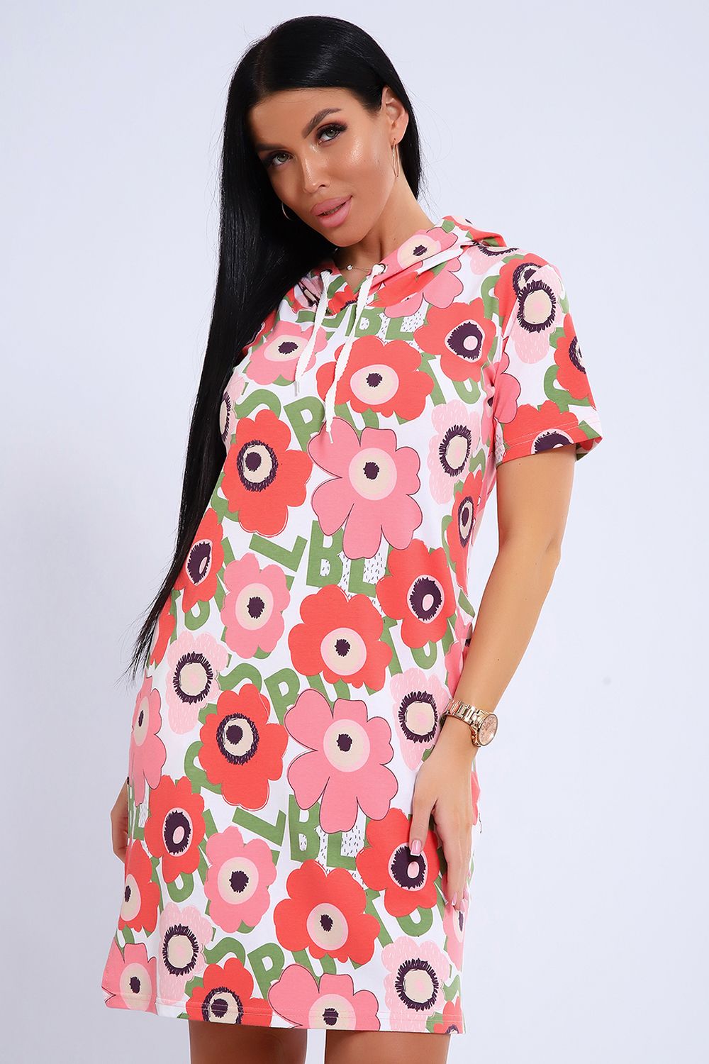 Легкое трикотажное платье из хлопковой ткани представлена в 2-х ярких летних расцветках. Свободный фасон подчеркнет вашу женственность и красоту, платье имеет удобный свободный крой и чуть приспущенный короткий рукав. Горловина декорирована капюшоном, объем которого регулируют кокетливые шнурки. В боковых швах спрятаны два глубоких кармана, что добавляет комфорта и практичности – ведь так удобно всегда иметь под рукой телефон или другие мелочи. Если вы хотите купить трикотажное изделие и ощущать в нем комфорт и свободу, то наше платье вам абсолютно подойдет!
