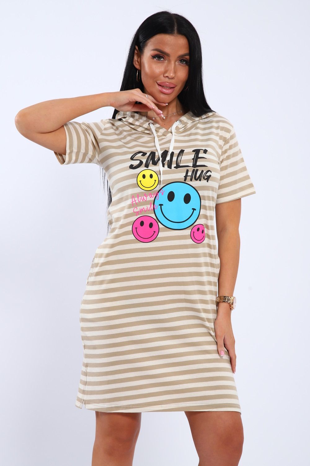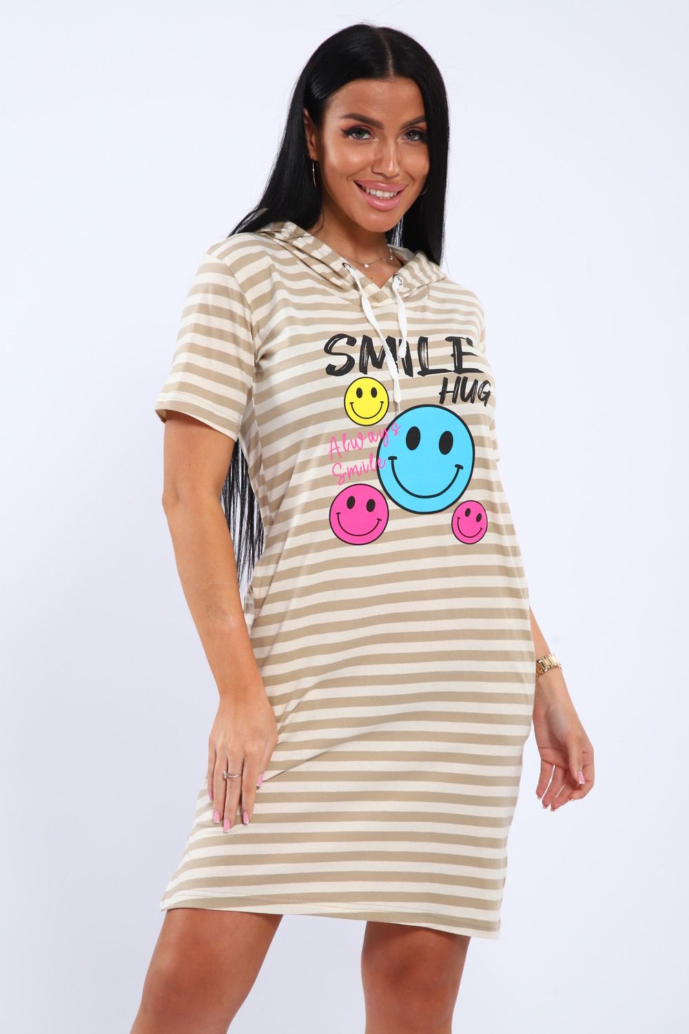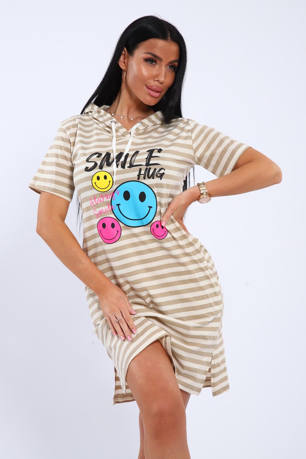 Воздушное хлопковое платье из кулирки в озорную полоску с веселыми смайликами на полочке станет приятным дополнением вашего летнего гардероба! Хлопок позволит чувствовать себя комфортно в любую погоду, капюшон поможет защитить волосы от любых природных воздействий, а полоска всегда напомнит о предстоящем отдыхе на море!