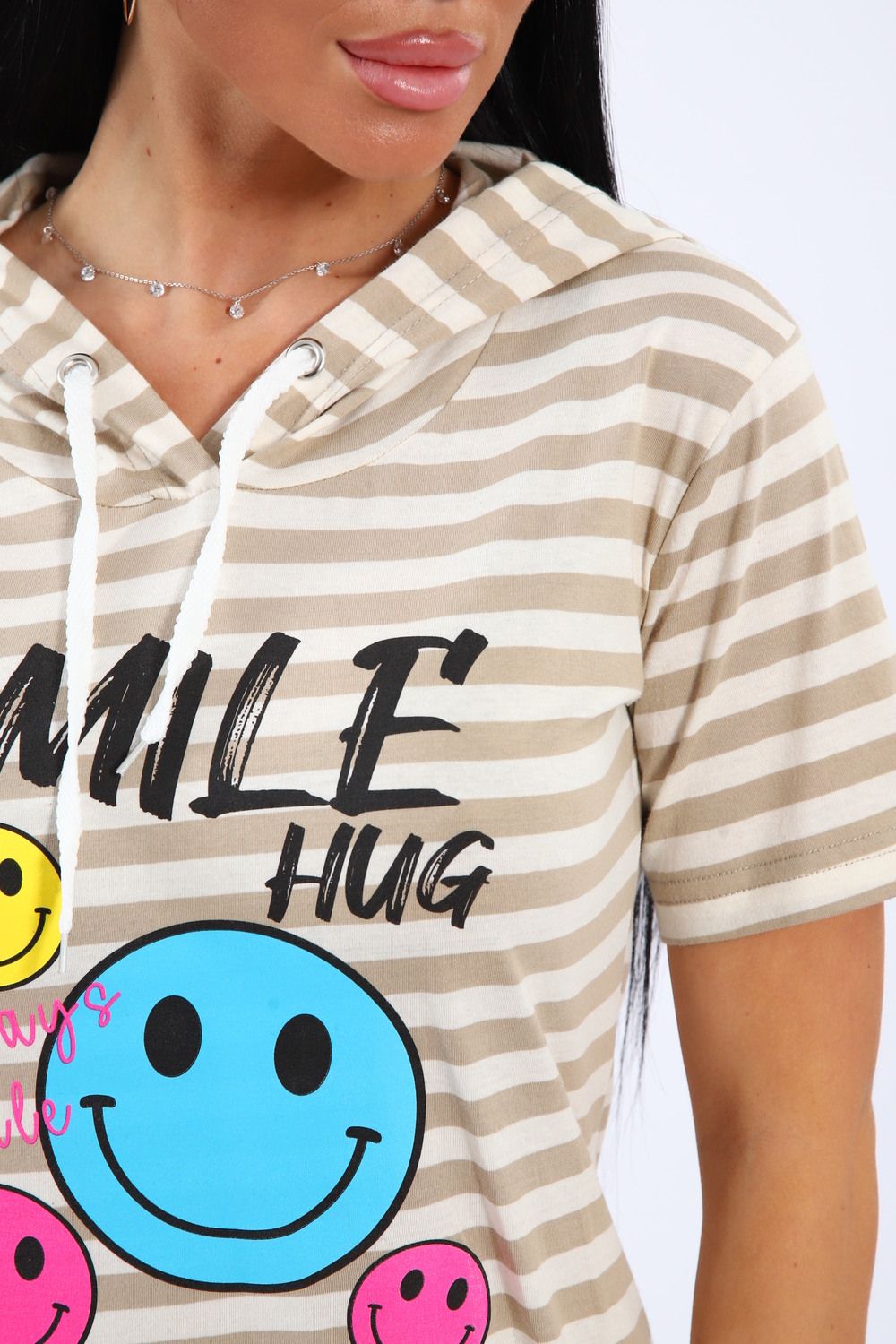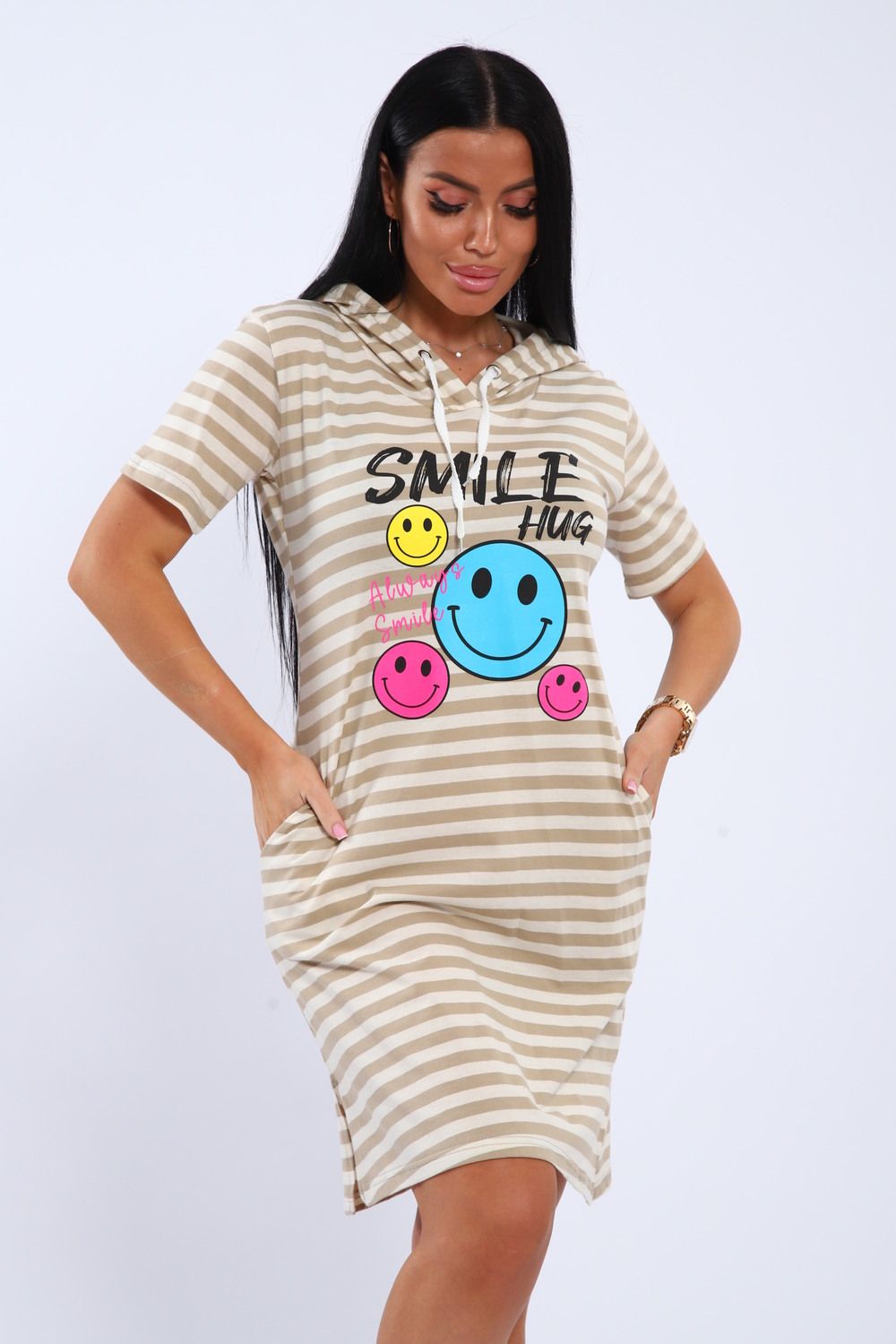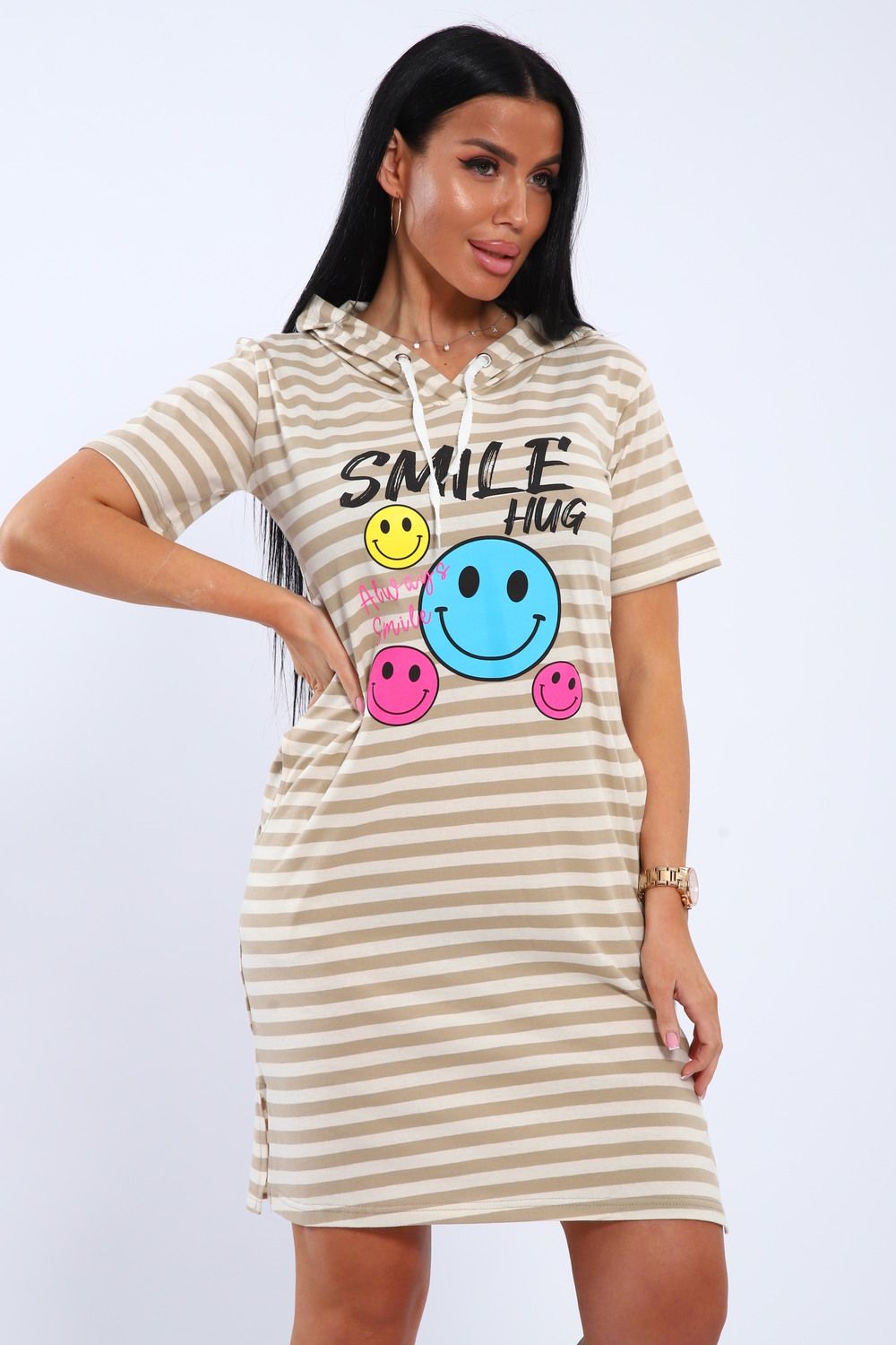 Воздушное хлопковое платье из кулирки в озорную полоску с веселыми смайликами на полочке станет приятным дополнением вашего летнего гардероба! Хлопок позволит чувствовать себя комфортно в любую погоду, капюшон поможет защитить волосы от любых природных воздействий, а полоска всегда напомнит о предстоящем отдыхе на море!