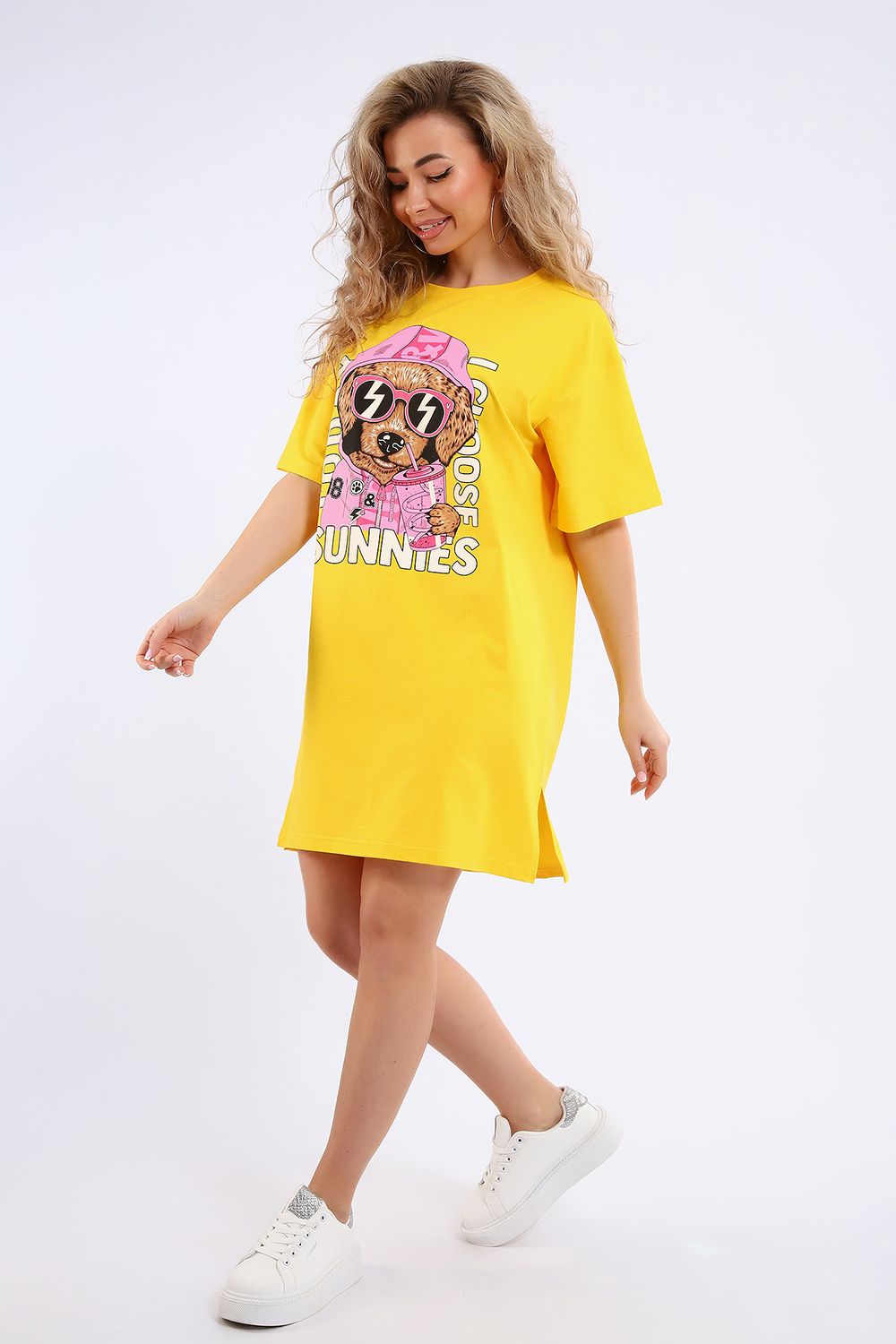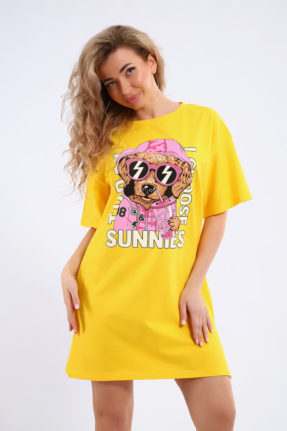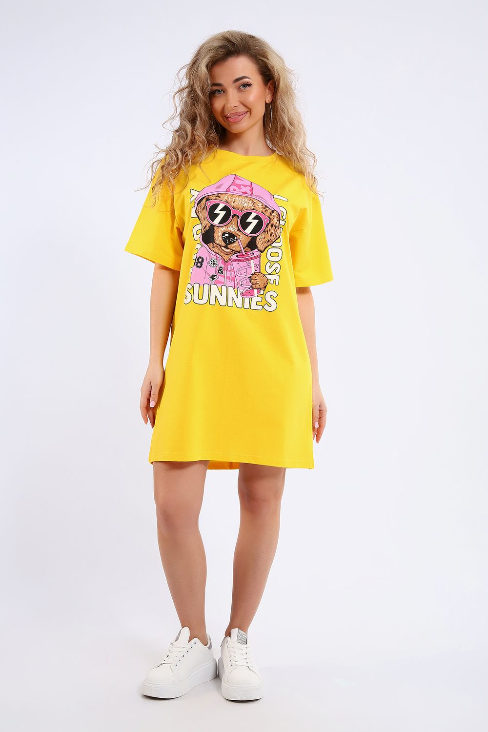 Легкое трикотажное платье-футболка формата Oversize, представлена в ярких летних расцветках, с забавным принтом на полочке. Платье идеально подойдет для любого летнего мероприятия, оно будет уместно как на пляже, так и на веселой вечеринке, прекрасно сочетается с шортами, велосипедками или лосинами. Трикотаж, из которого изготовлено платье, очень мягкий и нежный к коже и позволит хозяйке ощущать себя комфортно в любой ситуации!