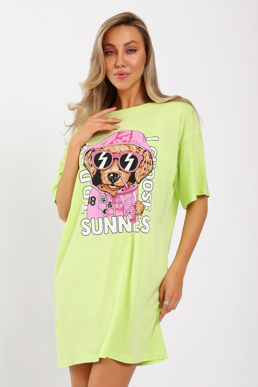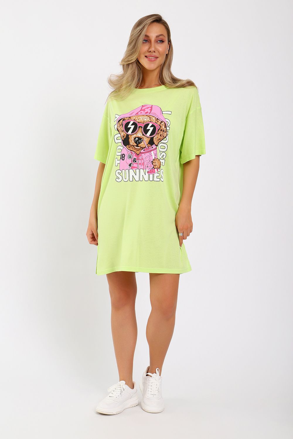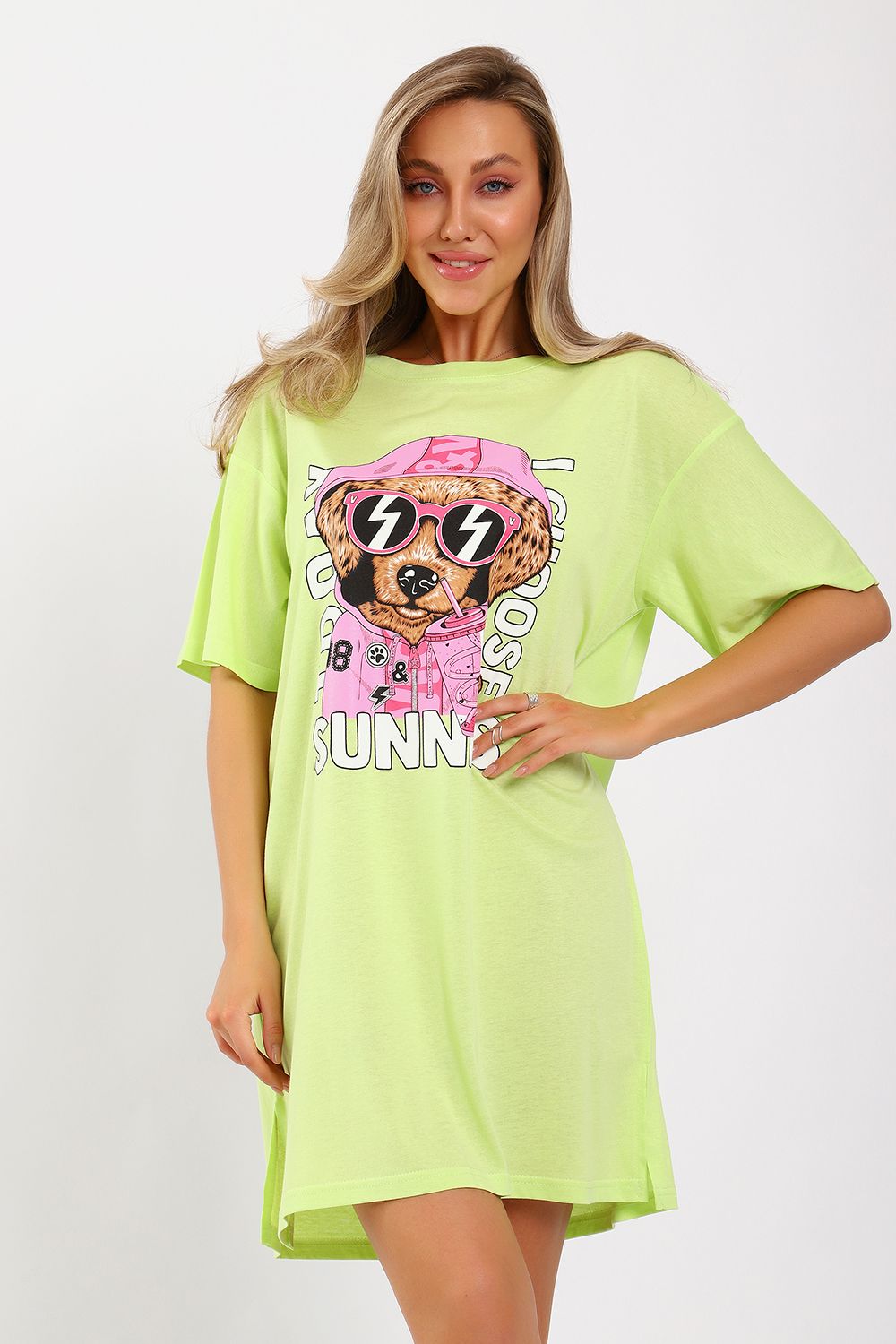 Легкое трикотажное платье-футболка формата Oversize, представлена в ярких летних расцветках, с забавным принтом на полочке. Платье идеально подойдет для любого летнего мероприятия, оно будет уместно как на пляже, так и на веселой вечеринке, прекрасно сочетается с шортами, велосипедками или лосинами. Трикотаж, из которого изготовлено платье, очень мягкий и нежный к коже и позволит хозяйке ощущать себя комфортно в любой ситуации!