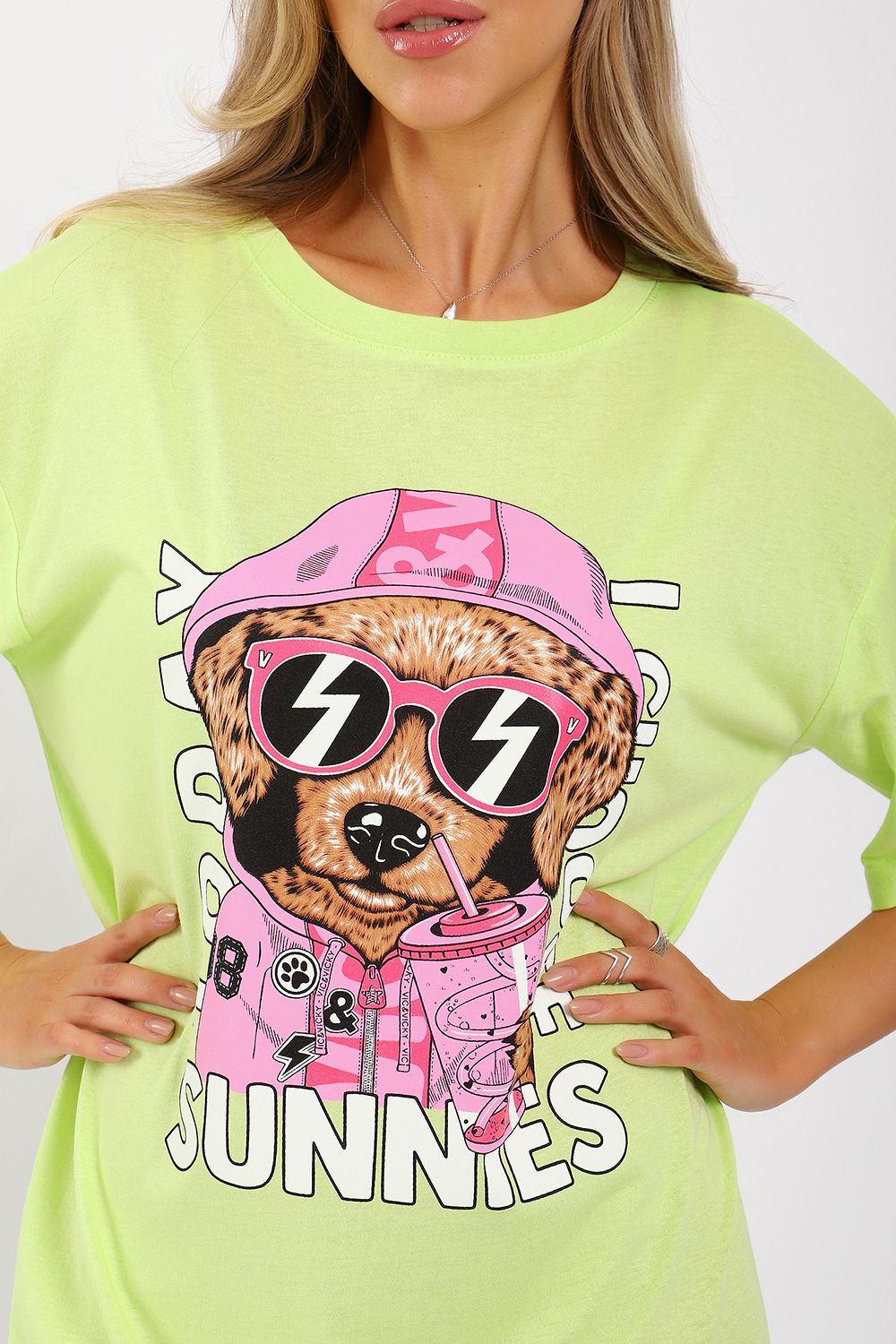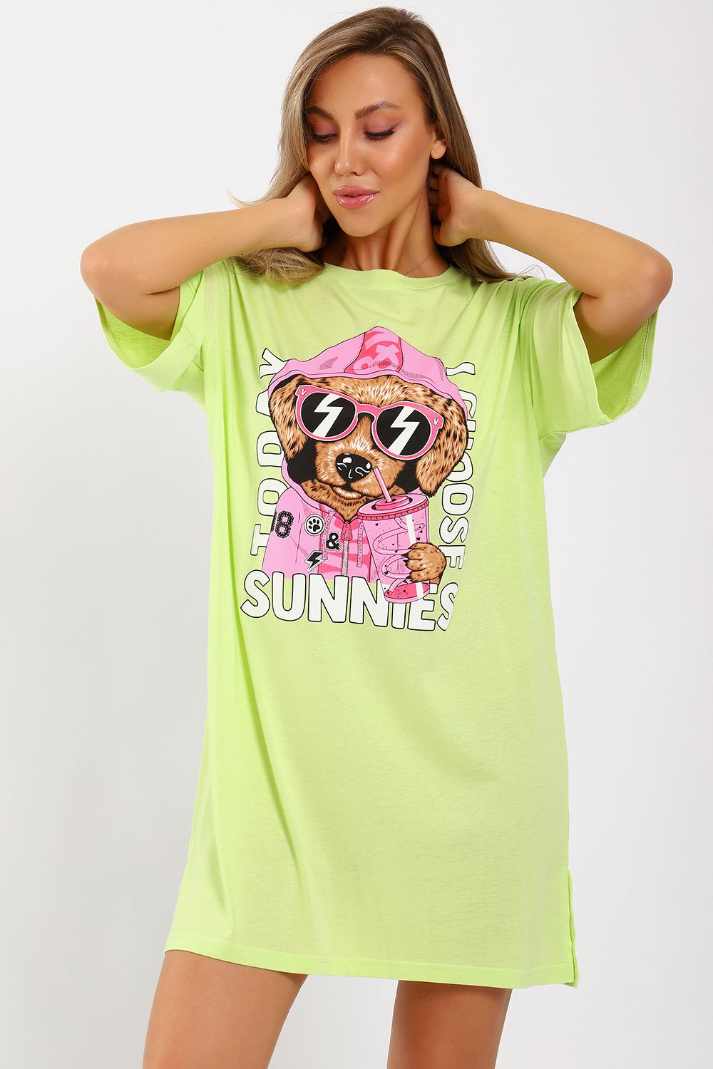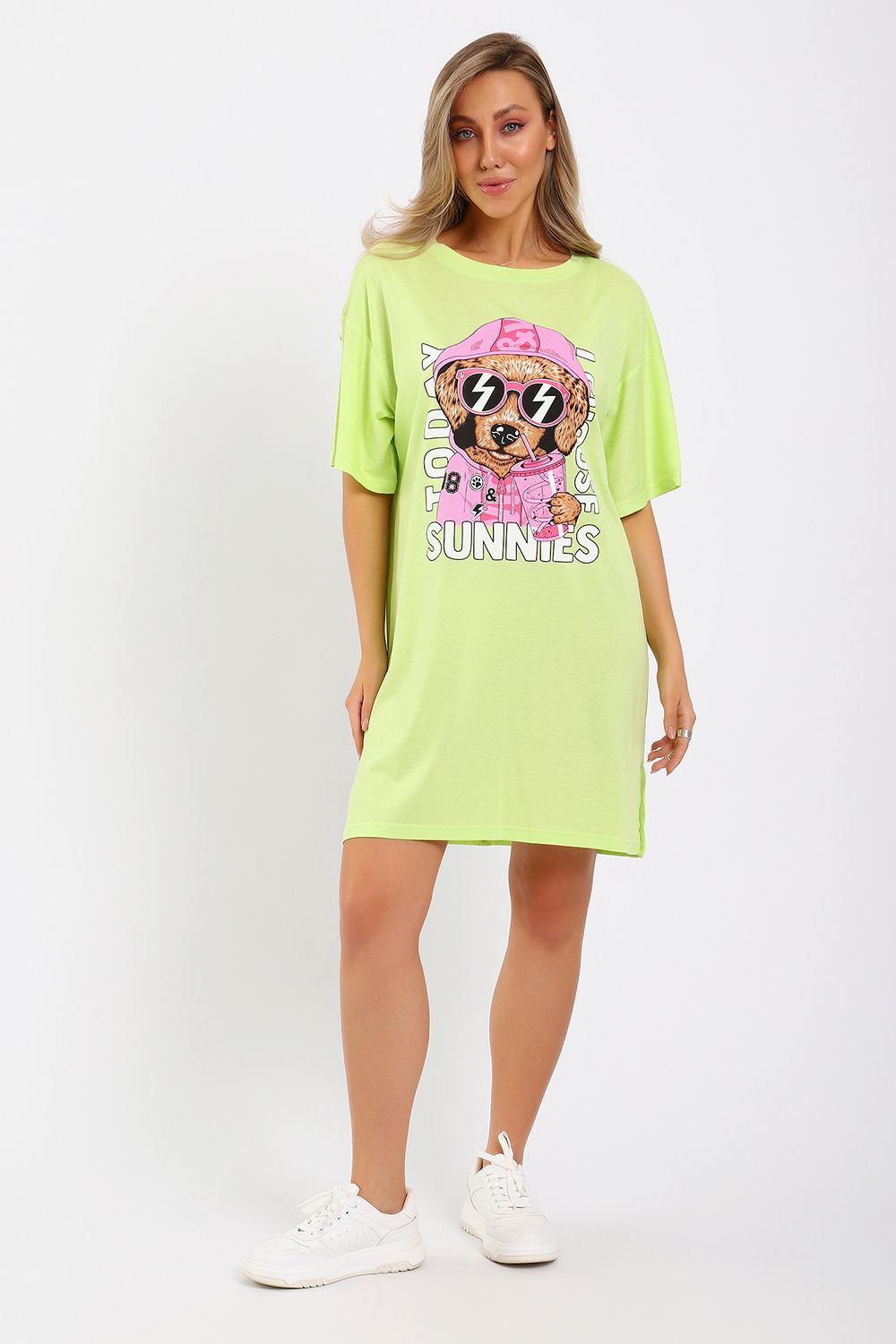 Легкое трикотажное платье-футболка формата Oversize, представлена в ярких летних расцветках, с забавным принтом на полочке. Платье идеально подойдет для любого летнего мероприятия, оно будет уместно как на пляже, так и на веселой вечеринке, прекрасно сочетается с шортами, велосипедками или лосинами. Трикотаж, из которого изготовлено платье, очень мягкий и нежный к коже и позволит хозяйке ощущать себя комфортно в любой ситуации!