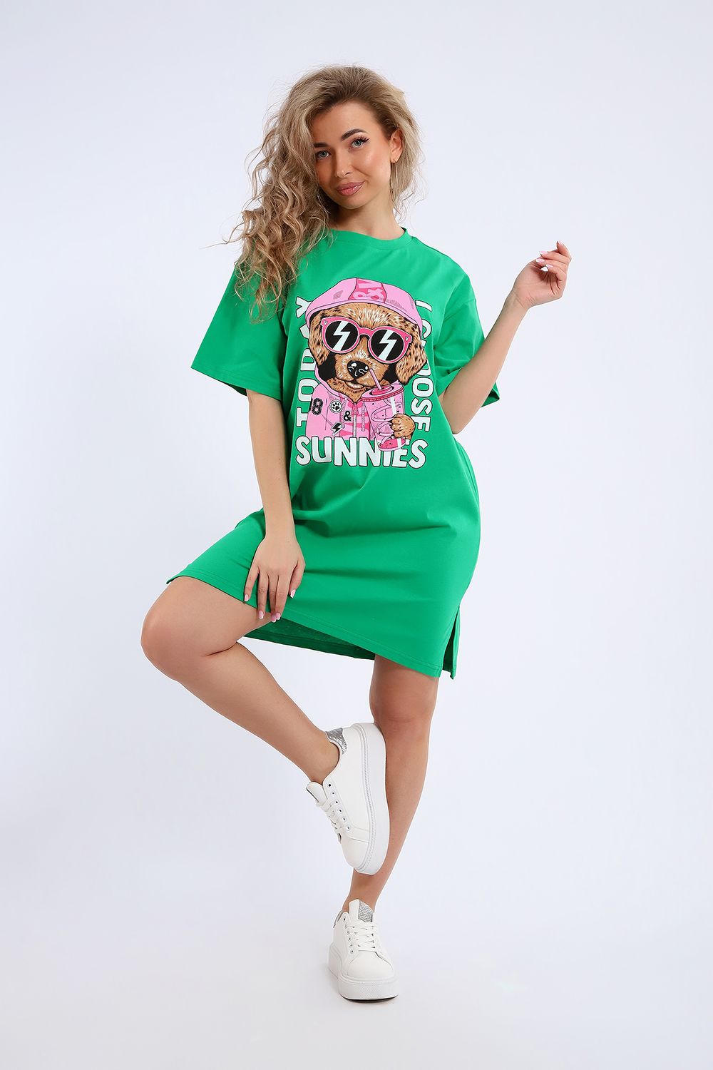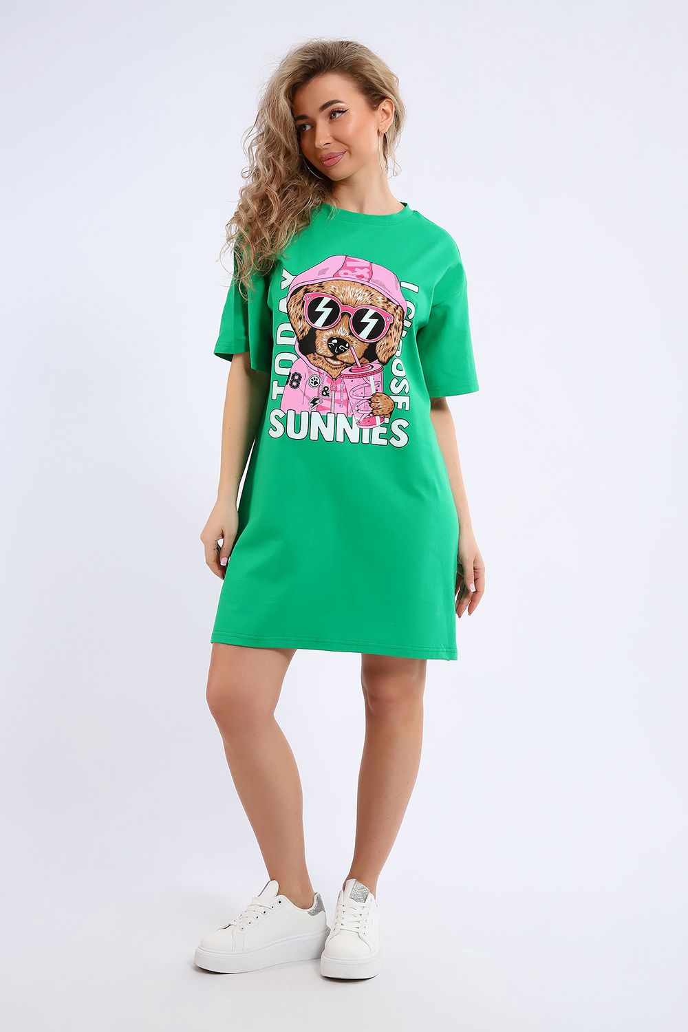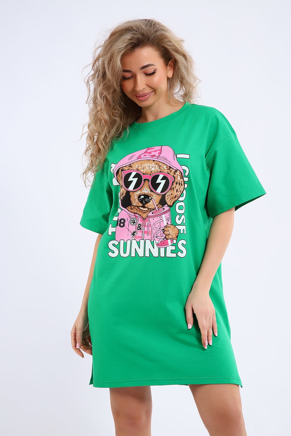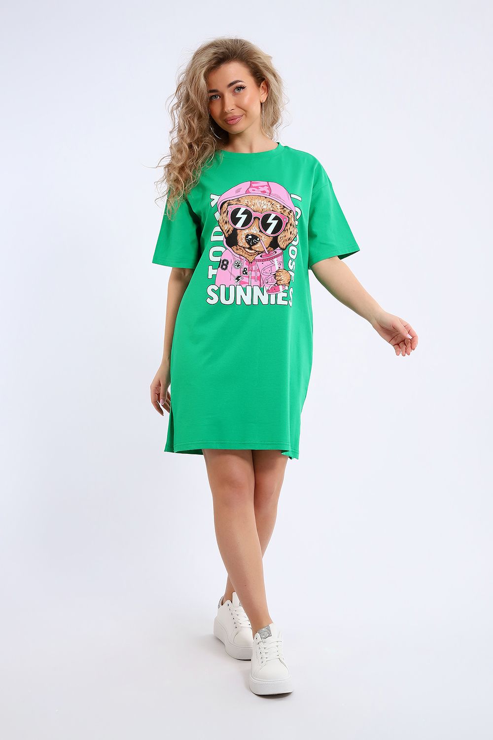 Легкое трикотажное платье-футболка формата Oversize, представлена в ярких летних расцветках, с забавным принтом на полочке. Платье идеально подойдет для любого летнего мероприятия, оно будет уместно как на пляже, так и на веселой вечеринке, прекрасно сочетается с шортами, велосипедками или лосинами. Трикотаж, из которого изготовлено платье, очень мягкий и нежный к коже и позволит хозяйке ощущать себя комфортно в любой ситуации!