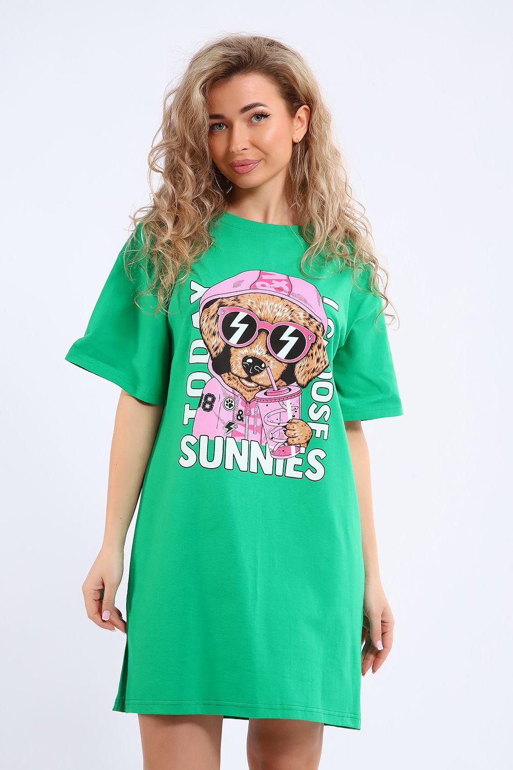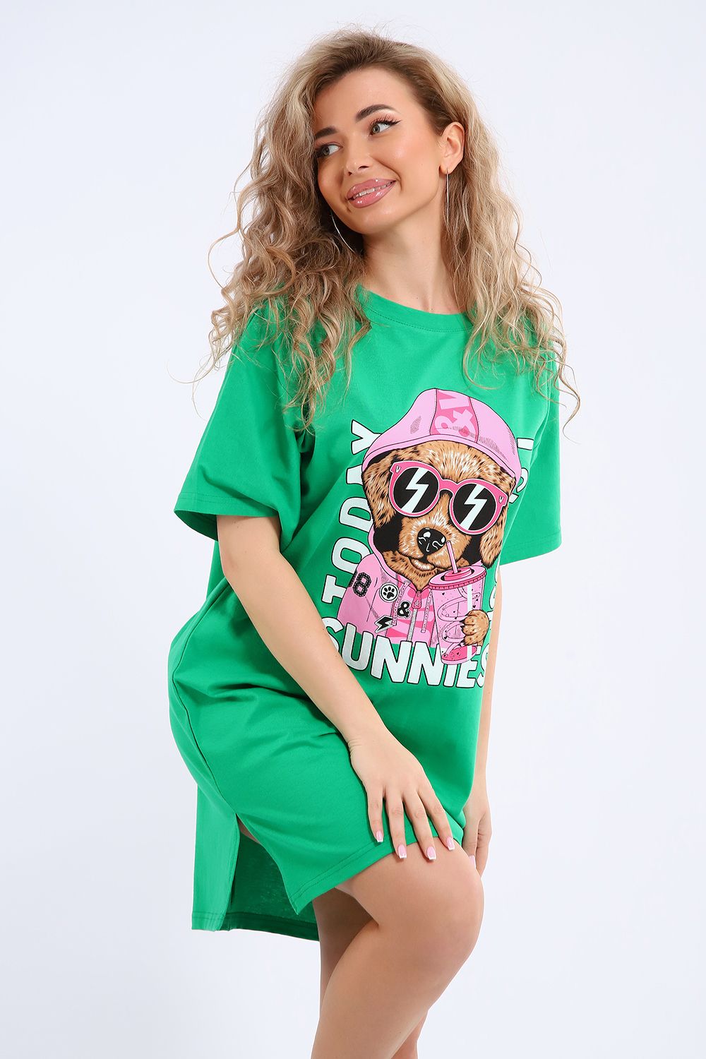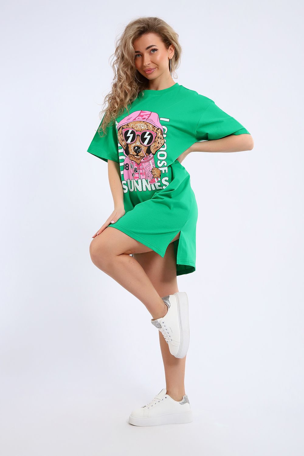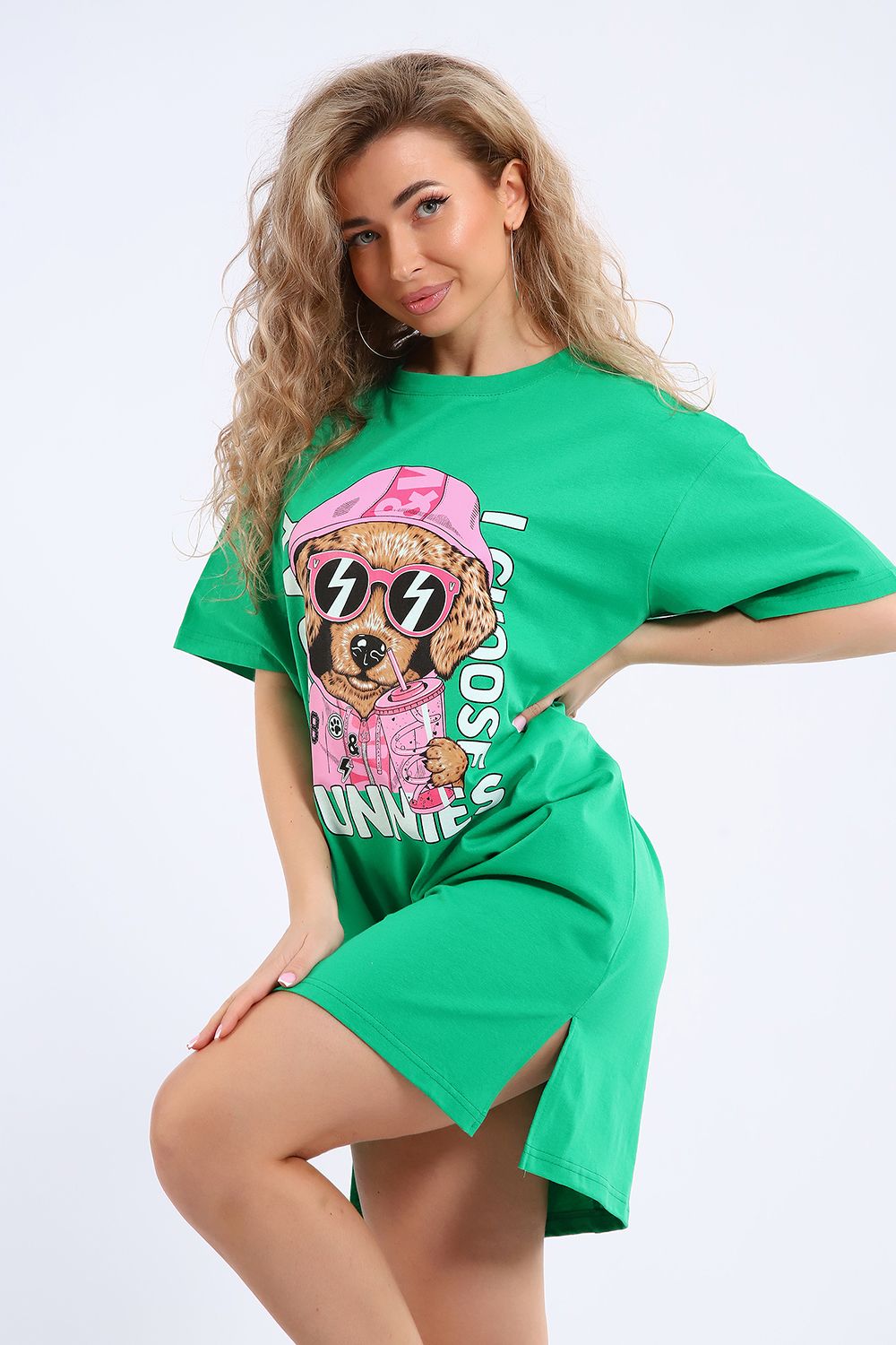 Легкое трикотажное платье-футболка формата Oversize, представлена в ярких летних расцветках, с забавным принтом на полочке. Платье идеально подойдет для любого летнего мероприятия, оно будет уместно как на пляже, так и на веселой вечеринке, прекрасно сочетается с шортами, велосипедками или лосинами. Трикотаж, из которого изготовлено платье, очень мягкий и нежный к коже и позволит хозяйке ощущать себя комфортно в любой ситуации!