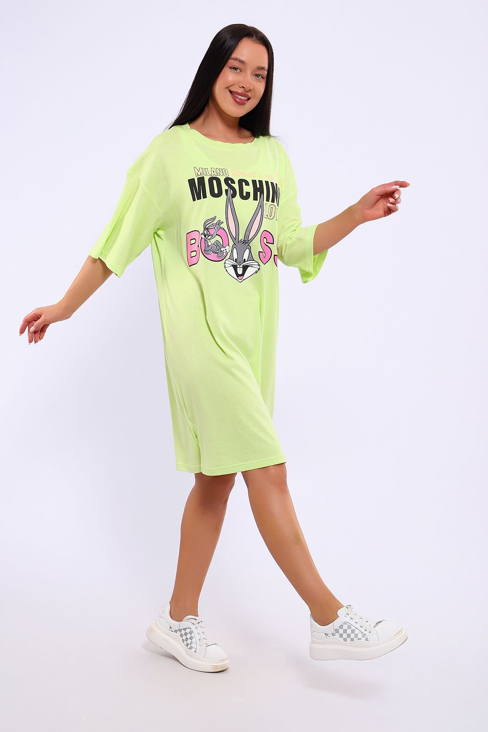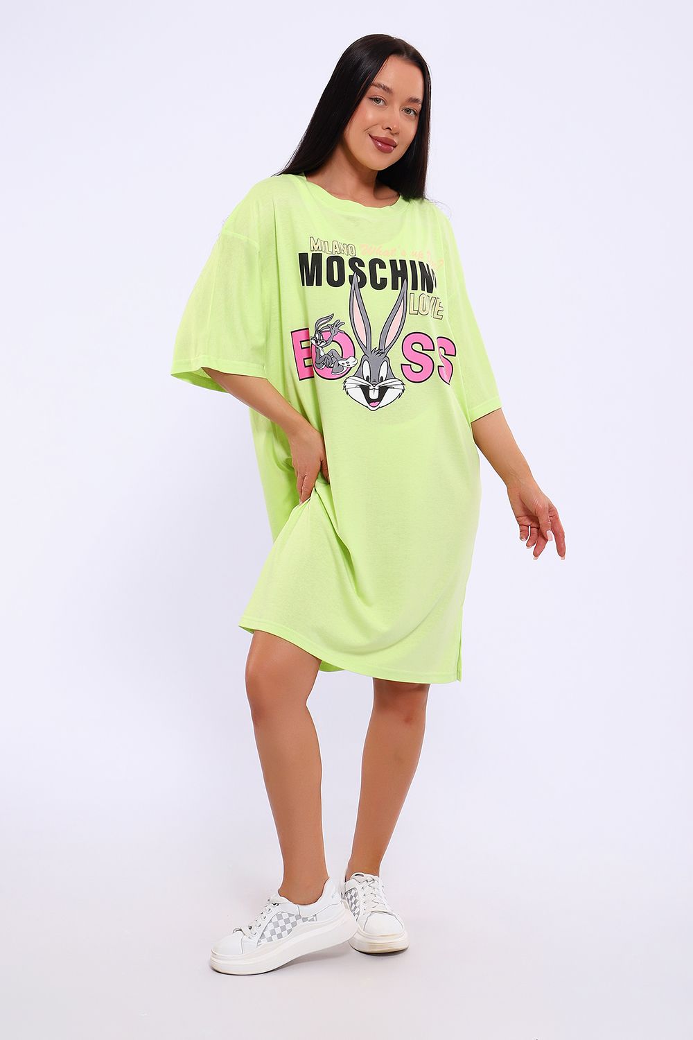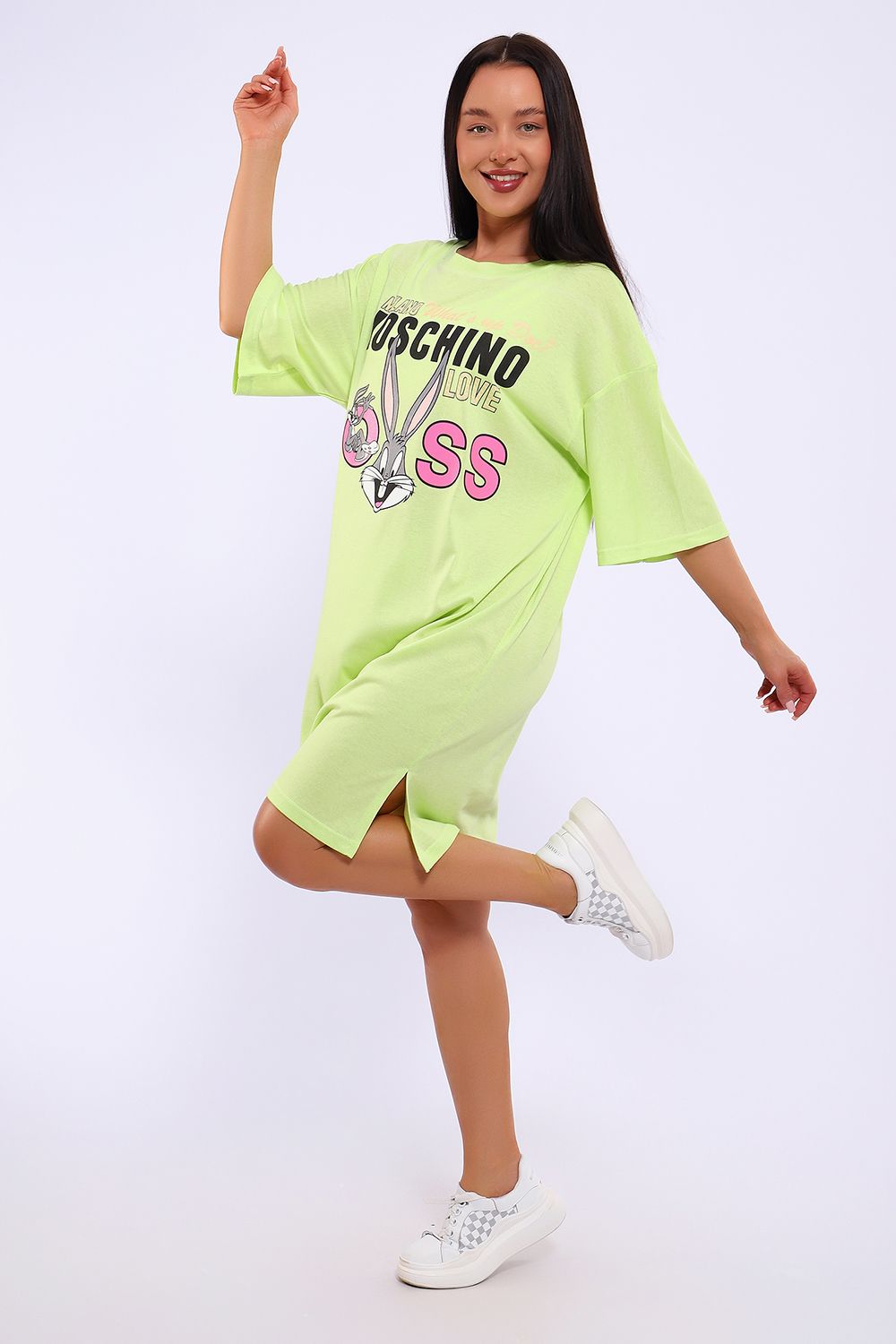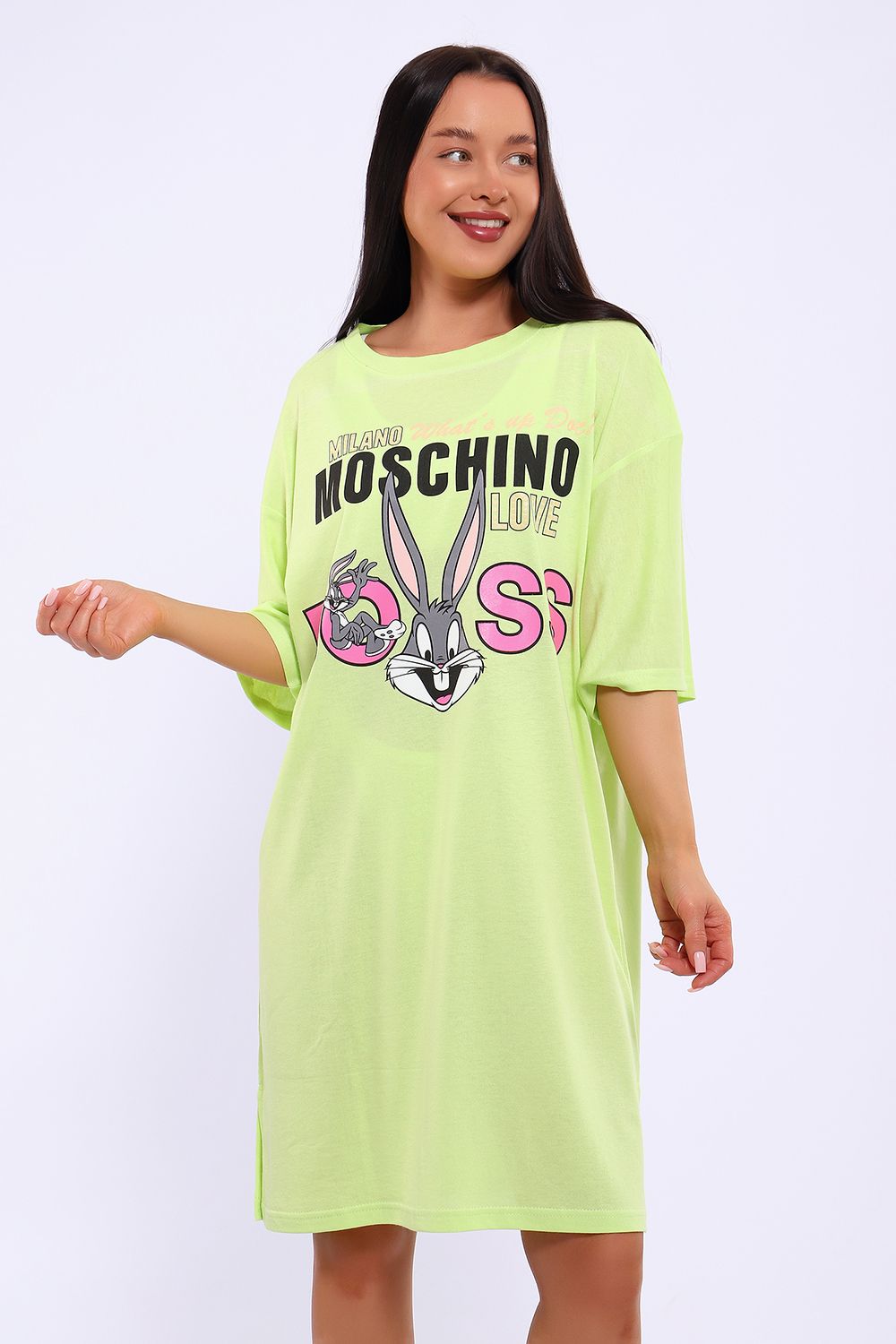 Легкое трикотажное платье-футболка формата Oversize, представлена в ярких летних расцветках, с забавным принтом на полочке. Платье идеально подойдет для любого летнего мероприятия, оно будет уместно как на пляже, так и на веселой вечеринке, прекрасно сочетается с шортами, велосипедками или лосинами. Трикотаж, из которого изготовлено платье, очень мягкий и нежный к коже и позволит хозяйке ощущать себя комфортно в любой ситуации!