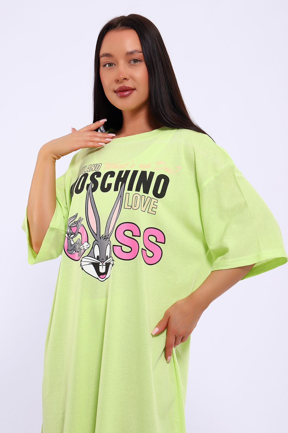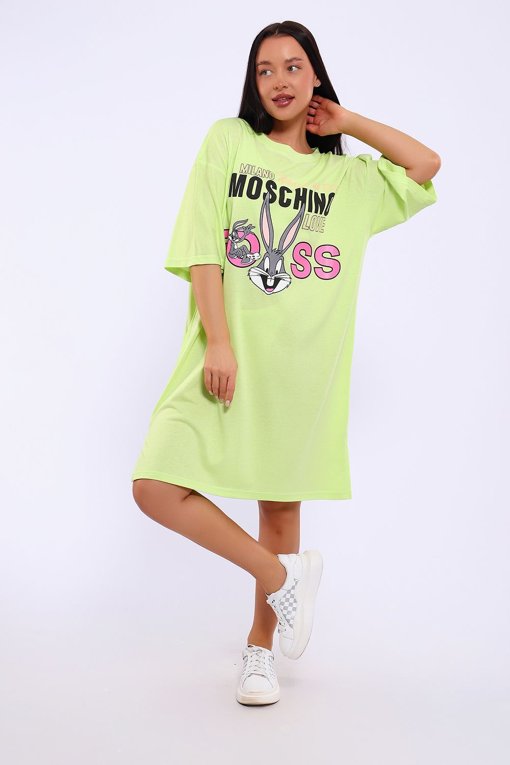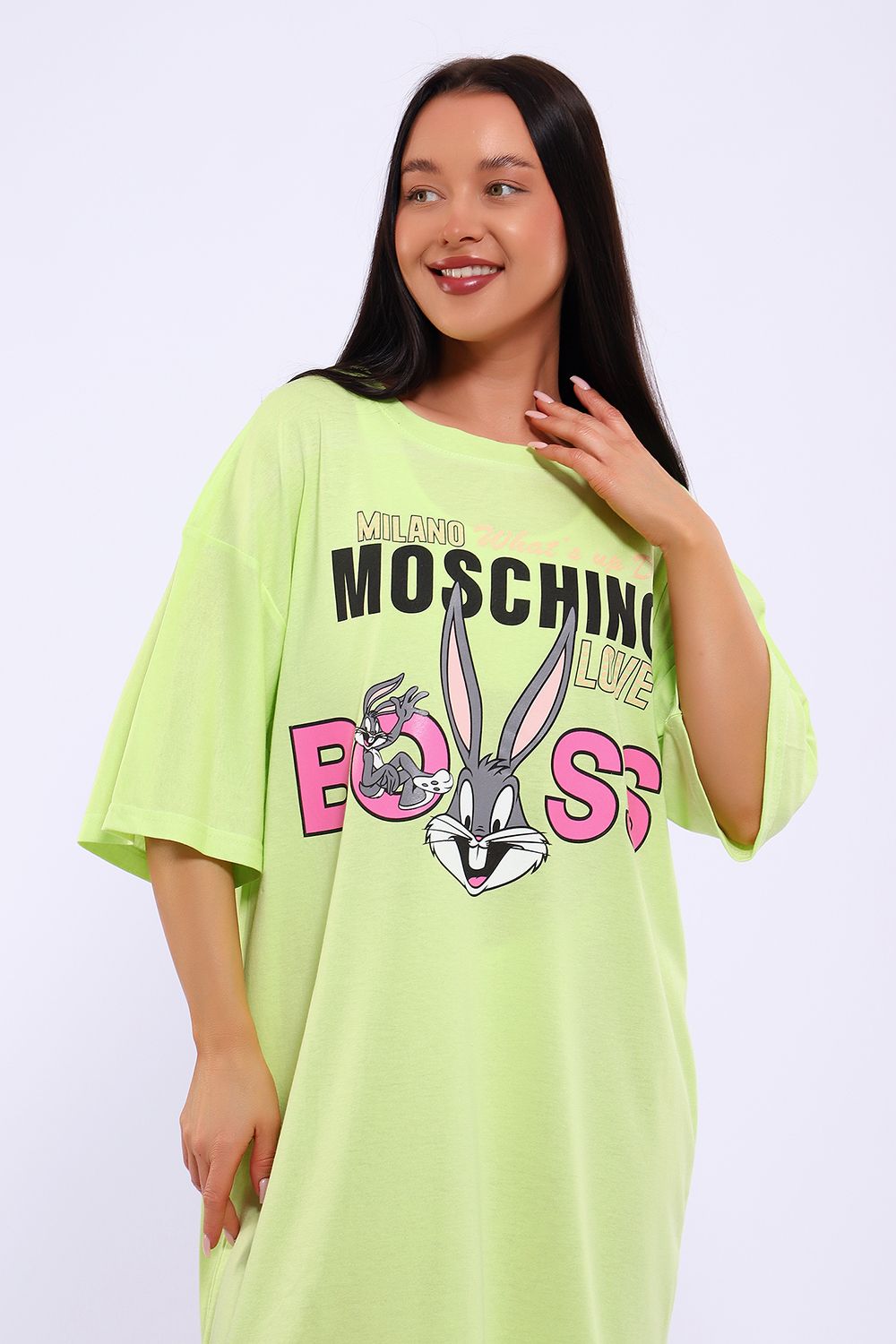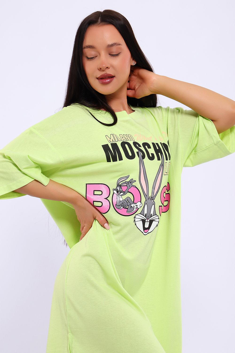 Легкое трикотажное платье-футболка формата Oversize, представлена в ярких летних расцветках, с забавным принтом на полочке. Платье идеально подойдет для любого летнего мероприятия, оно будет уместно как на пляже, так и на веселой вечеринке, прекрасно сочетается с шортами, велосипедками или лосинами. Трикотаж, из которого изготовлено платье, очень мягкий и нежный к коже и позволит хозяйке ощущать себя комфортно в любой ситуации!