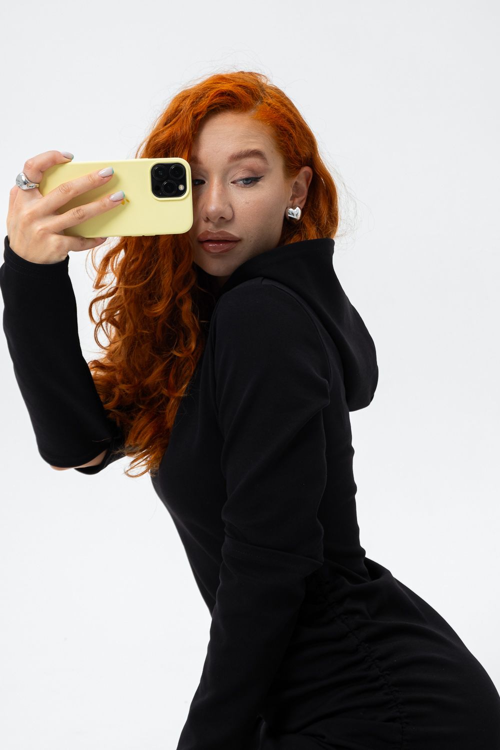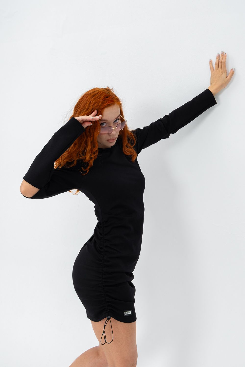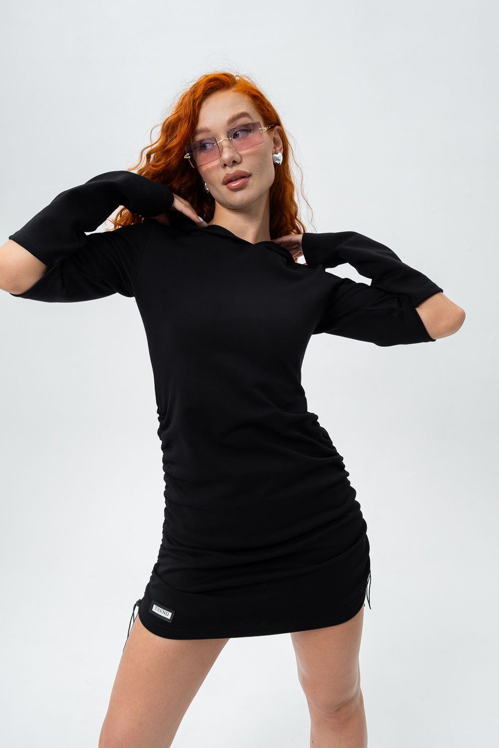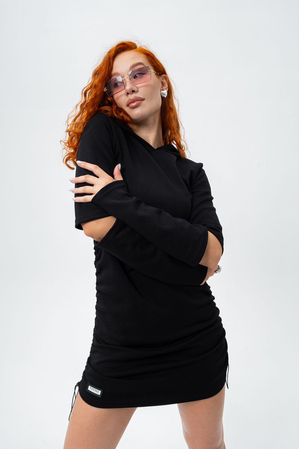 Женское спортивное платье выполнено из интерлока. Платье с капюшоном. На рукавах в районе локтей выполнены разрезы. Нашивки на капюшоне и внизу платья. Боковины собраны на регулирующийся шнурок.