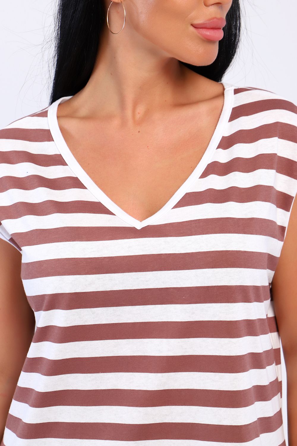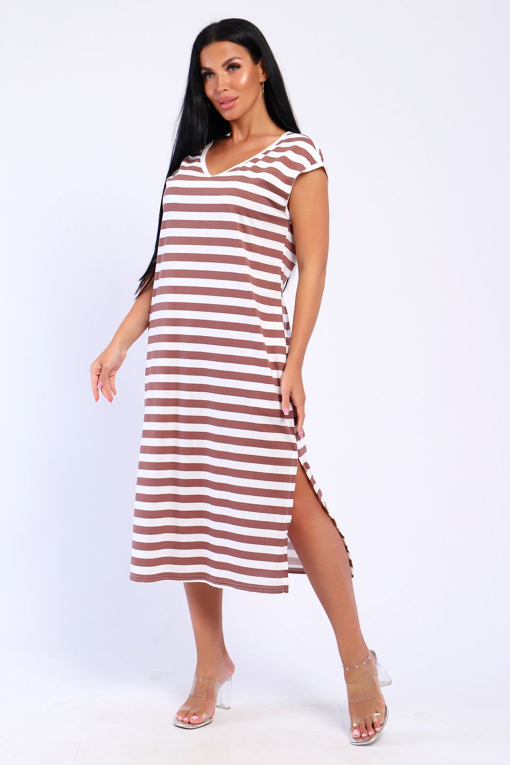 Женское платье из хлопкового гипоалергенного трикотажа. Модель свободного кроя, фигурный V- образный вырез горловины и спущенная пройма обработаны бейкой, в боковых швах удобные карманы, внизу высокие разрезы. Платье ,слегка присборенное на спинке, приталит и подчеркнёт вашу фигуру. Стильное, женственное миди- платье необходимая вещь в летнем гардеробе модницы любого возраста и фигуры. Оригинальное платье в полоску- это классика с изюминкой, популярная тема этого лета!