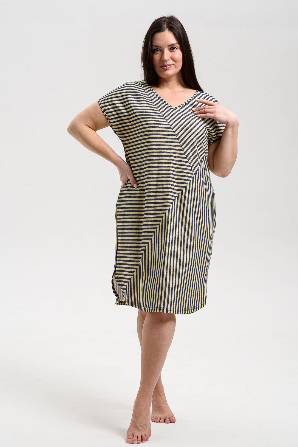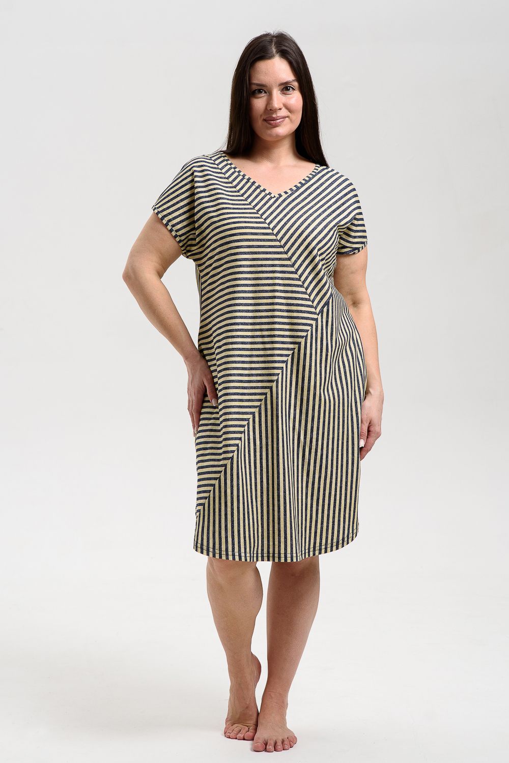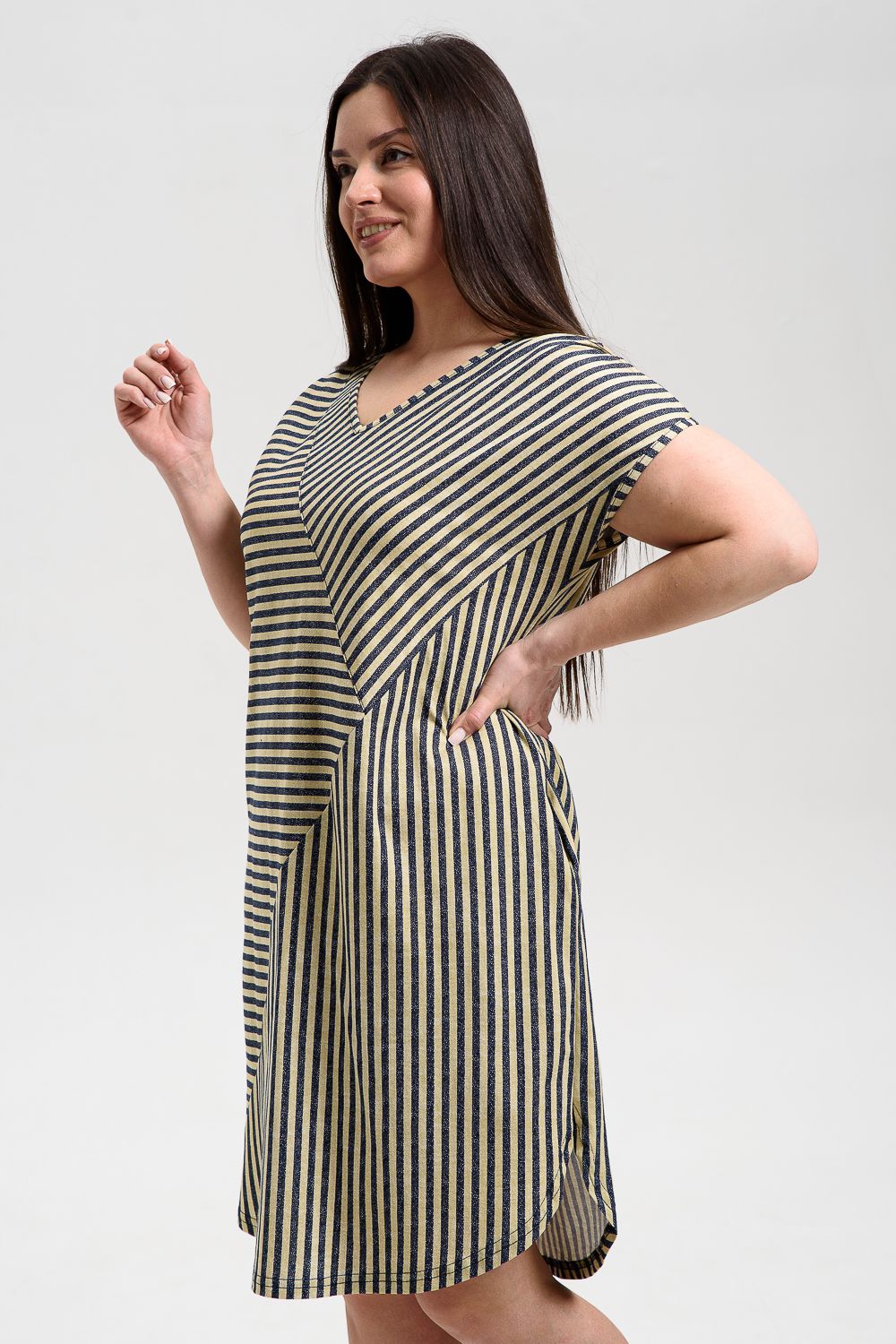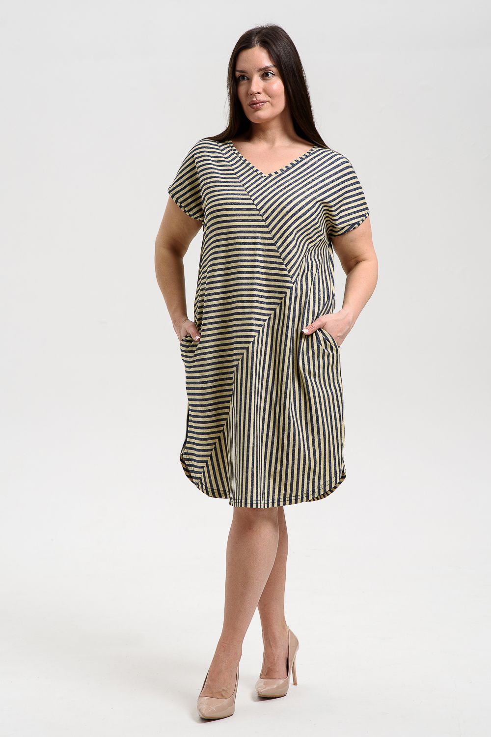 Платье прямого силуэта, с V-образной горловиной, с фигурной линией низа, с удлиненной спинкой, с карманами в боковых швах. Рукав цельнокроеный, короткий. Горловина и проймы обработаны бейкой из основного полотна.