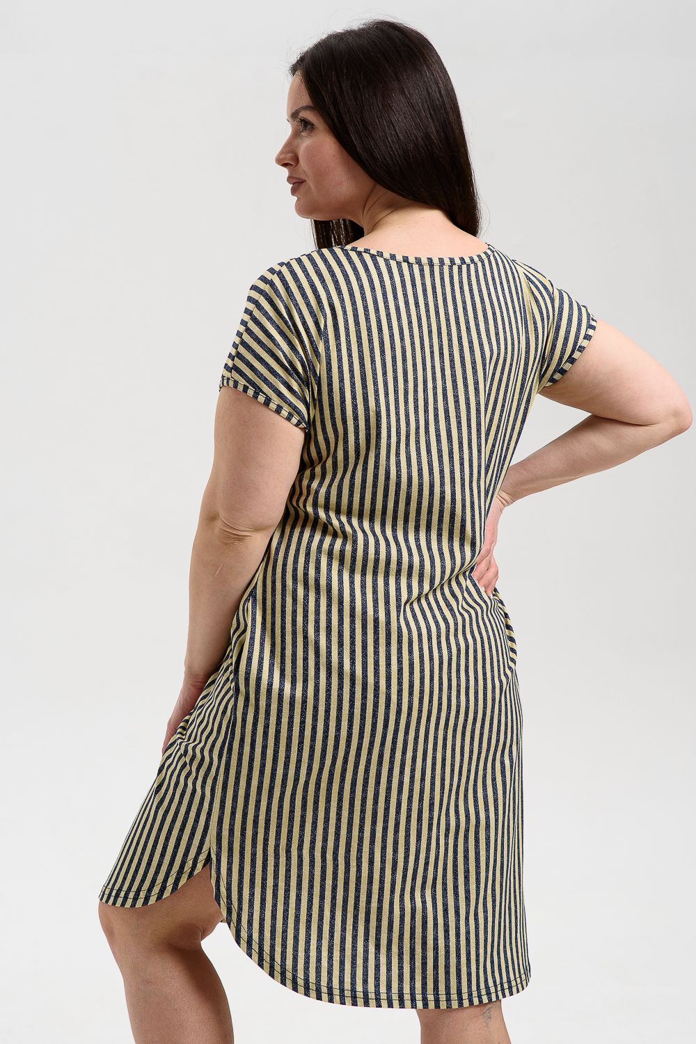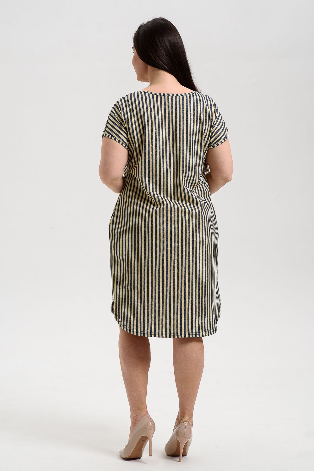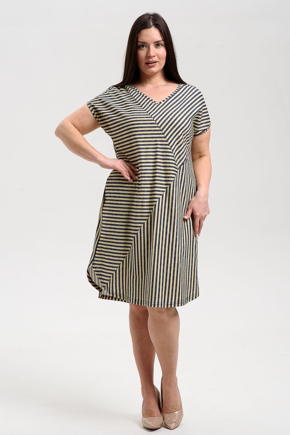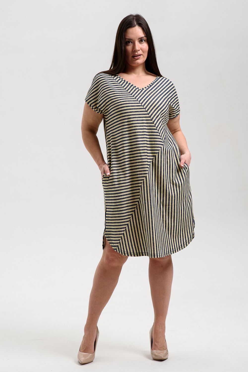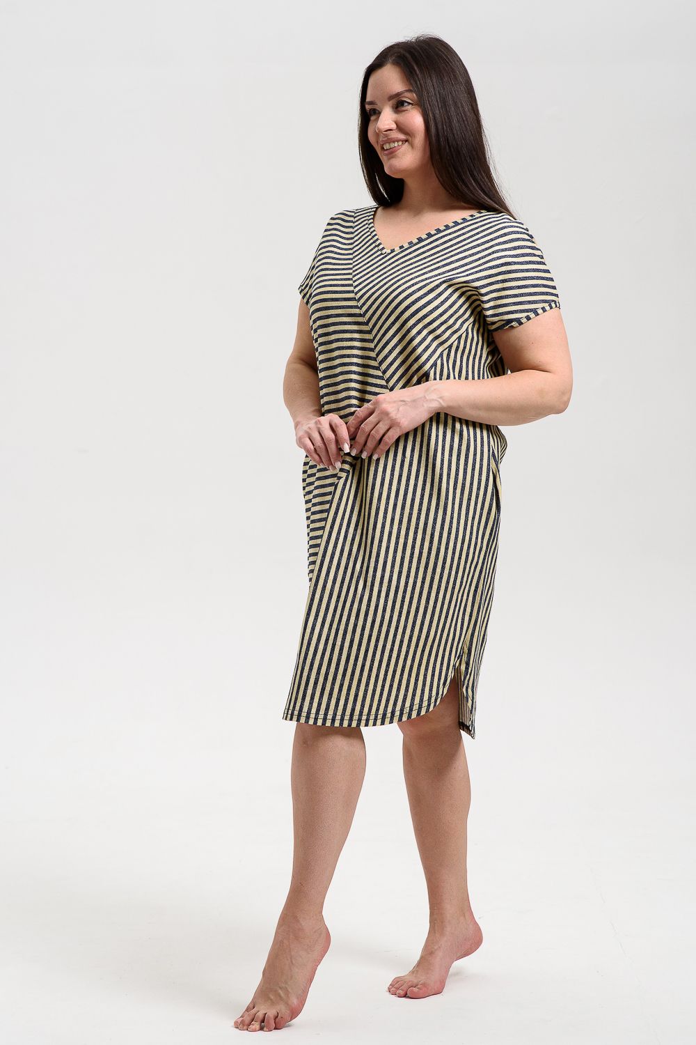 Платье прямого силуэта, с V-образной горловиной, с фигурной линией низа, с удлиненной спинкой, с карманами в боковых швах. Рукав цельнокроеный, короткий. Горловина и проймы обработаны бейкой из основного полотна.