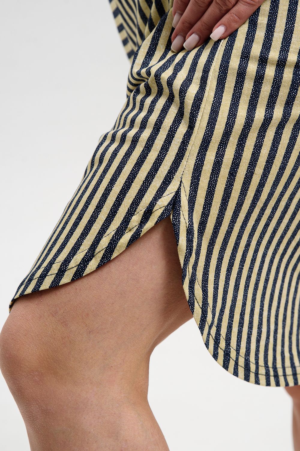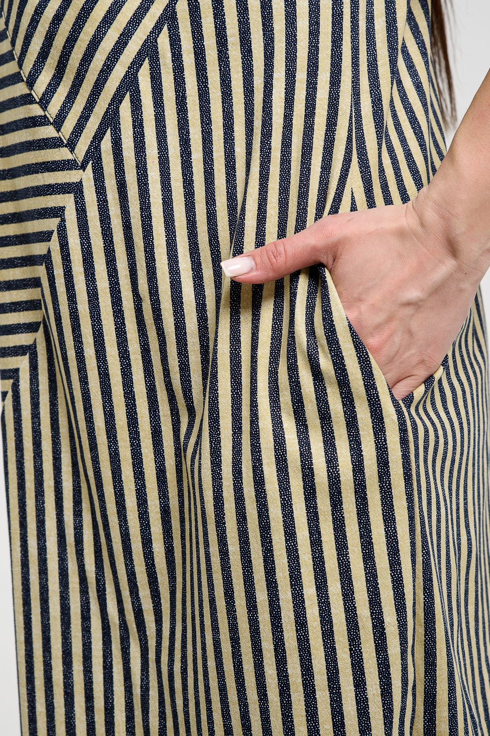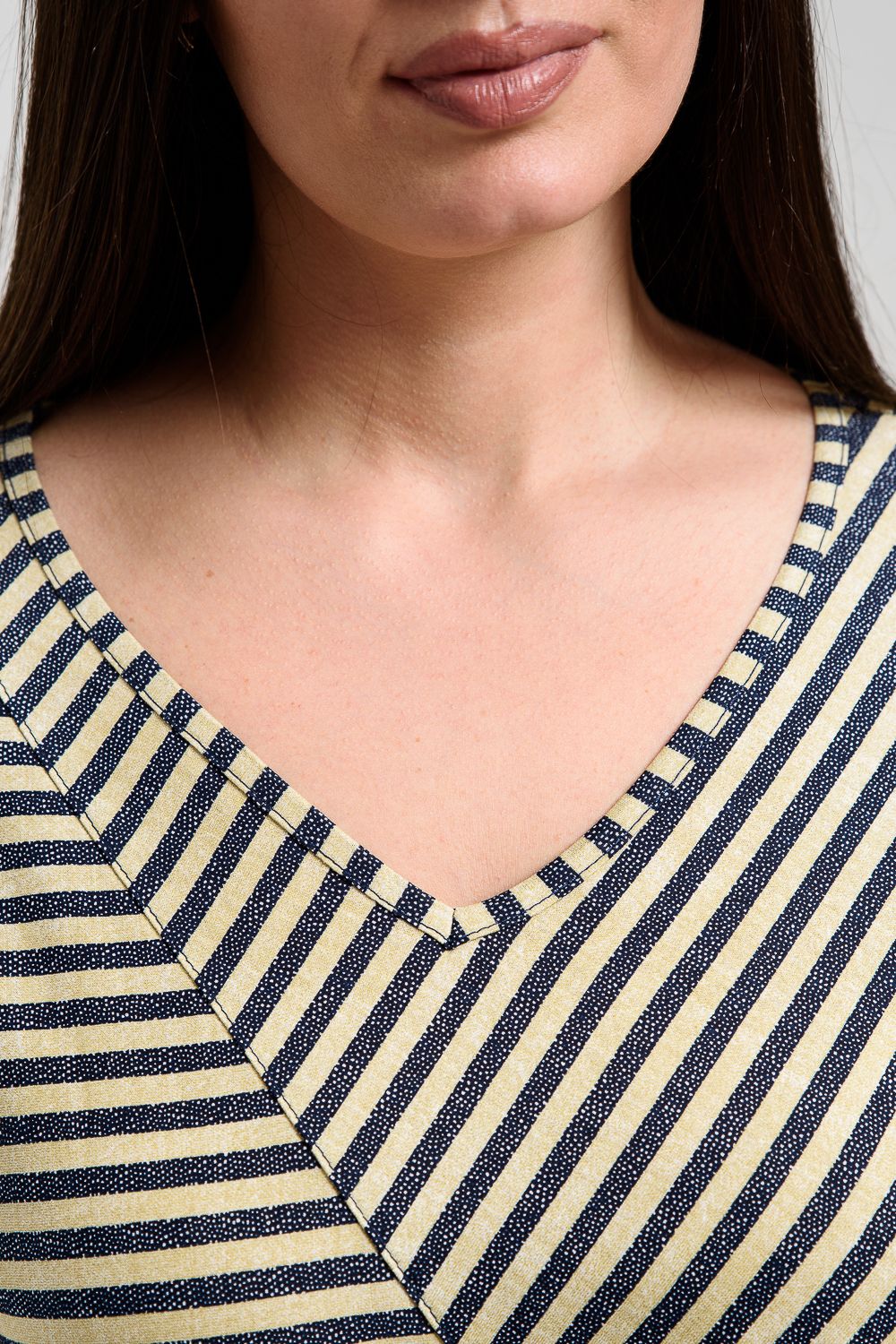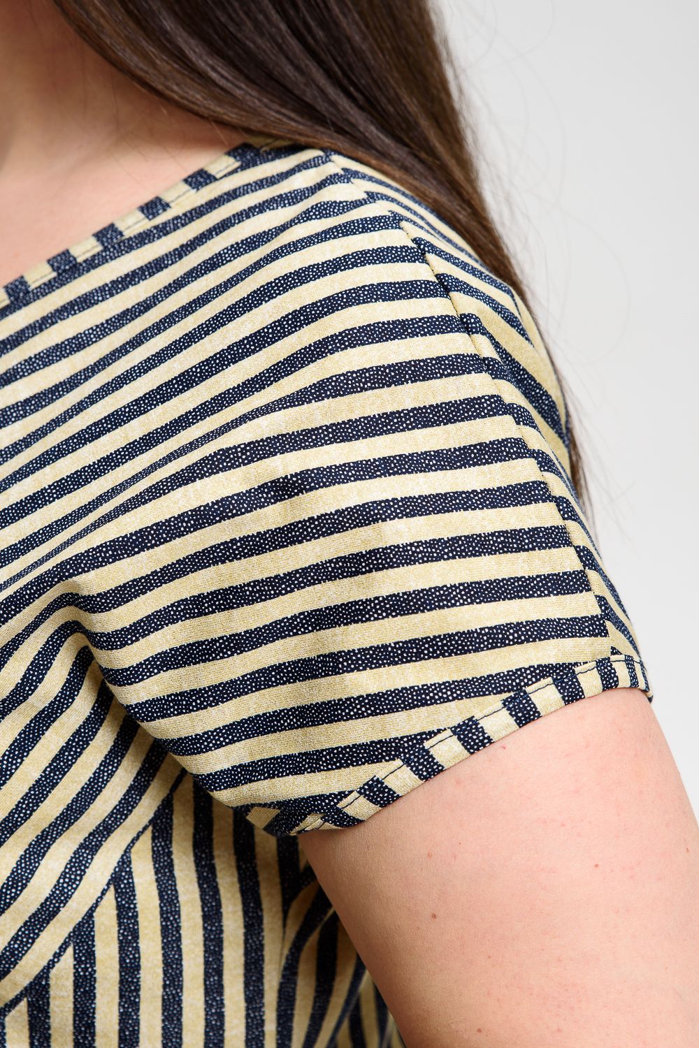 Платье прямого силуэта, с V-образной горловиной, с фигурной линией низа, с удлиненной спинкой, с карманами в боковых швах. Рукав цельнокроеный, короткий. Горловина и проймы обработаны бейкой из основного полотна.