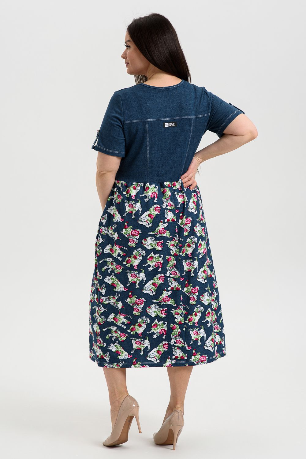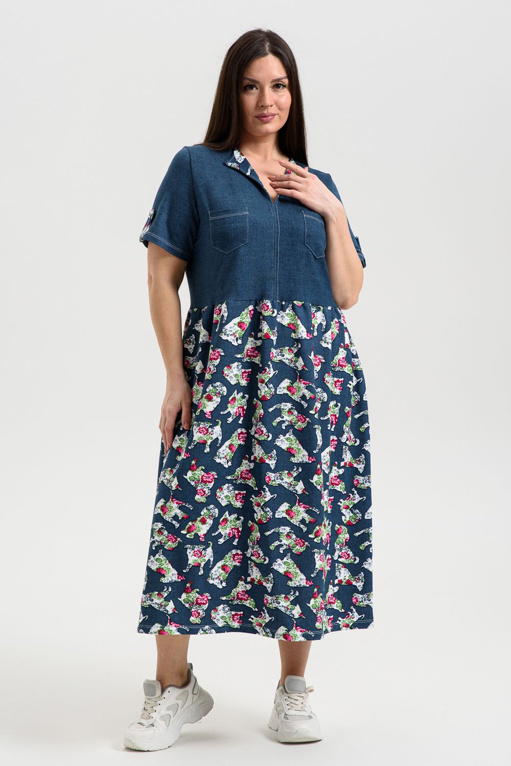 Фасон платья позволяет легко скрыть недостатки фигуры и при этом элегантно выглядеть! Платье отрезное по линии талии, с боковыми карманами, длиной ниже колена, юбка из отделочного полотна со сборкой по линии талии. Полочка с V-образной горловиной и отложным воротником, с накладными карманами. Спинка с кокеткой и вертикальными рельефами. Рукав втачной, короткий, с патой и пуговицей. Горловина спинки обработана бейкой из основного полотна.