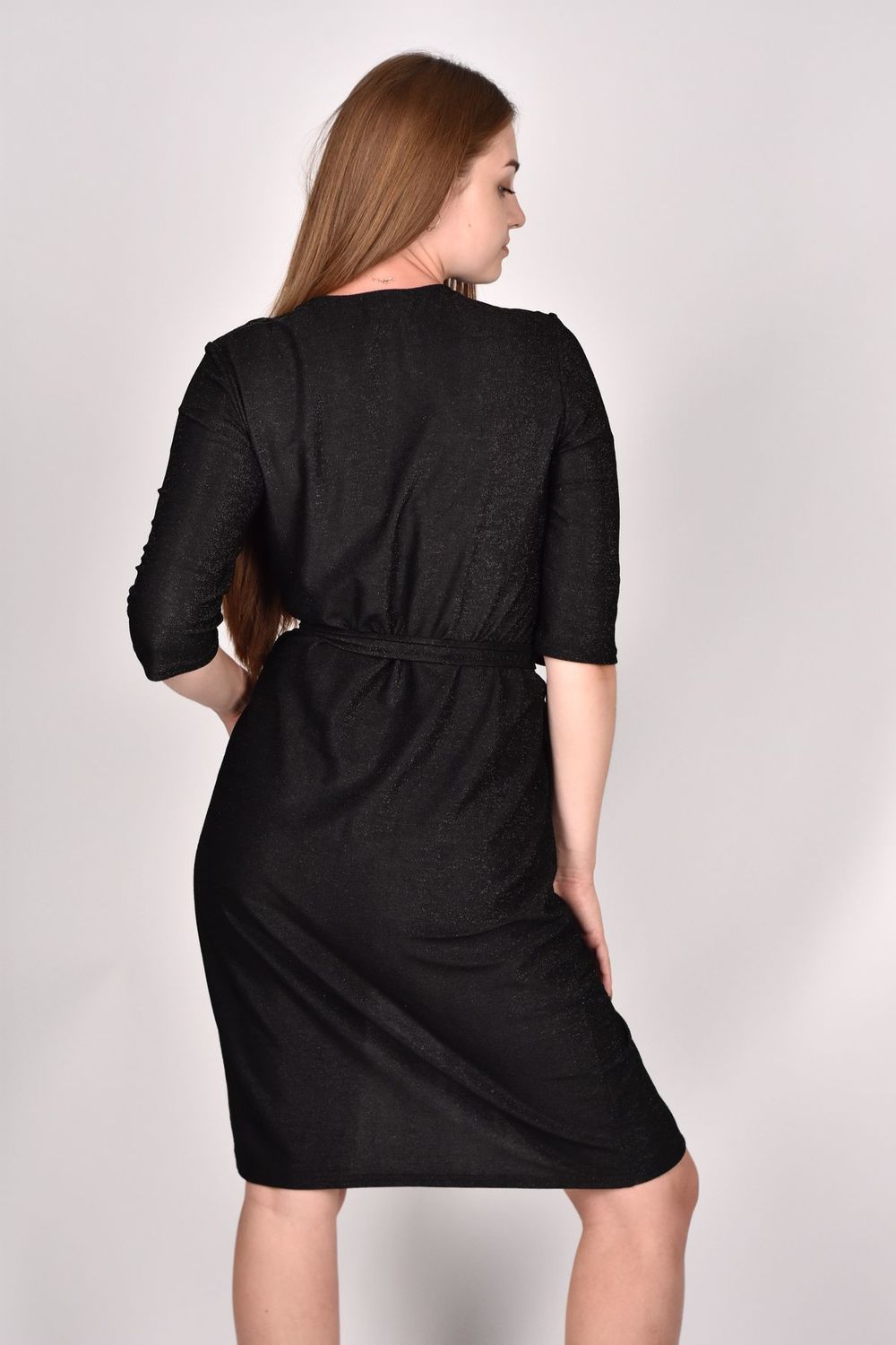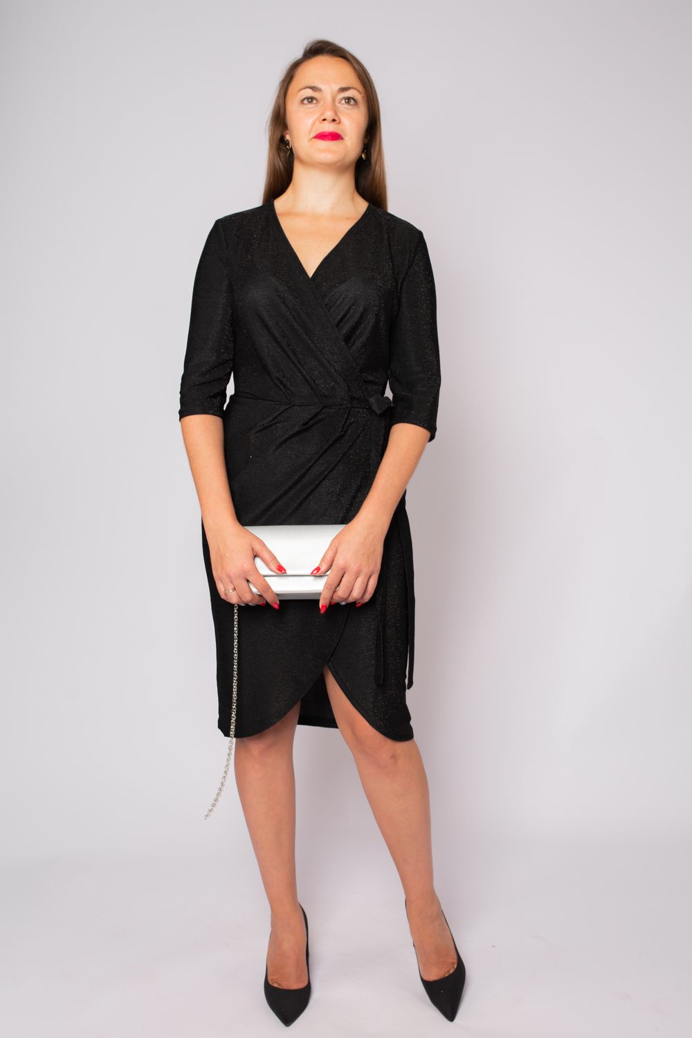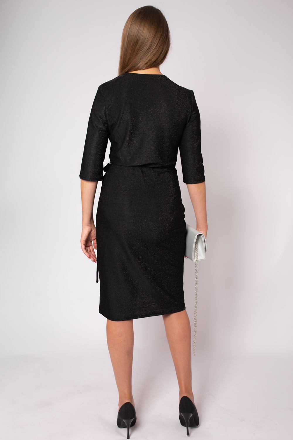 Красивое эффектное платье выполнено из блестящего материала с люрексом. Приталенный фасон на запах и глубокое декольте на груди подчеркнёт естественную красоту и зрительно сделает фигуру более женственной и элегантной. Модель прямого кроя с V образным вырезом и завязками на талии представлена в длине миди до колена спереди и чуть ниже сзади. Однотонные светлые и темные расцветки: блестящее черное, серебристое - в любом вы будете роскошны и незабываемы. Модное стильное длинное платье халат подчеркивает силуэт и скрывает недостатки. В нем вы будете чувствовать себя молодежно и сексуально, но в то же время нежно и мило. А классические рукава 3/4 добавляют слегка строгие нотки. Можно использовать для многих случаев, включая выпускной, день рождения, корпоративы.