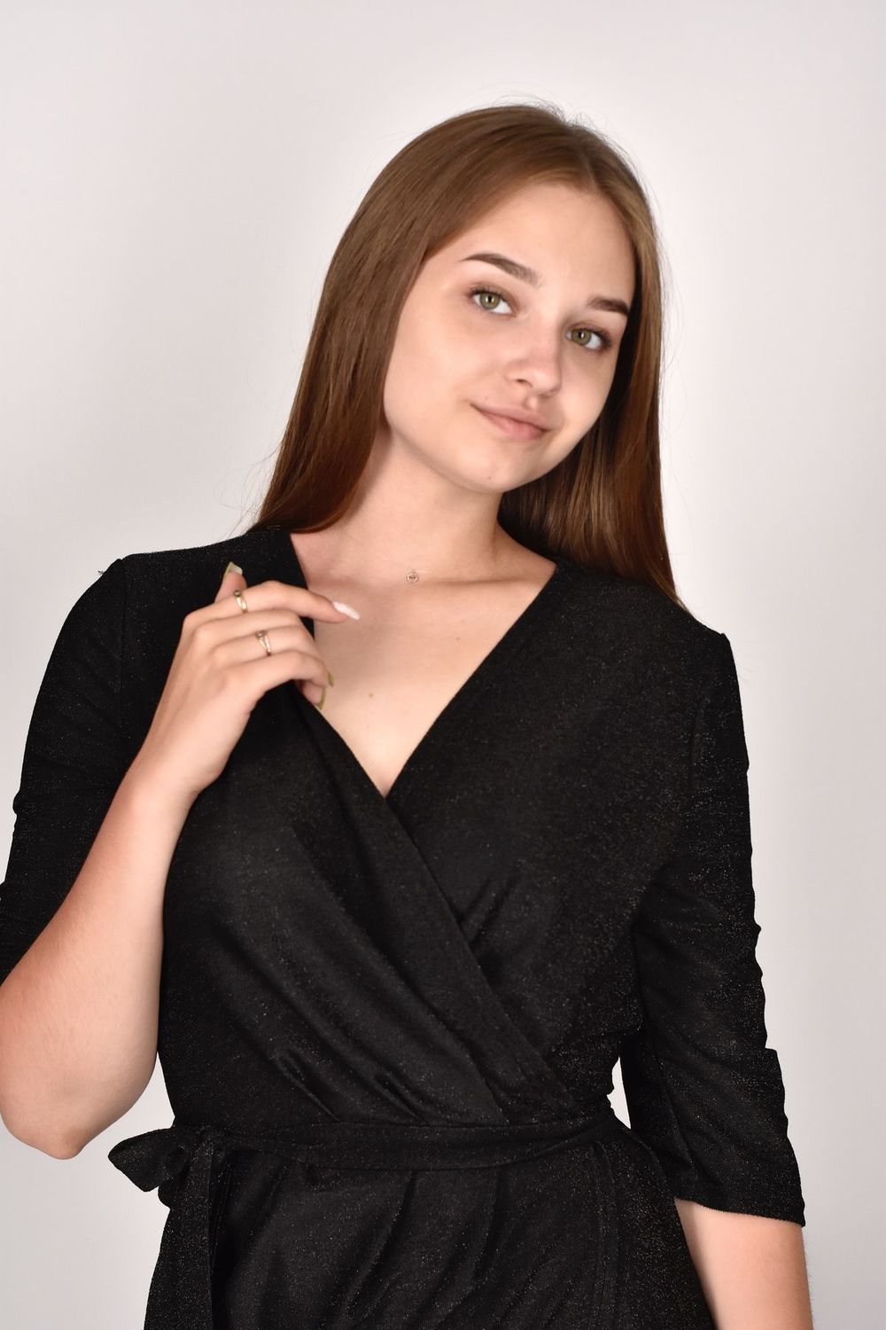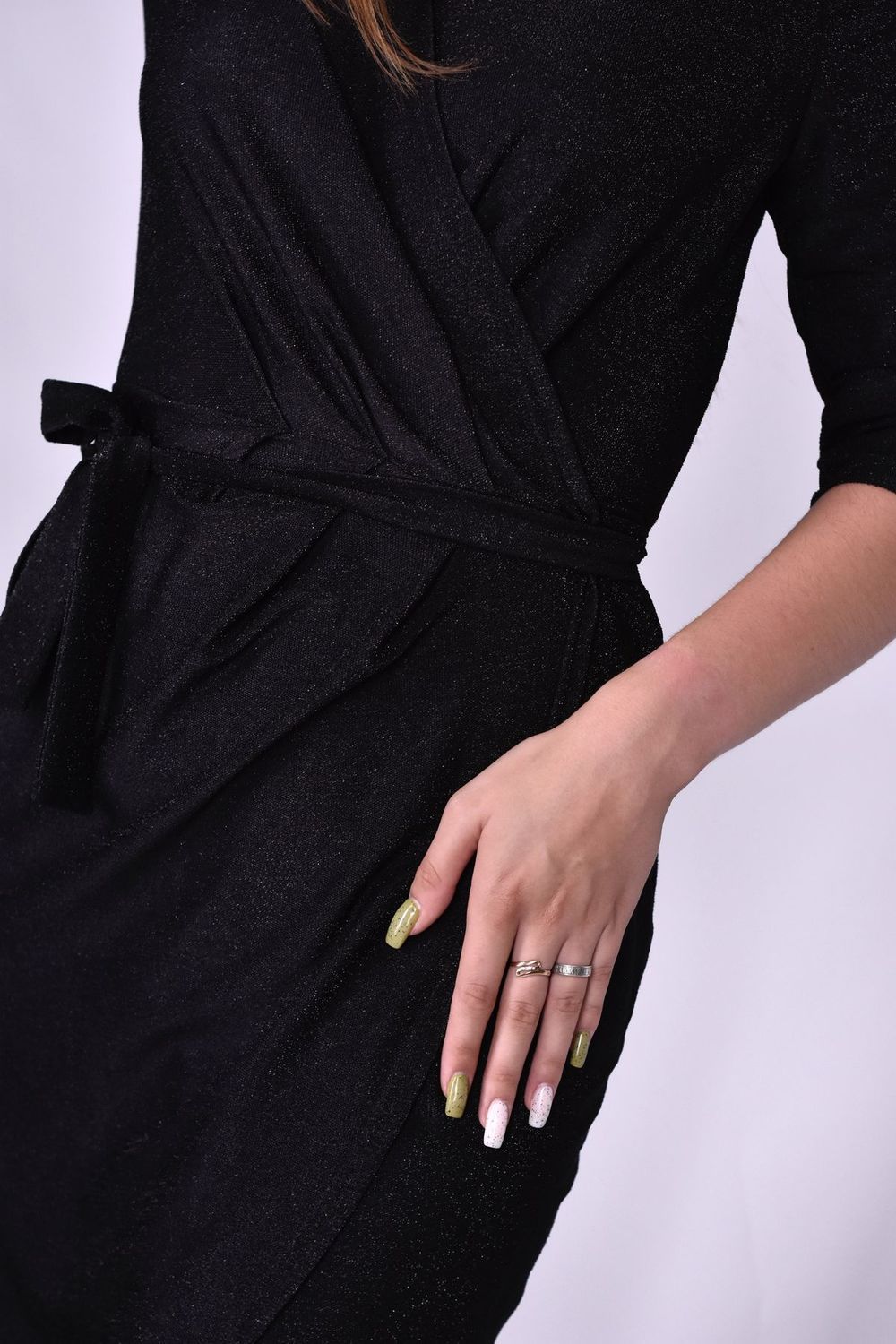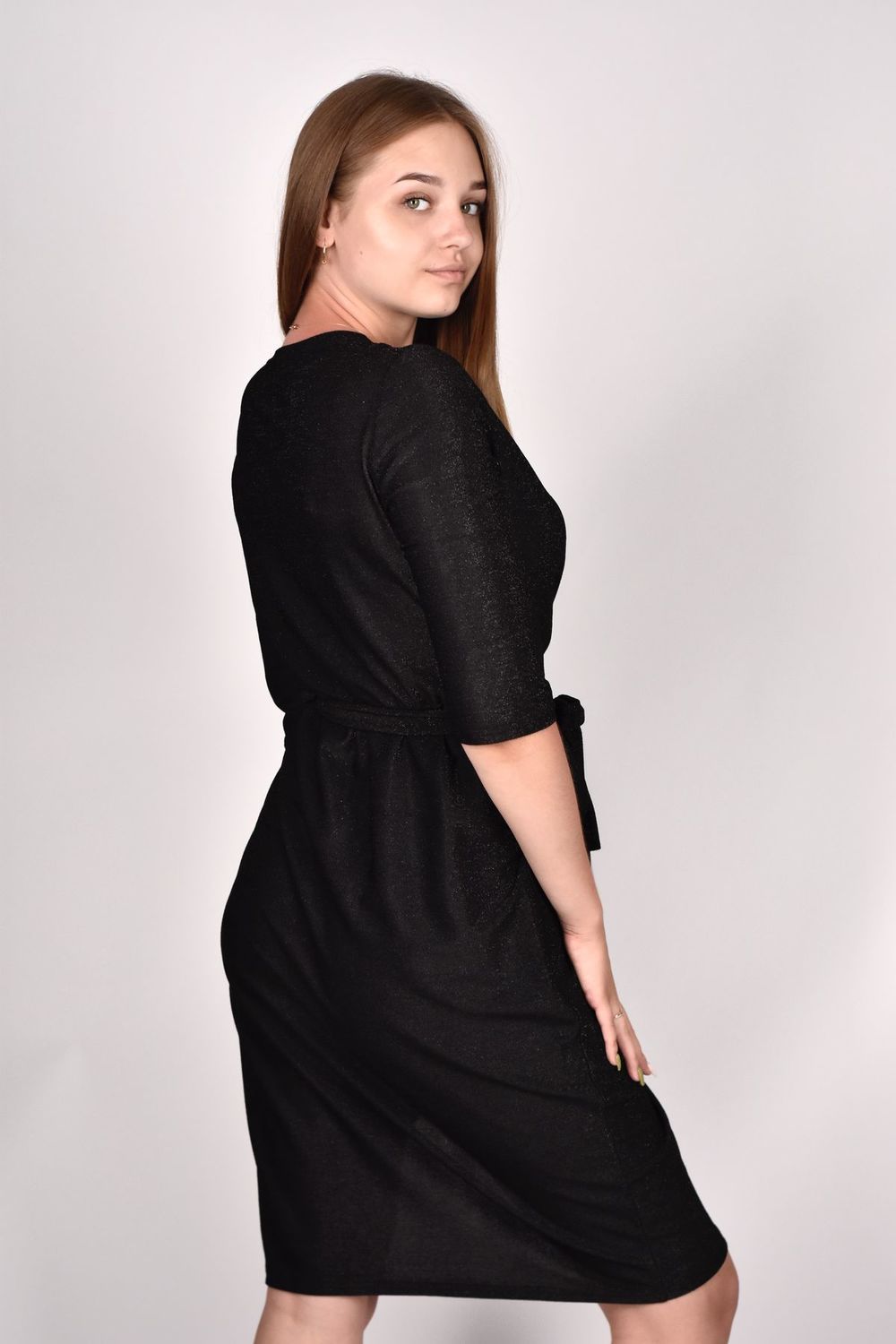 Красивое эффектное платье выполнено из блестящего материала с люрексом. Приталенный фасон на запах и глубокое декольте на груди подчеркнёт естественную красоту и зрительно сделает фигуру более женственной и элегантной. Модель прямого кроя с V образным вырезом и завязками на талии представлена в длине миди до колена спереди и чуть ниже сзади. Однотонные светлые и темные расцветки: блестящее черное, серебристое - в любом вы будете роскошны и незабываемы. Модное стильное длинное платье халат подчеркивает силуэт и скрывает недостатки. В нем вы будете чувствовать себя молодежно и сексуально, но в то же время нежно и мило. А классические рукава 3/4 добавляют слегка строгие нотки. Можно использовать для многих случаев, включая выпускной, день рождения, корпоративы.