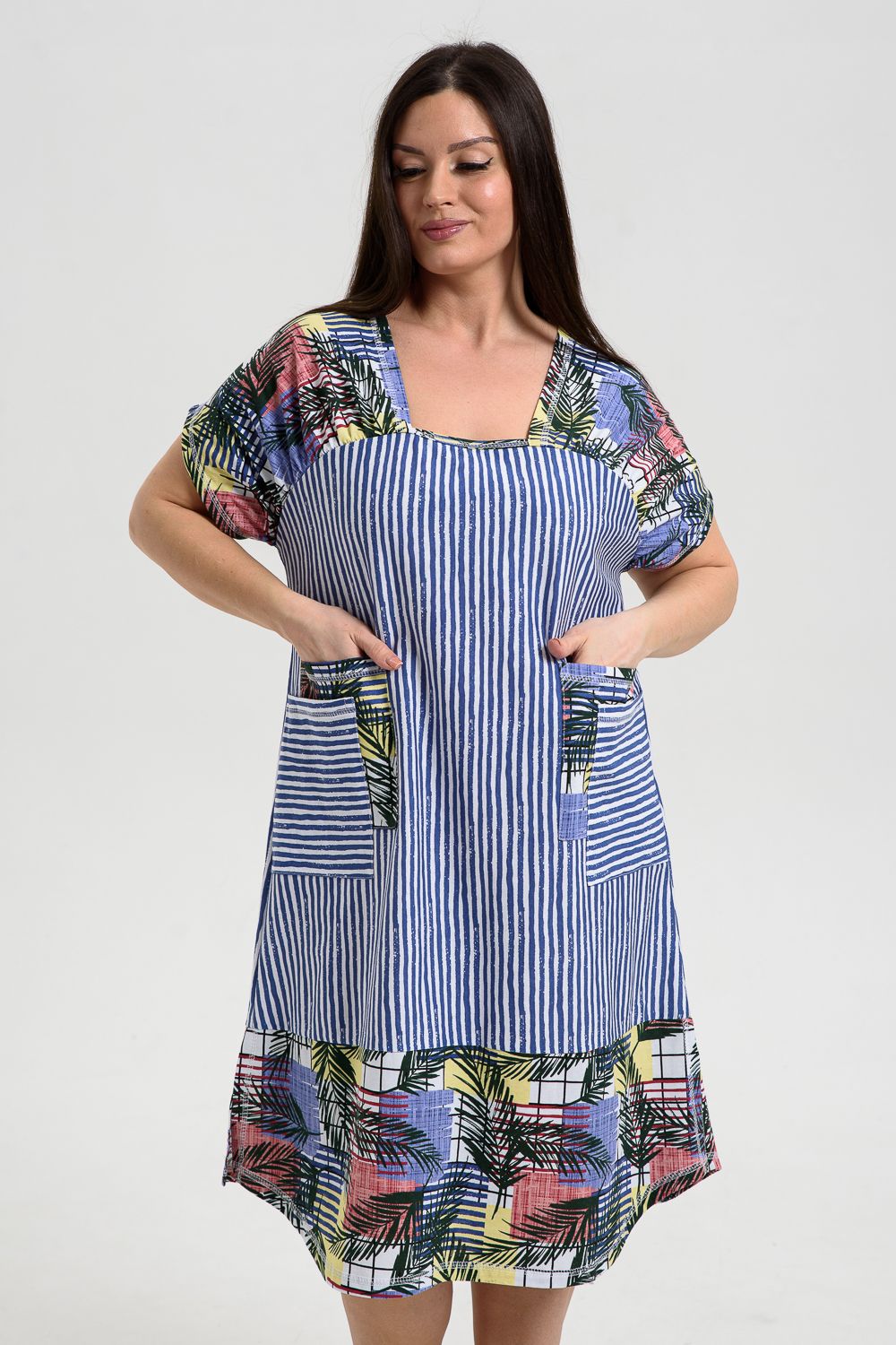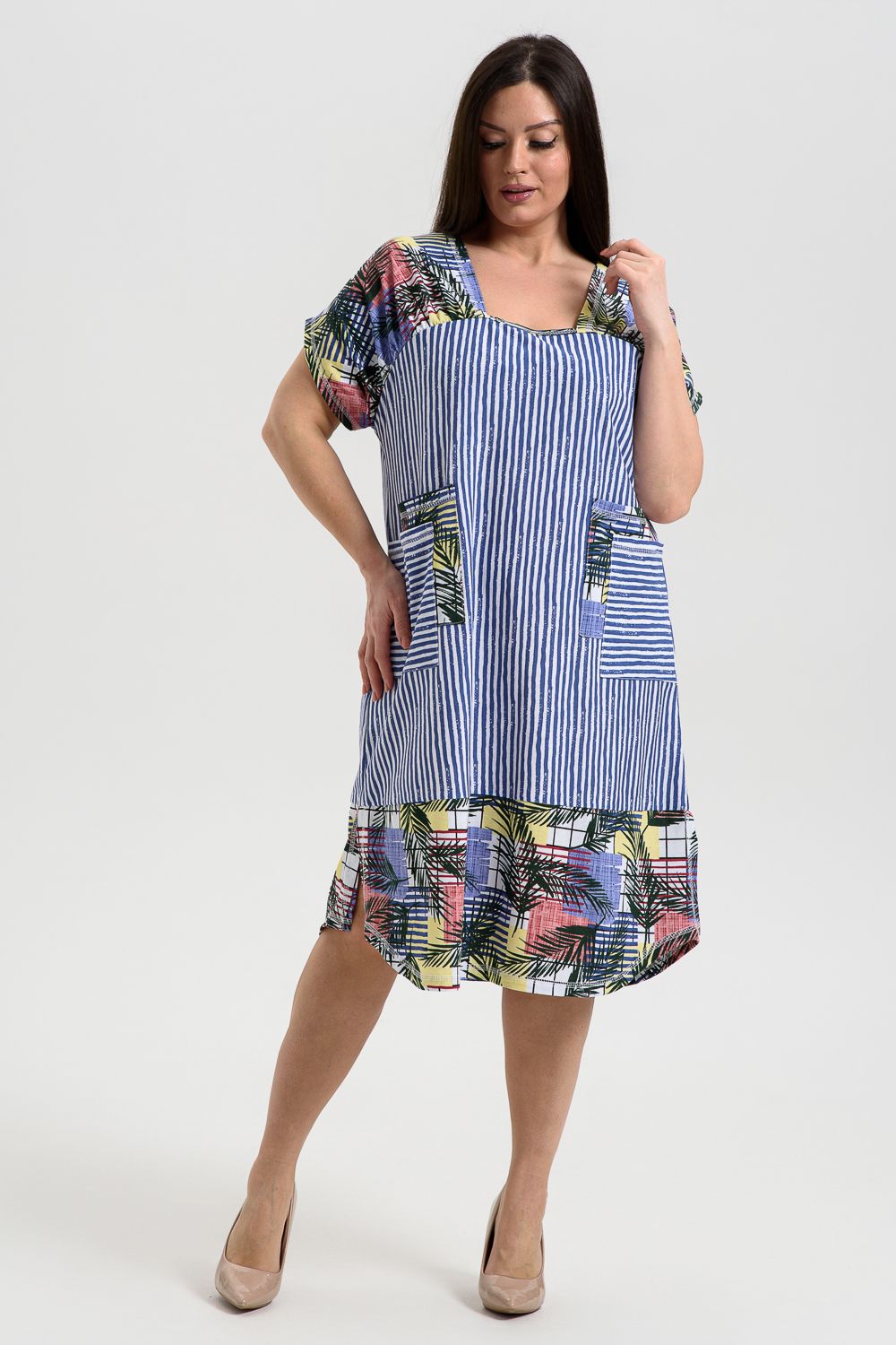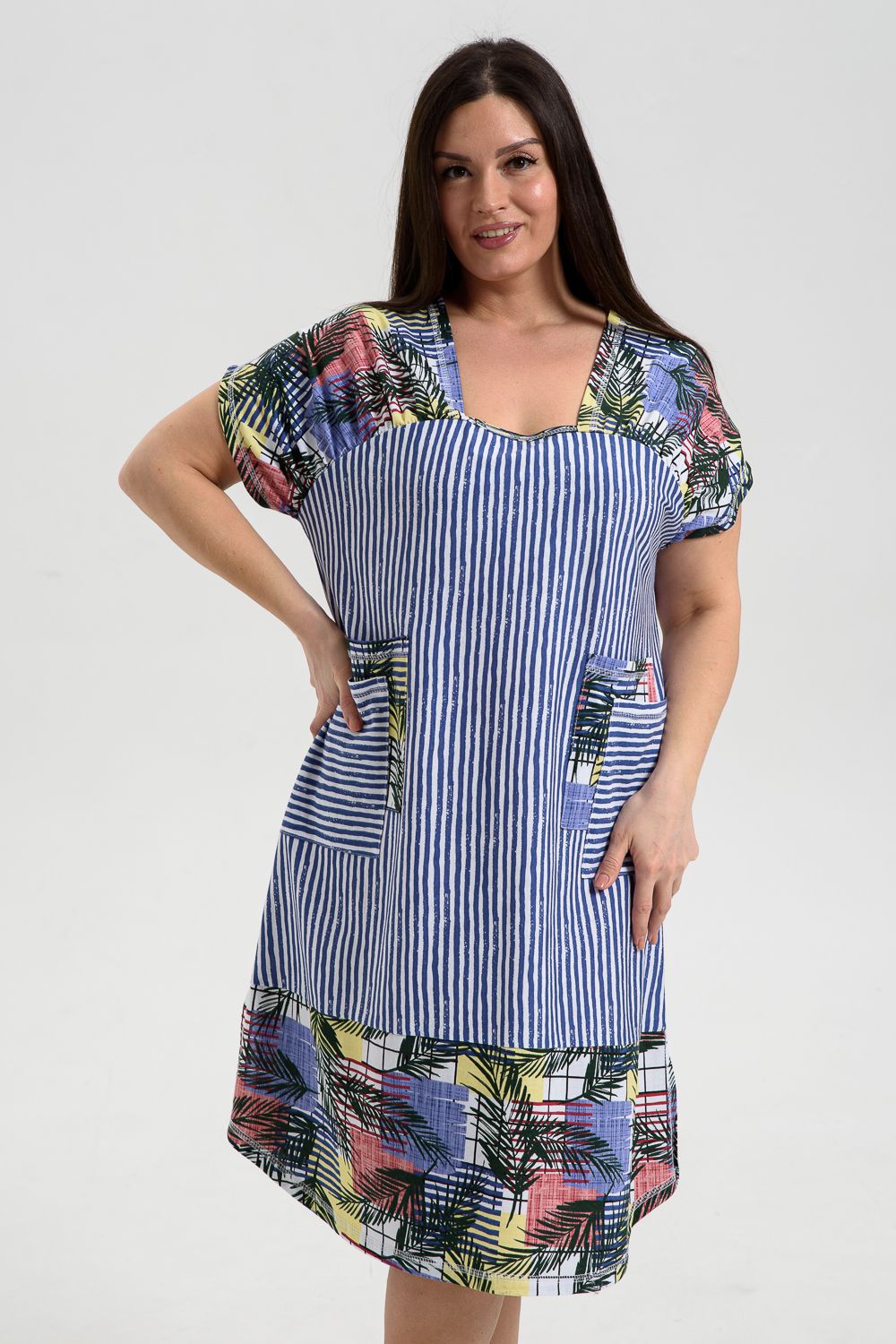 Платье женское полуприлегающего силуэта, слегка расширенное к низу. Кокетка полочки переходит в короткий цельнокроенный рукав, по шву притачивания кокетки к полочке кокетка присборена. Нижняя часть платья из отделочной ткани, сбоку разрезы. На полочке с каждой стороны по два накладных кармана, наложенных и смещенных друг относительно друга из основной ткани и ткани - компаньона. Все карманы функциональны. Свободный покрой и сочетание полосы с отделочной тканью придают платью достаточную комфортность и актуальность.