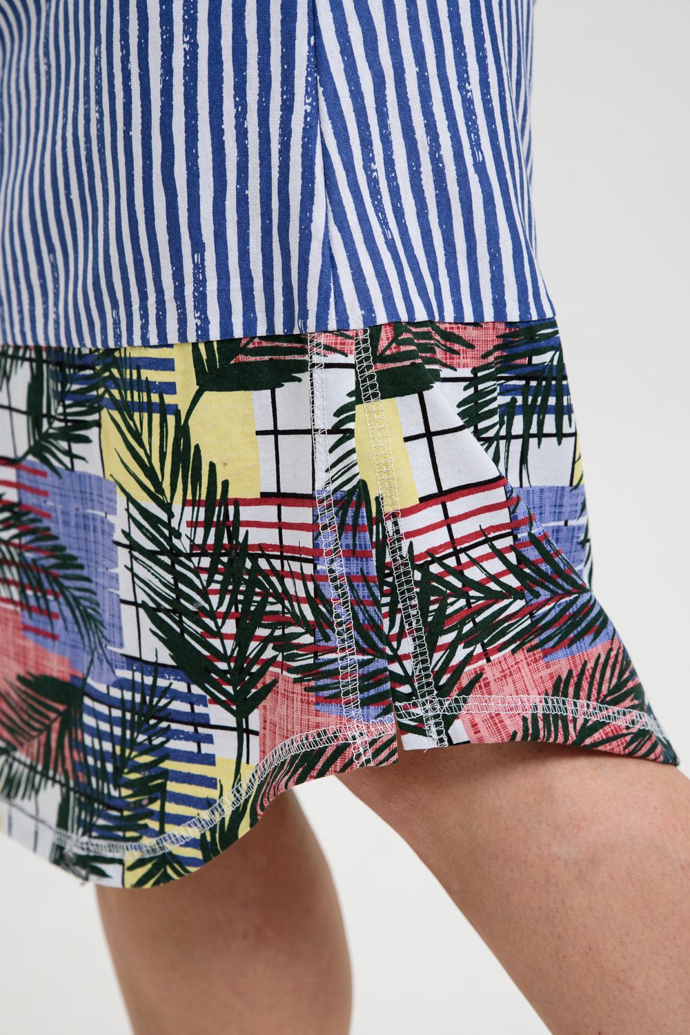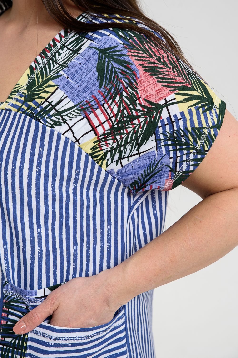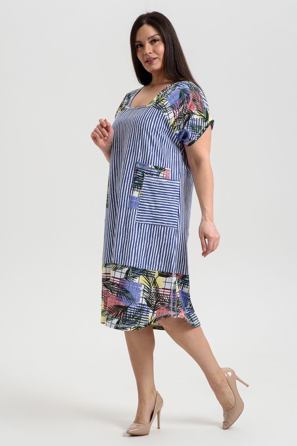 Платье женское полуприлегающего силуэта, слегка расширенное к низу. Кокетка полочки переходит в короткий цельнокроенный рукав, по шву притачивания кокетки к полочке кокетка присборена. Нижняя часть платья из отделочной ткани, сбоку разрезы. На полочке с каждой стороны по два накладных кармана, наложенных и смещенных друг относительно друга из основной ткани и ткани - компаньона. Все карманы функциональны. Свободный покрой и сочетание полосы с отделочной тканью придают платью достаточную комфортность и актуальность.