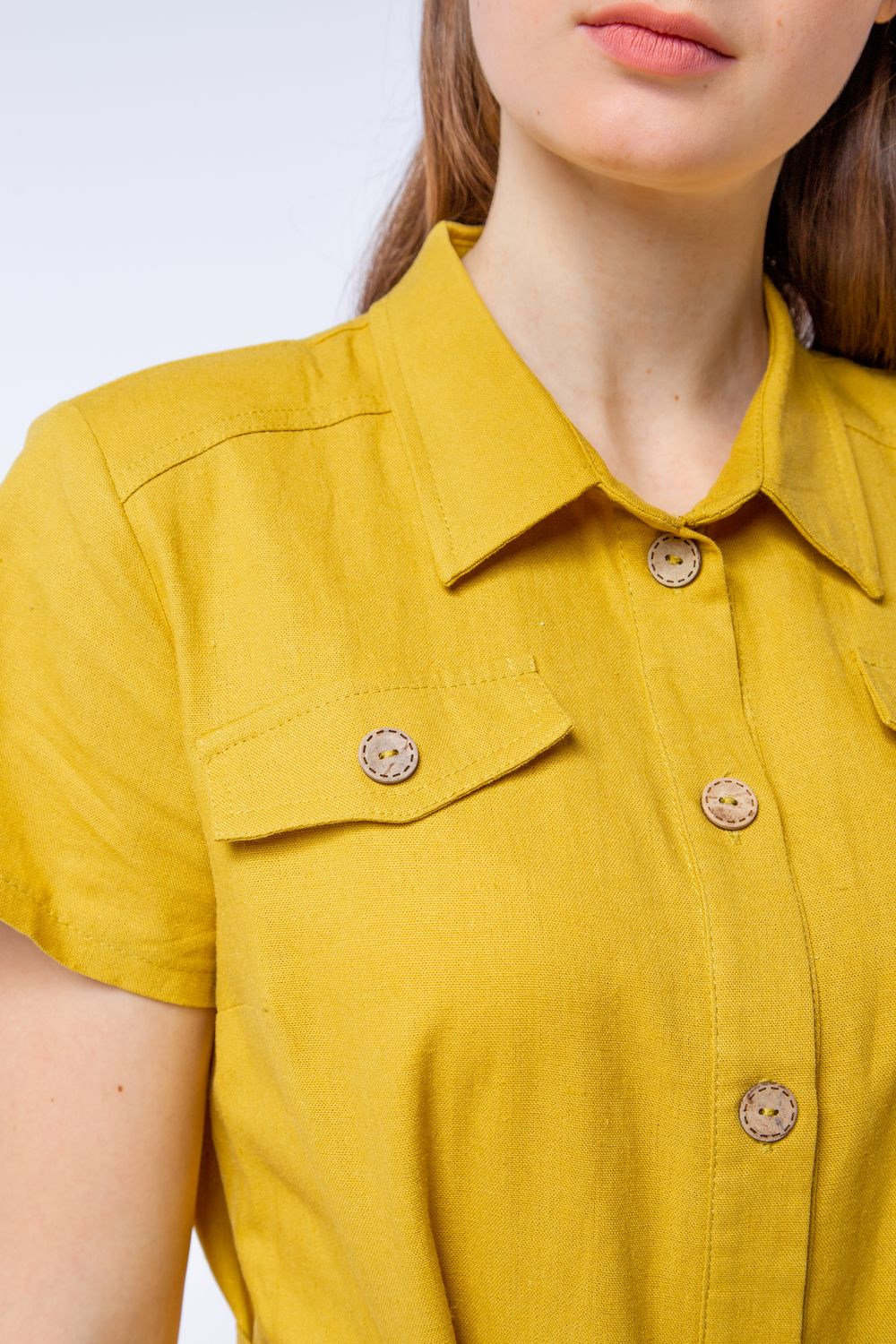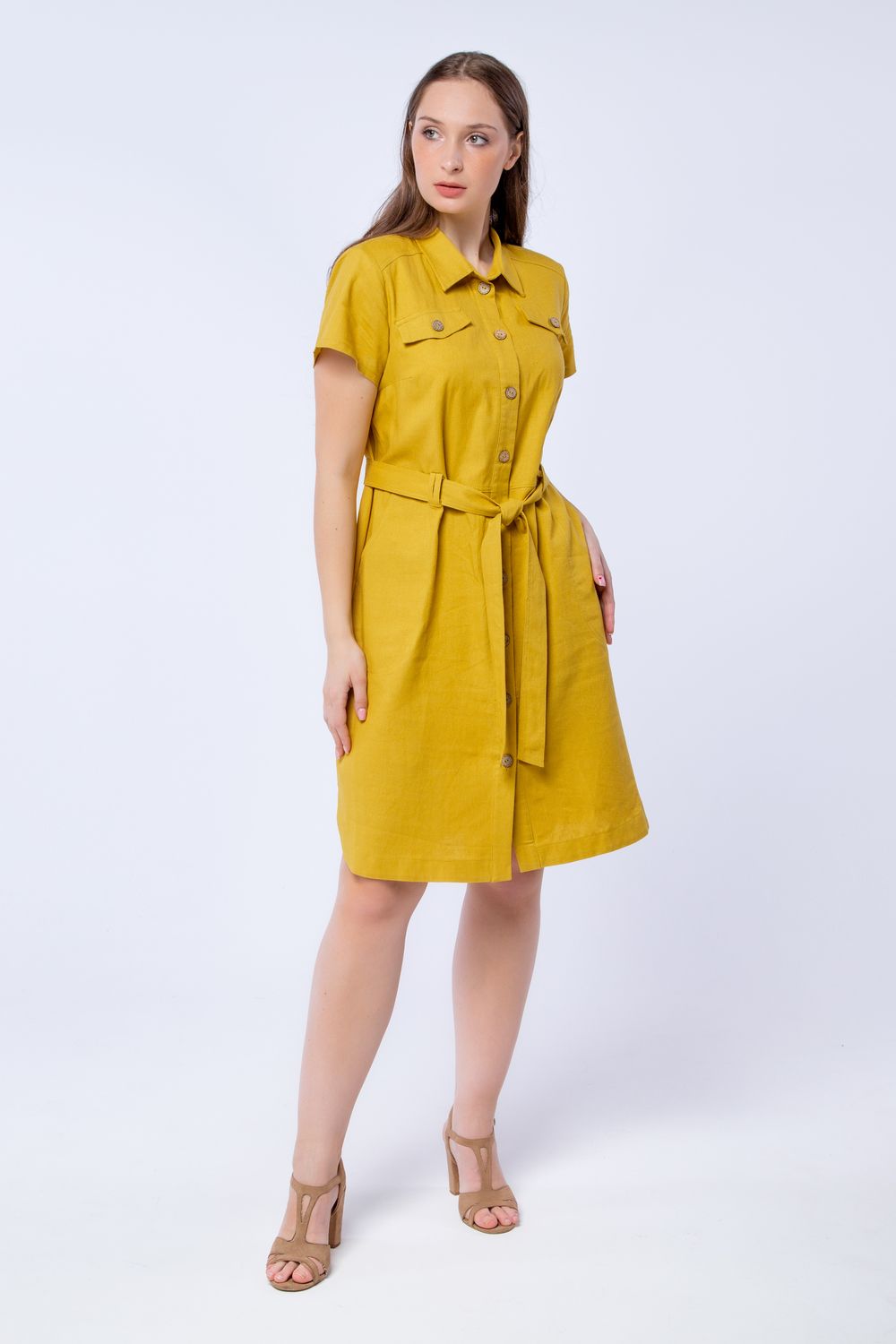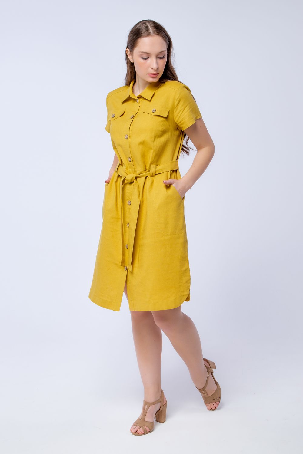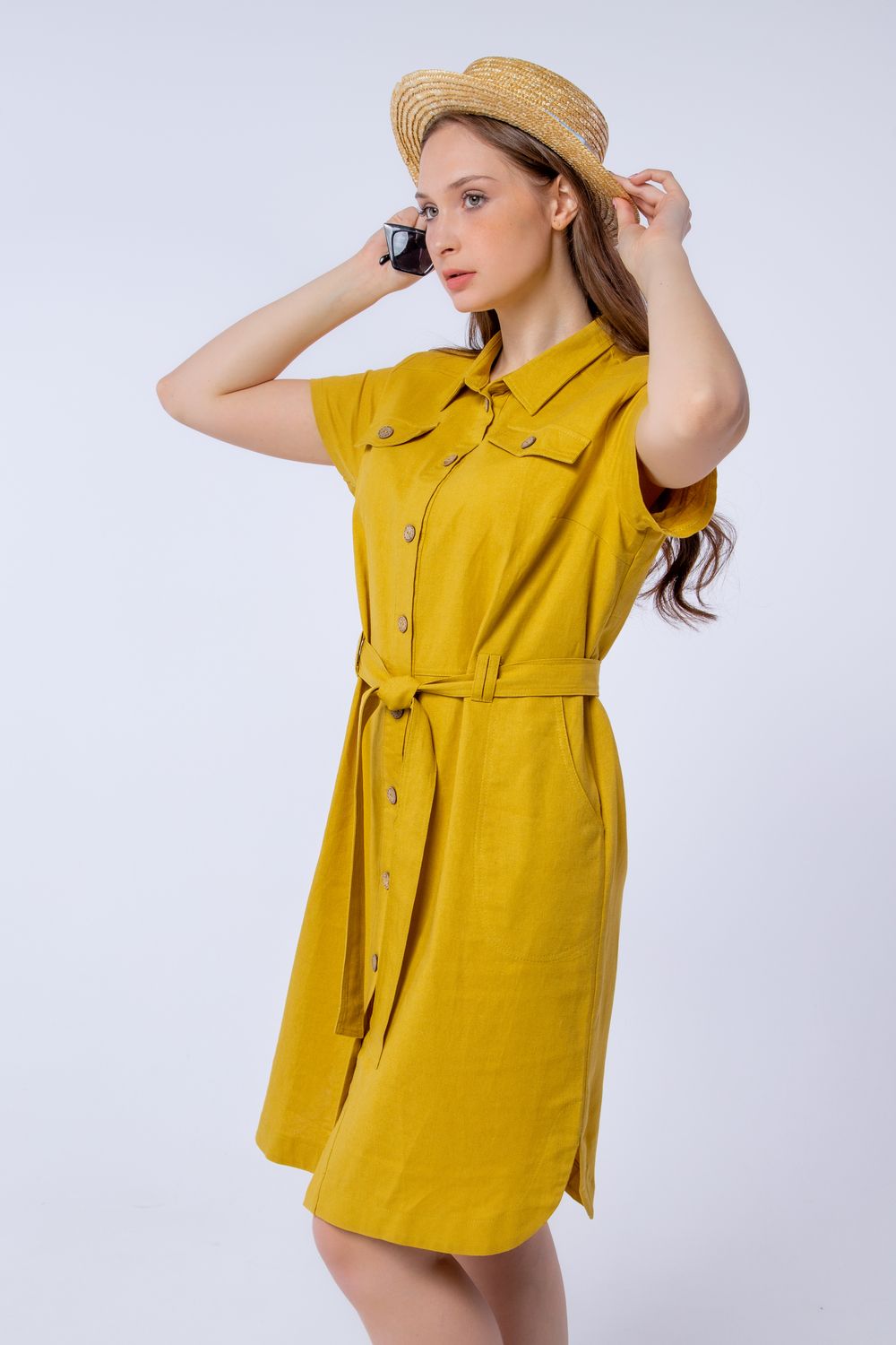 Женское платье в стиле "сафари" отличный вариант как для офиса, так и для летних прогулок. Центральная застёжка на пуговицах создать правильную вертикаль и вытянет силуэт, а пояс выгодно подчеркнёт изгибы фигуры. В изделии предусмотрены боковые карманы и плечики, которые при желании можно отпороть. Лён, из которого выполнено платье, является экологичным и дышащим материалом. Пуговицы из дерева отлично дополняют дизайн платья.