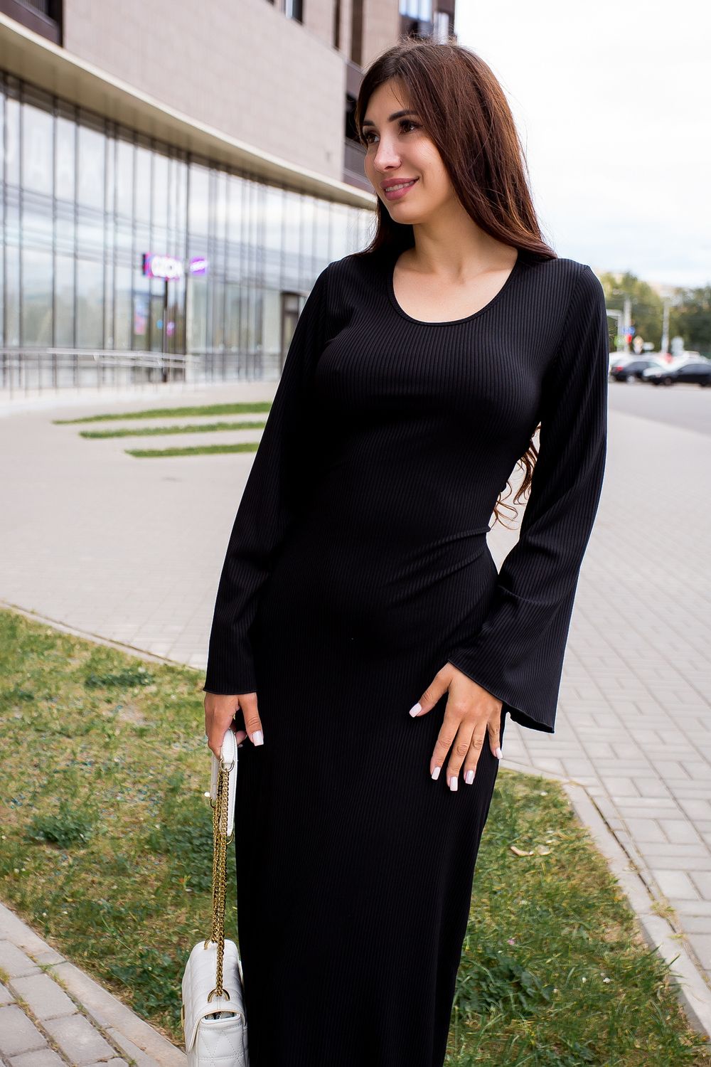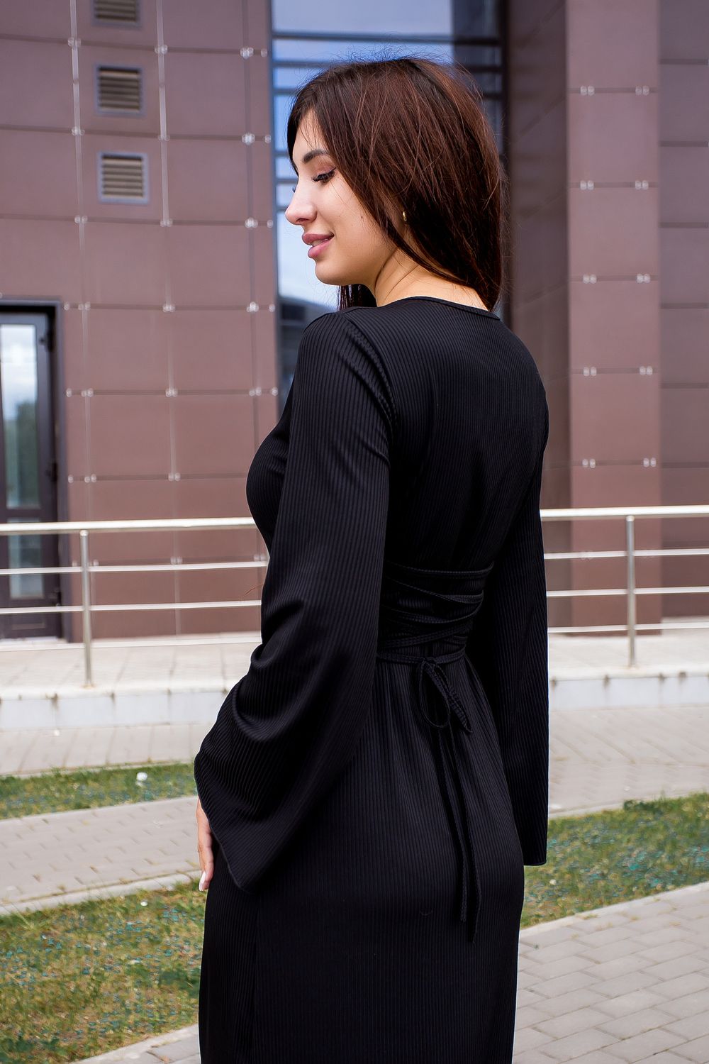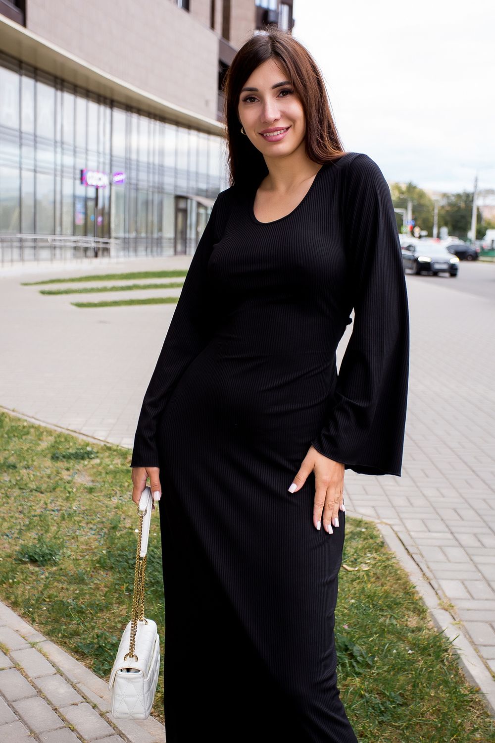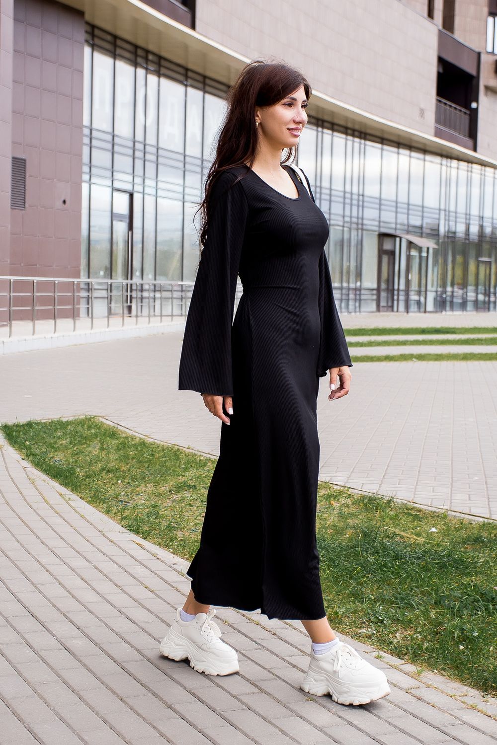 - Длинные расклешенные широкие рукава добавляют изысканности обтягивающему платью в рубчик и гармонично завершают композицию.