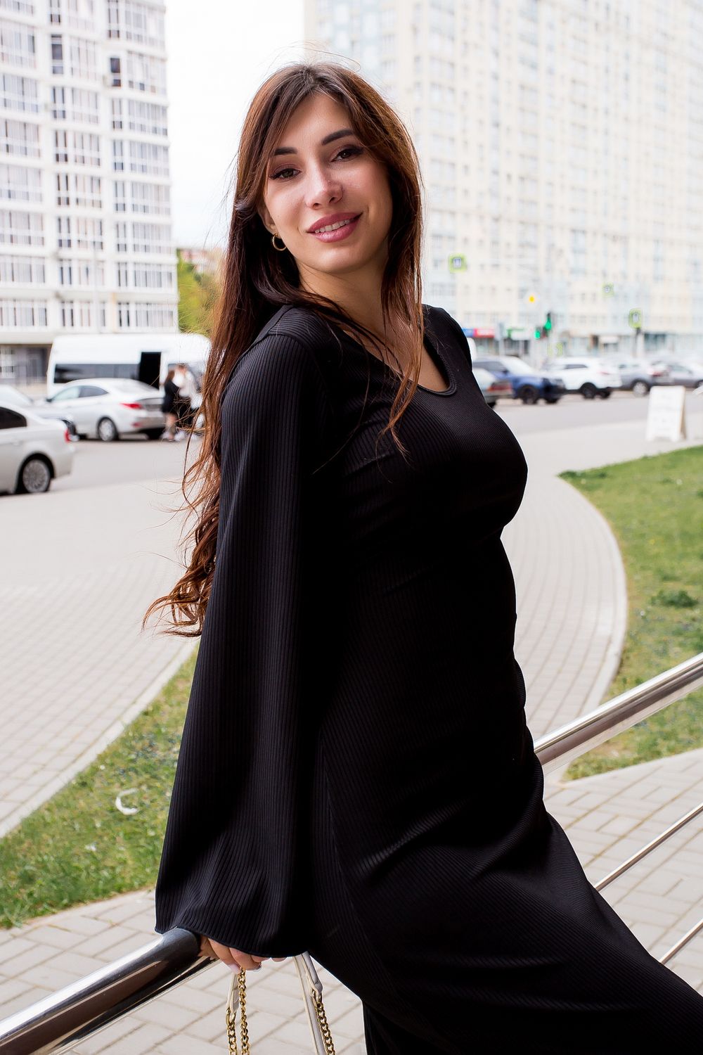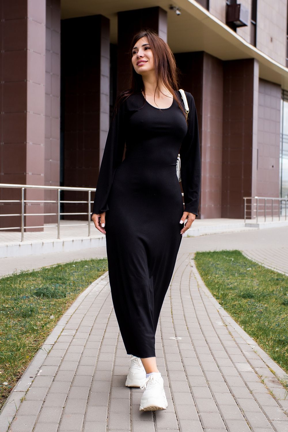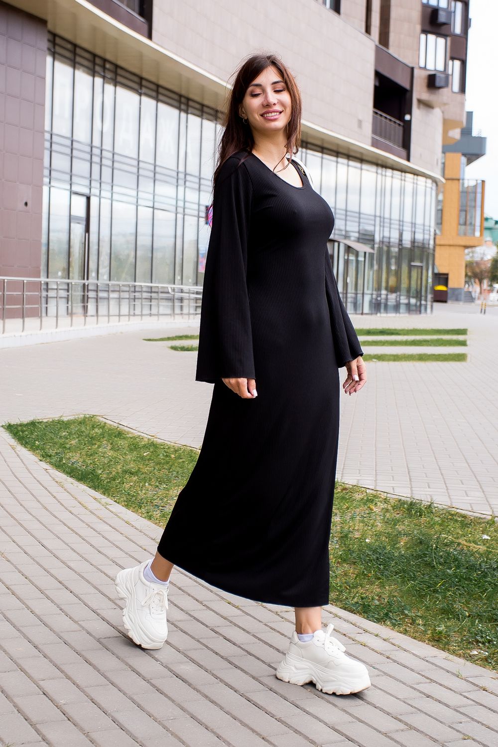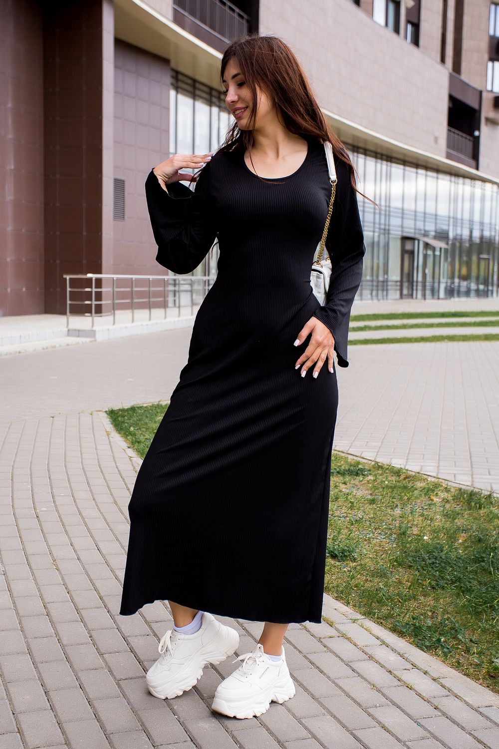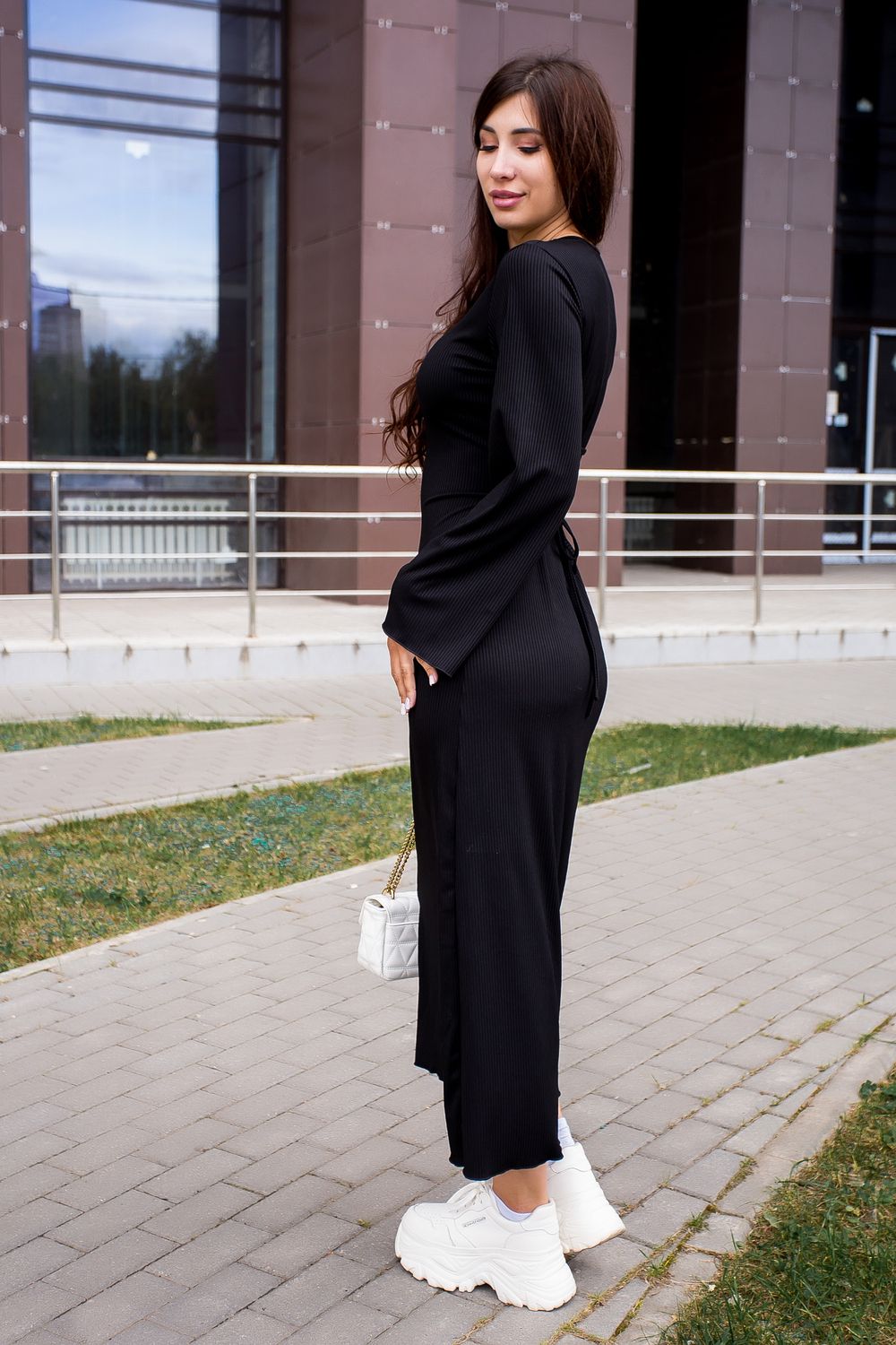 - Длинные расклешенные широкие рукава добавляют изысканности обтягивающему платью в рубчик и гармонично завершают композицию.