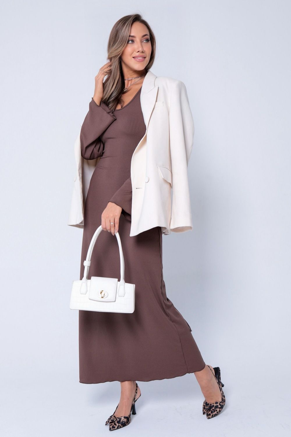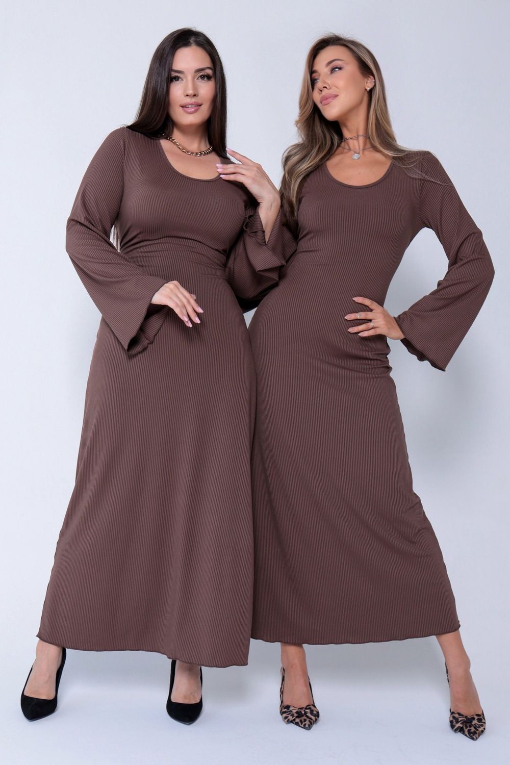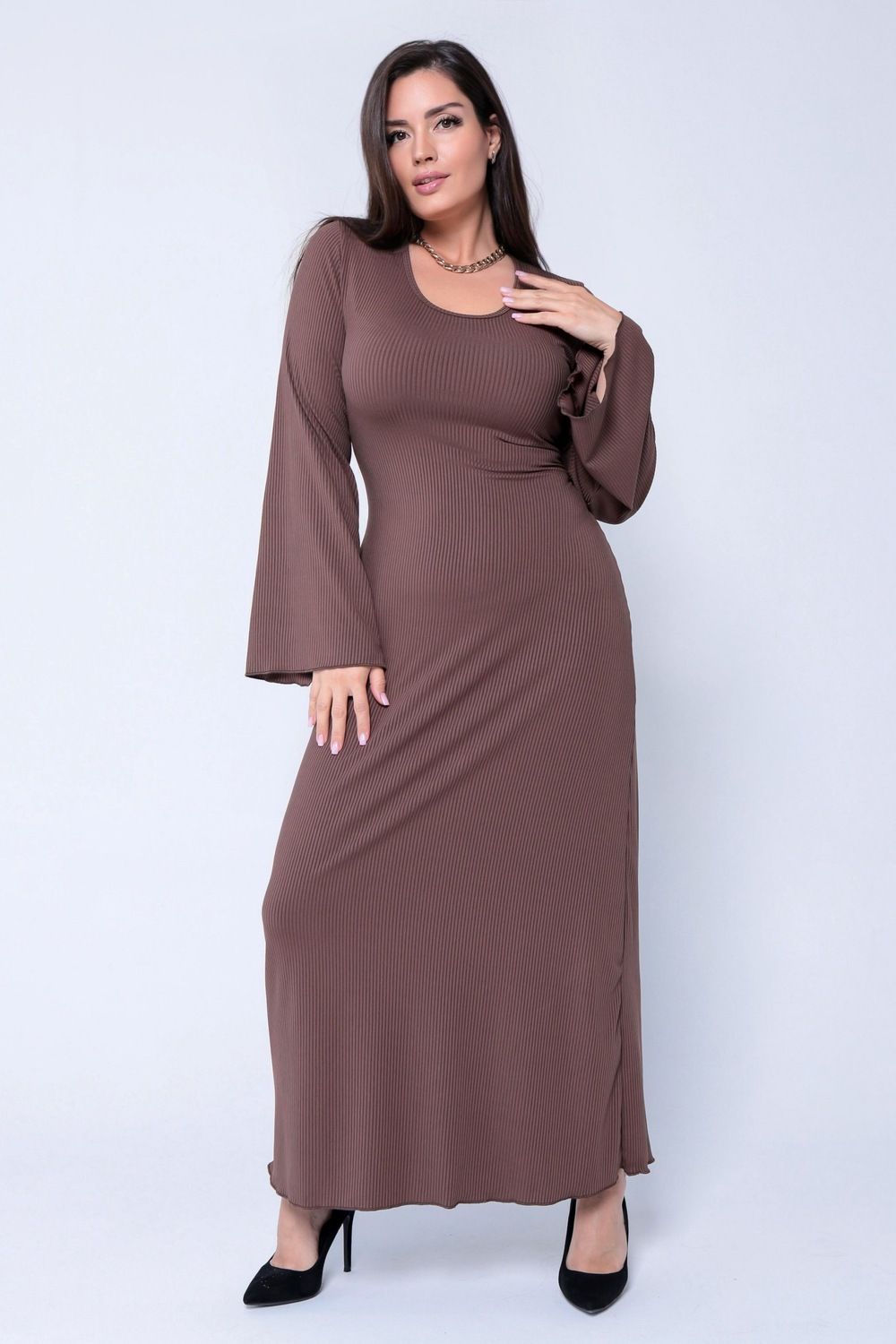 - Длинные расклешенные широкие рукава добавляют изысканности обтягивающему платью в рубчик и гармонично завершают композицию.