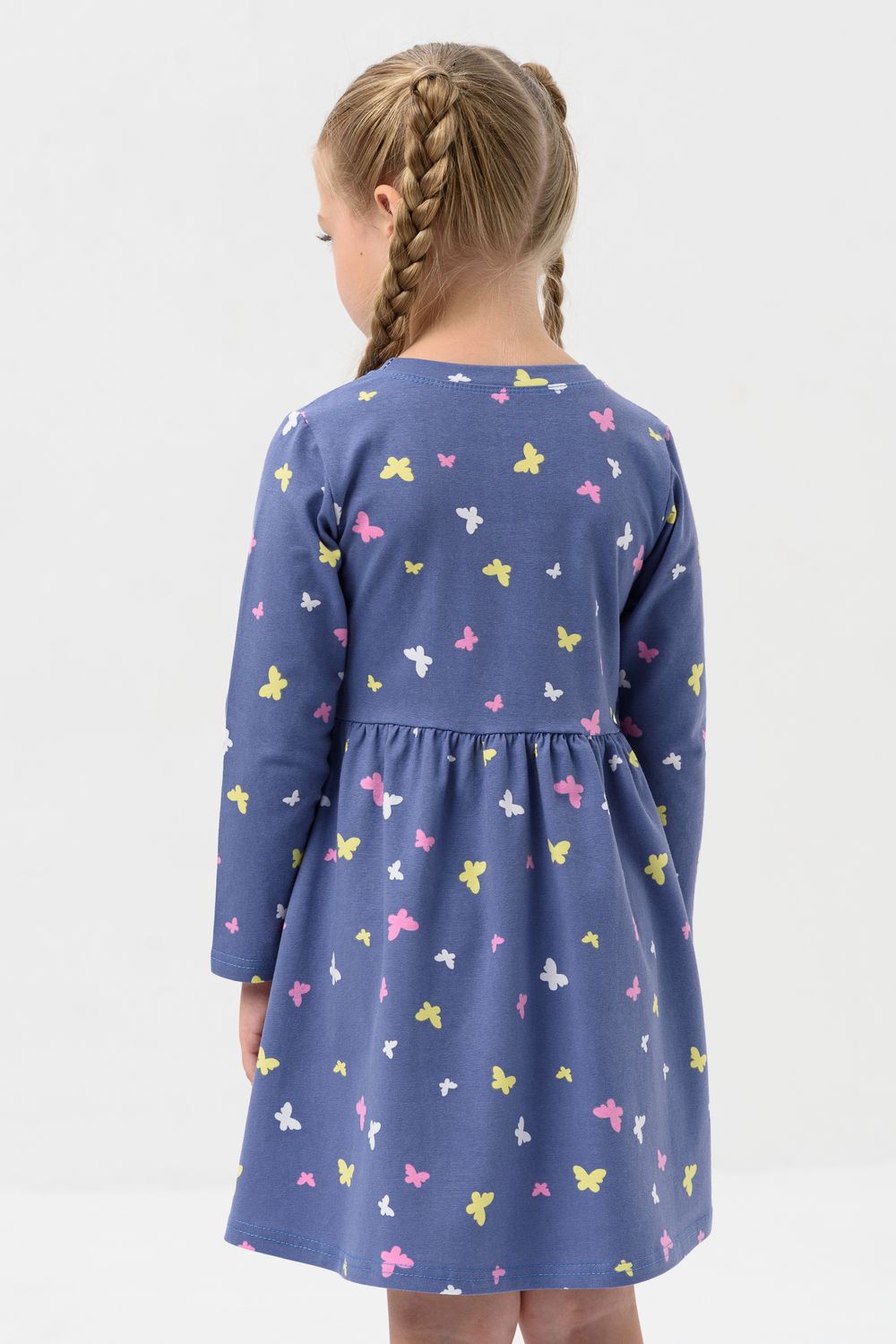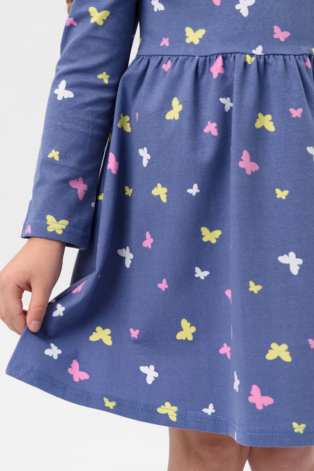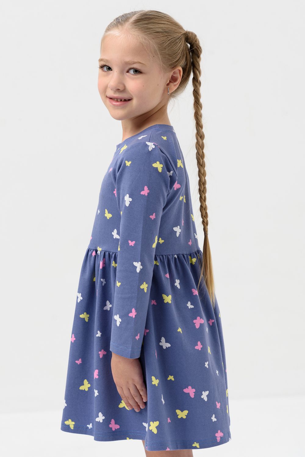 Платье для девочек дошкольного и младшего школьного возраста, из трикотажного полотна кулирка с лайкрой с рисунком. Платье прилегающего силуэта, отрезное и расклешенное от линии талии, с втачным длинным одношовным рукавом, с обтачкой в горловине. Низа рукавов и нижней части платья подогнуты. По шву втачивания обтачки в горловину проложена отделочная строчка.