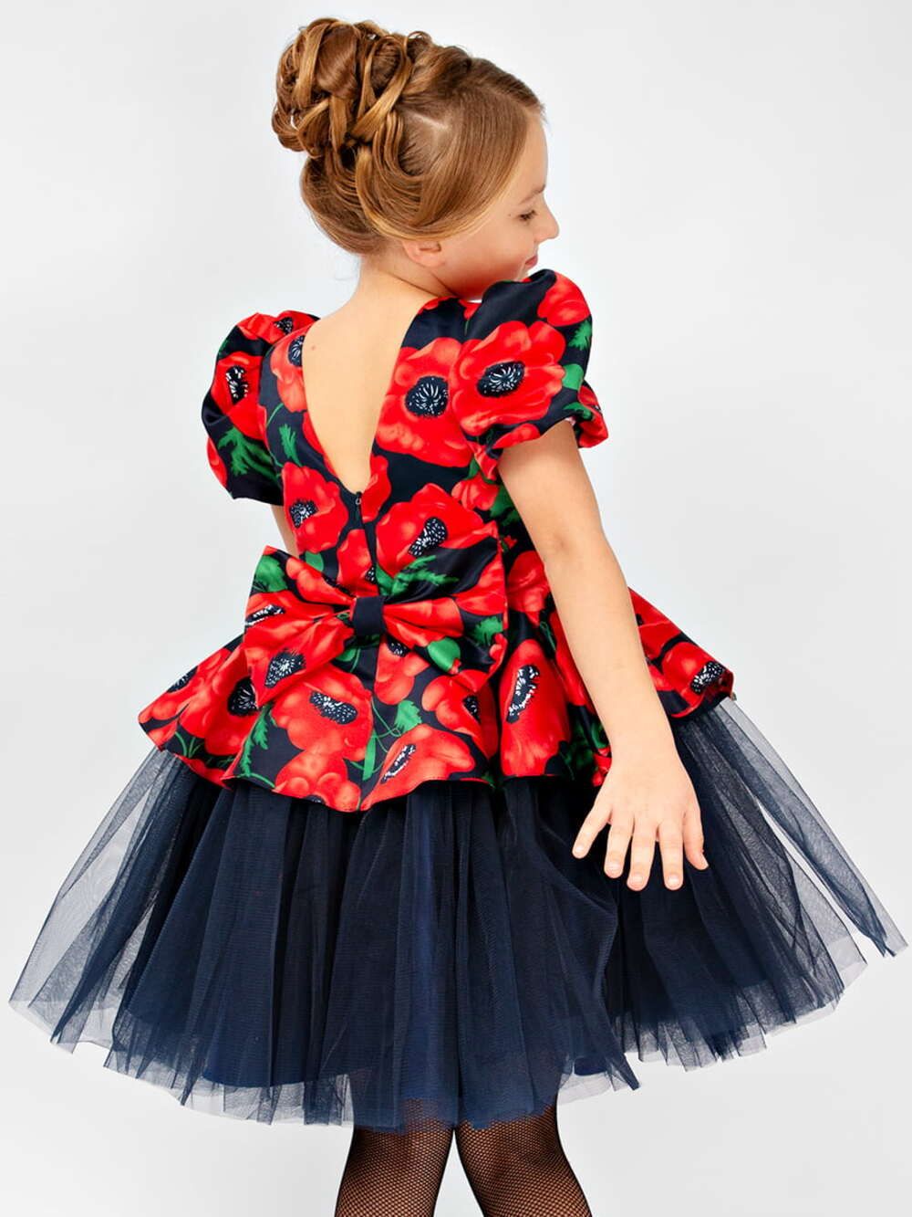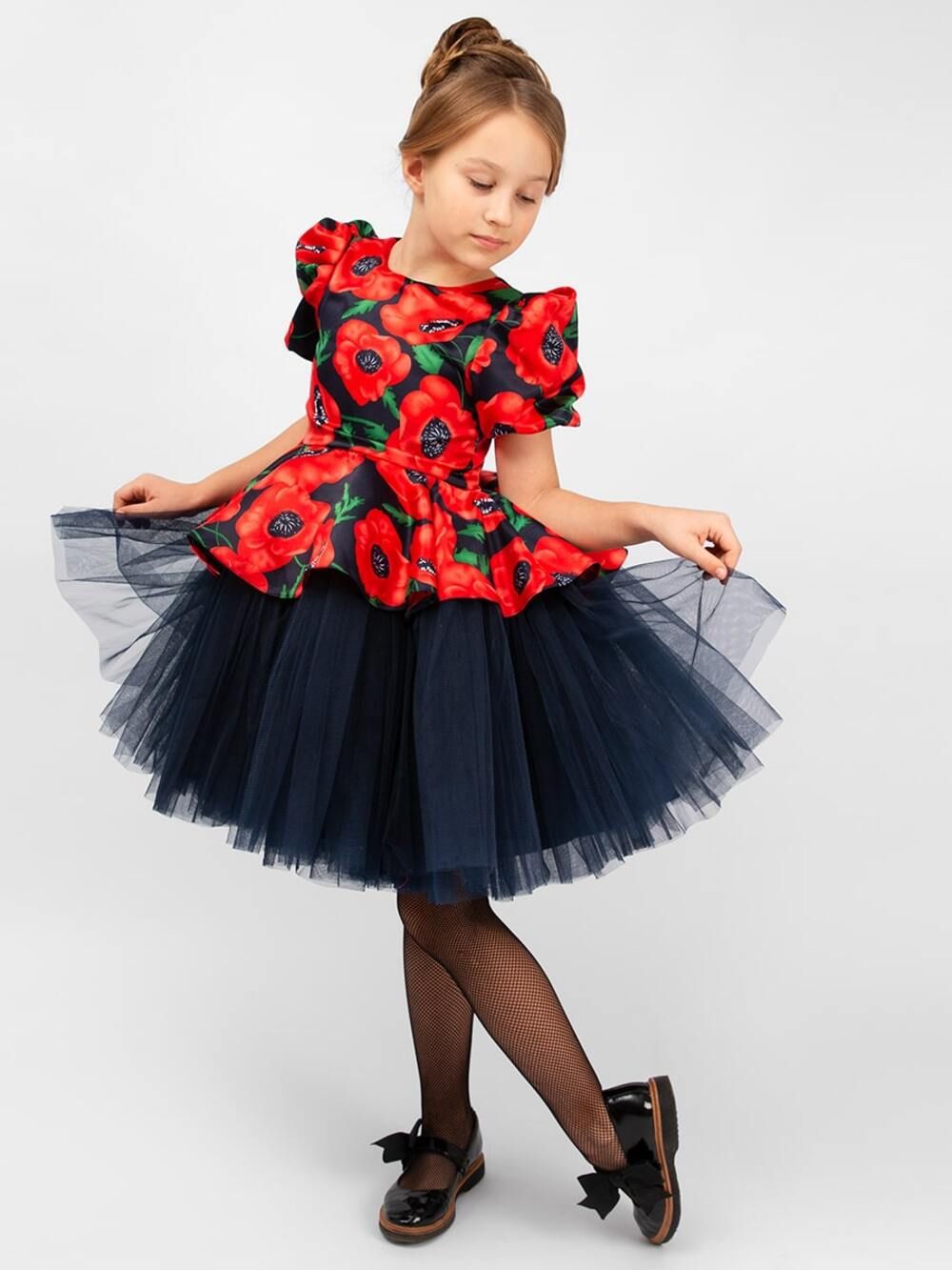 Платье для девочки Соль&Перец. Нарядное платье для девочки отличается особым шармом и элегантностью. Верх платья выполнен из качественной атласной ткани, которая обеспечивает комфорт и долговечность. Пышная и воздушная юбочка сделана из фатина с добавлением атласного подклада, что придаёт платью дополнительную легкость и объём. Платье застёгивается сзади на молнию, что позволяет быстро и легко одеть или снять его. Кроме того, платье дополнено съёмным бантом. Яркий принт на платье делает его идеальным выбором для праздников, торжеств и других особых случаев.