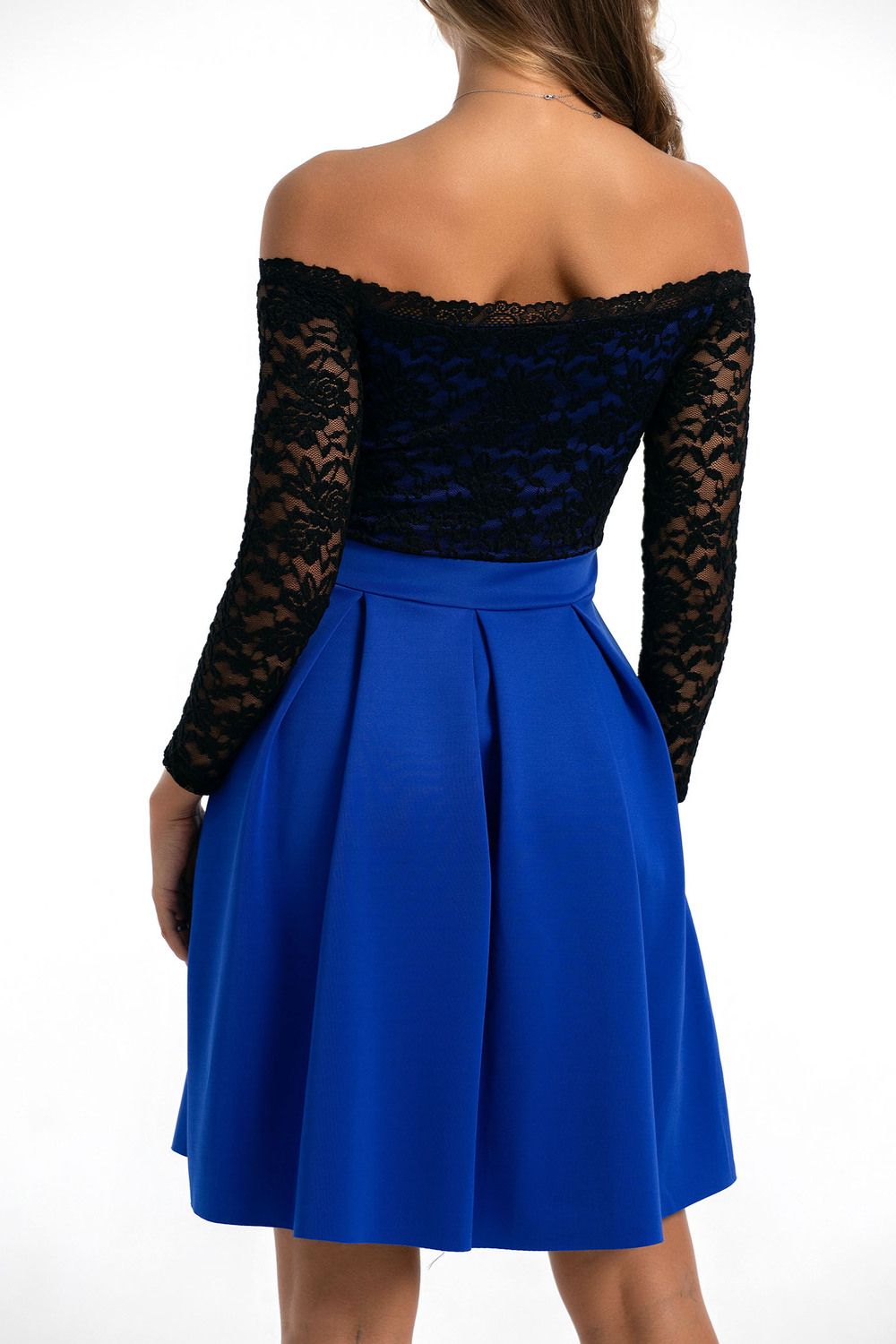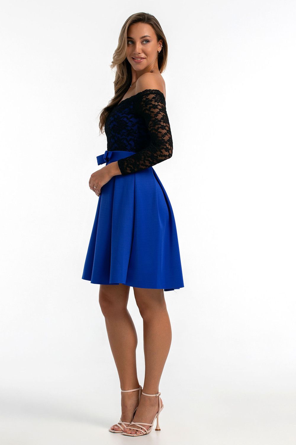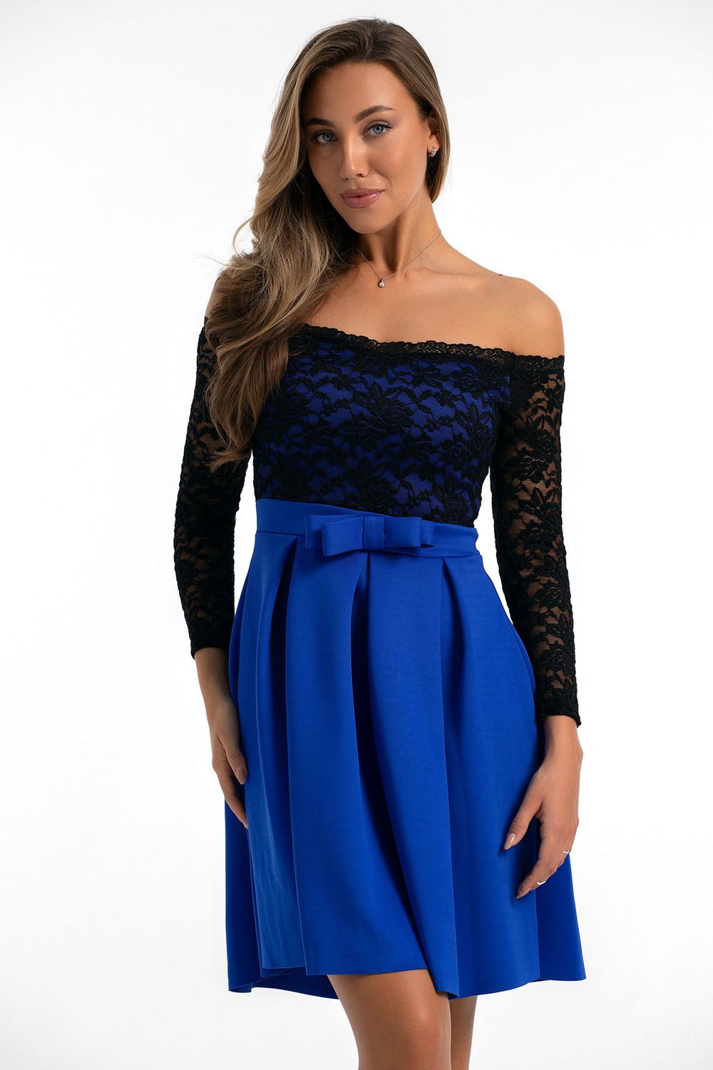 Утонченное приталенное платье длины мини с открытыми плечами с рукавами и нежным прилегающим лифом из кружевной ткани, а также струящейся юбкой со складками и декоративным бантиком на талии, выполненное из приятной к телу однотонной ткани.