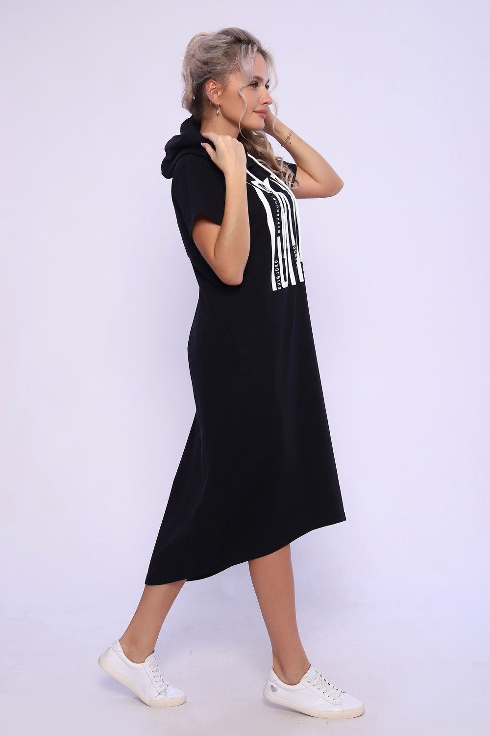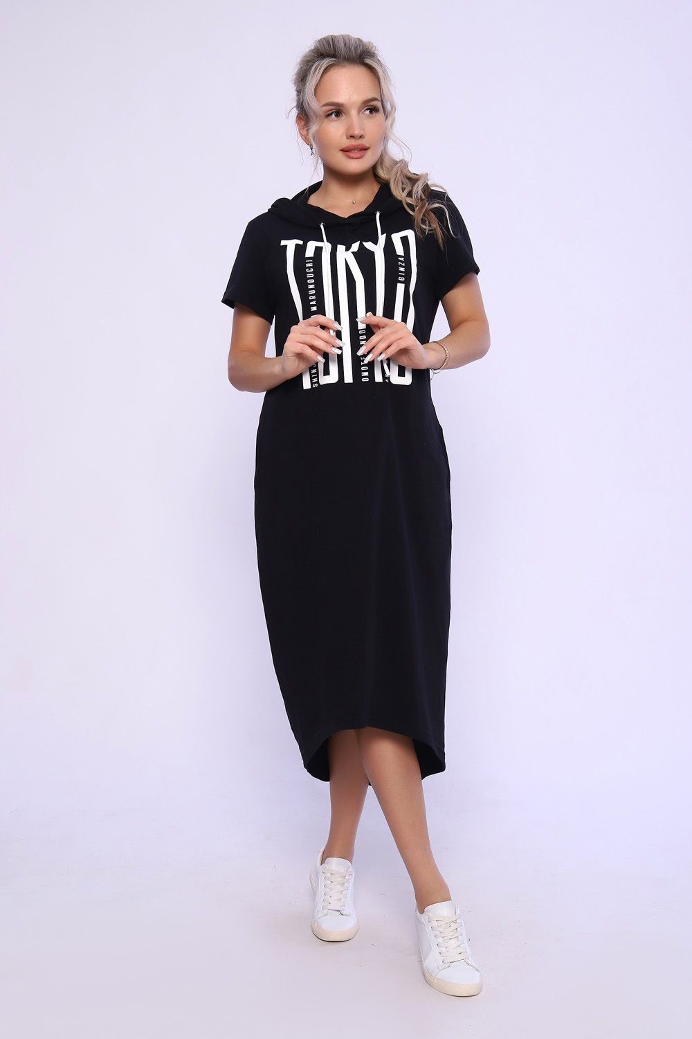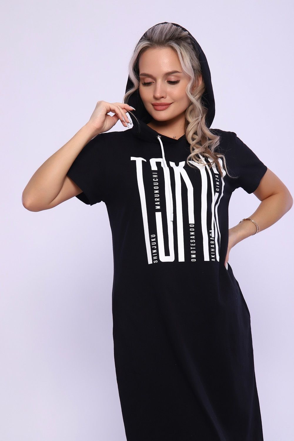 Это платье действительно впечатляет своим дизайном и функциональностью. Асимметричный крой и капюшон со шнуровкой придают ему современный вид, а короткие рукава делают его идеальным выбором для теплых дней. Принт с надписями и акцентом на "Tokyo" добавляет интересный штрих, что позволяет выделиться из толпы и подчеркнуть индивидуальность.