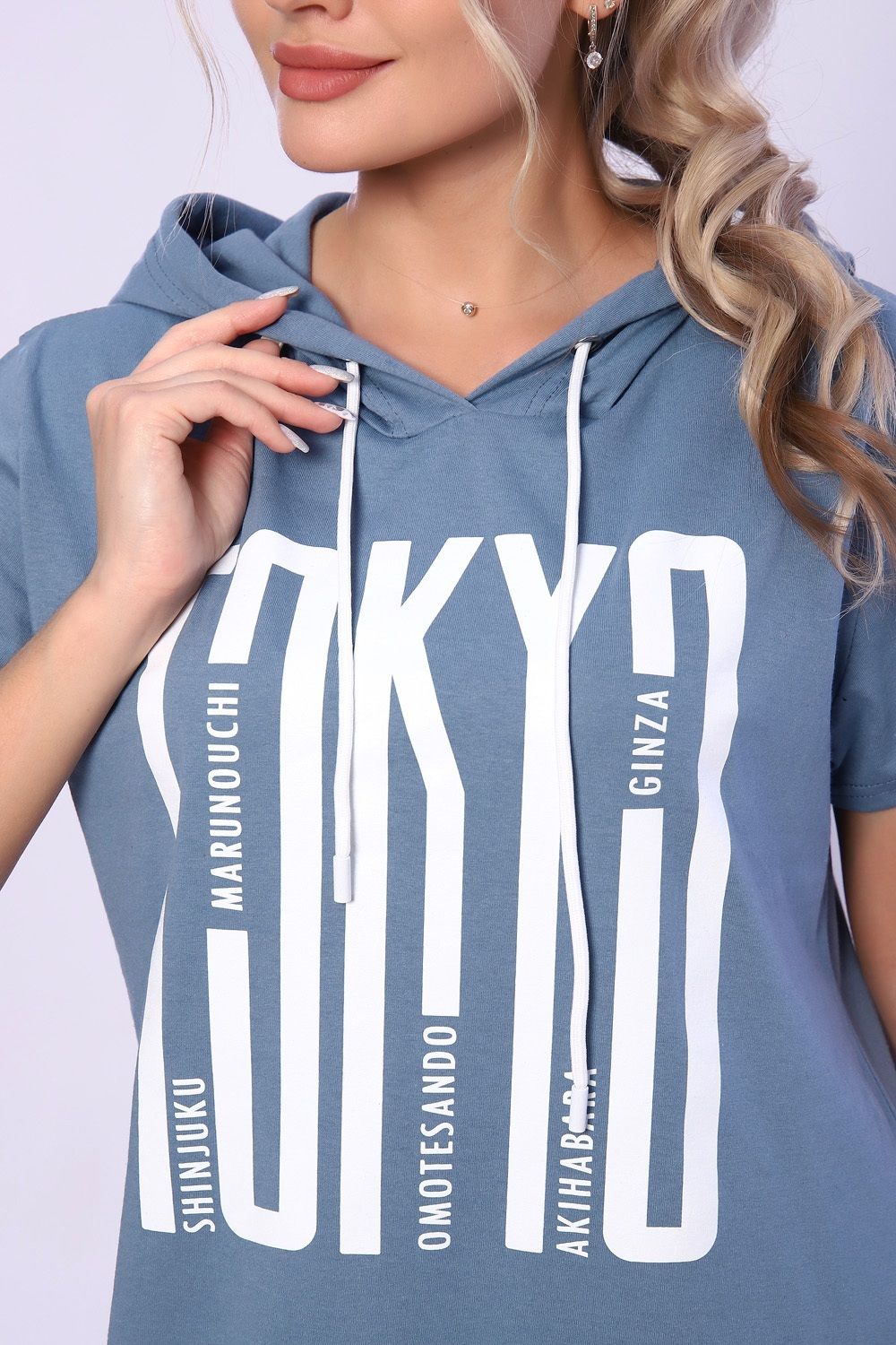 Это платье действительно впечатляет своим дизайном и функциональностью. Асимметричный крой и капюшон со шнуровкой придают ему современный вид, а короткие рукава делают его идеальным выбором для теплых дней. Принт с надписями и акцентом на "Tokyo" добавляет интересный штрих, что позволяет выделиться из толпы и подчеркнуть индивидуальность.