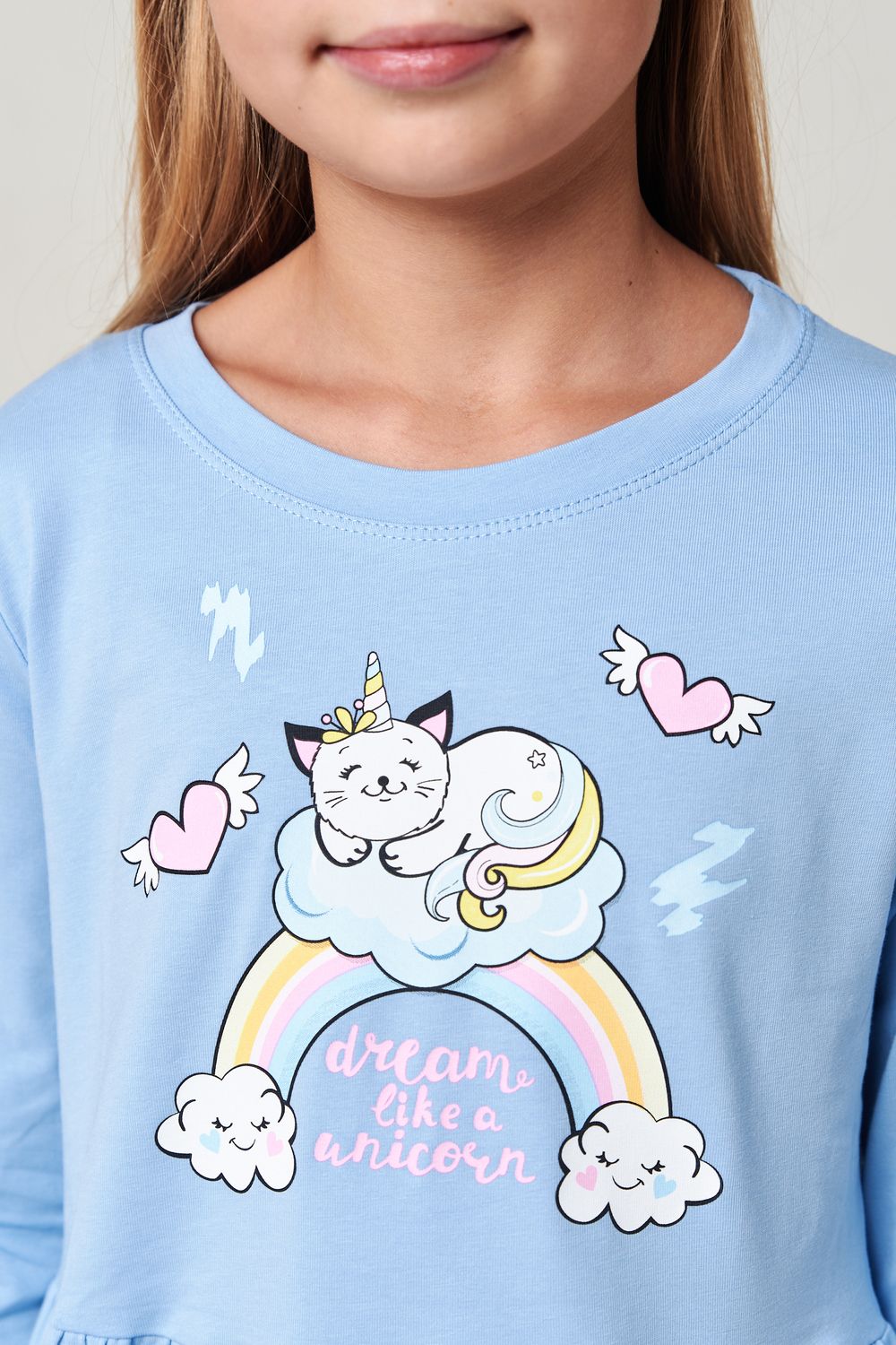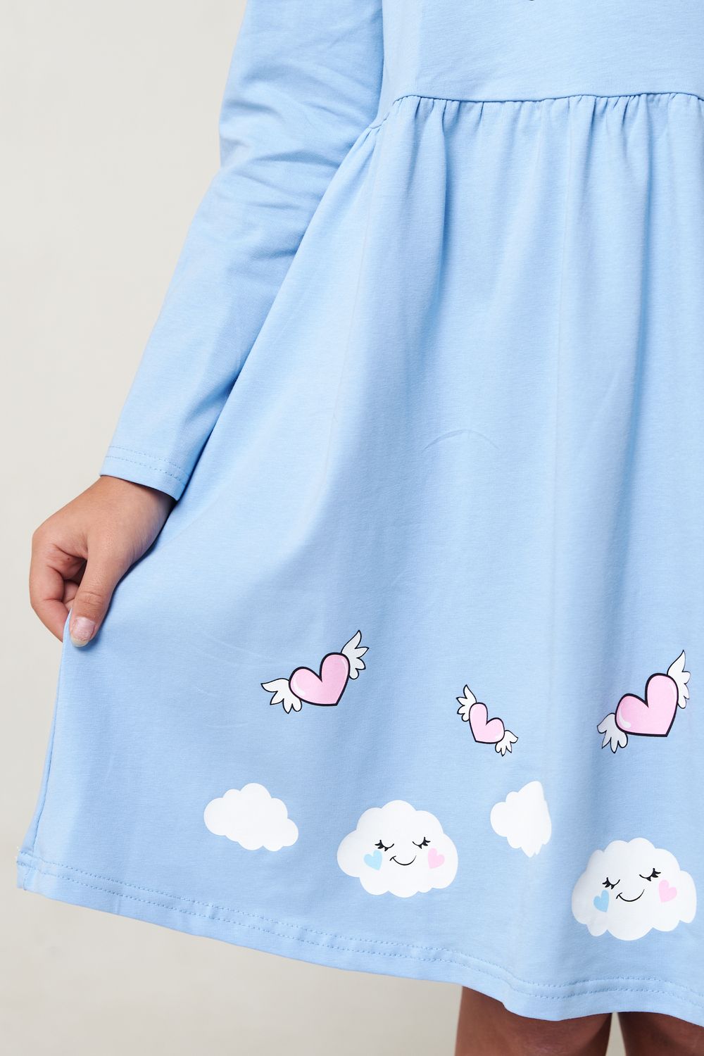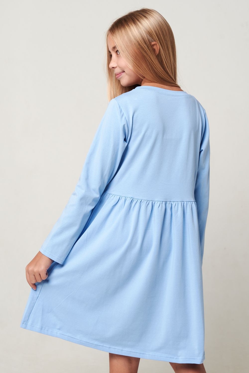 Платье для девочек дошкольного и младшего школьного возраста, из однотонного трикотажного полотна кулирка с лайкрой. Платье прилегающего силуэта, отрезное и расклешенное от линии талии, с втачным длинным одношовным рукавом, с обтачкой в горловине. Низа рукавов и нижней части платья подогнуты. По шву втачивания обтачки в горловину проложена отделочная строчка. Спереди на верхней и нижней частях платья нанесен печатный рисунок.