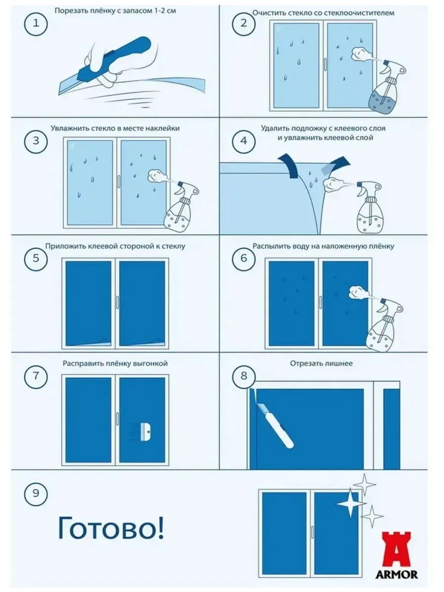 Многоразовая пленка на окна и любые другие гладкие поверхности. Защищает от ультрафиолета. Солнцезащитная пленка из ПВХ приглушает солнечный свет, при этом не делает комнату темной и мрачной. Превращает обычное стекло на окне или в мебели в бесподобный витраж и мгновенно преображает интерьер. Подходит для окон, стеклянных дверей, душевых кабинок, кухни и любых поверхностей, на которые ее можно наклеить. Обеспечивающие конфиденциальность шторы интерьерные идеальны, как эстетичные украшения на окно. Защищает ваше личное пространство от посторонних глаз. Пленка витражная практичная альтернатива громоздких шторах и жалюзи, которые собирают пыль и прихотливы в уходе. Декоративная пленка на окно не боится влаги, подходит для ежедневного мытья влажной тряпкой. Статические витражные пленки можно использовать бесконечное количество раз! Эффектный отделочный материал, подходящий для ремонта внутри и снаружи. Непросвечивающая термостойкая интерьерная наклейка - это стильный домашний декор с рисунком для стен и мебели. Достоинства пленки в легком монтаже и при необходисмоти демонтаже, при котором не остается следов. Инструкция по установке: Подготовьте поверхность, очистив ее от загрязнений. Сделайте замер и отрежьте необходимый кусок. Обильно увлажните оклеиваемую поверхность с помощью пульверизатора обычной водой (не должно остаться сухих участков). Удалите прозрачный защитный слой (примерно на треть). Начинайте наслаивать с угла сверху вниз. Мягкой ветошью разглаживайте пленку, чтобы выгнать пузырьки воздуха и воду. Постепенно отделяйте защитный слой, пока не оклеите всю поверхность. Не выбрасывайте защитный слой – витражную пленку можно использовать много раз! Если решите снять витраж, то лучше хранить его в рулоне с защитной подложкой.