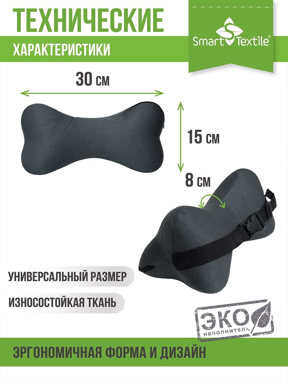 Поддержка: Уникальная форма подушки в виде косточки специально разработана для поддержания шеи, снижая напряжение и усталость во время вождения.