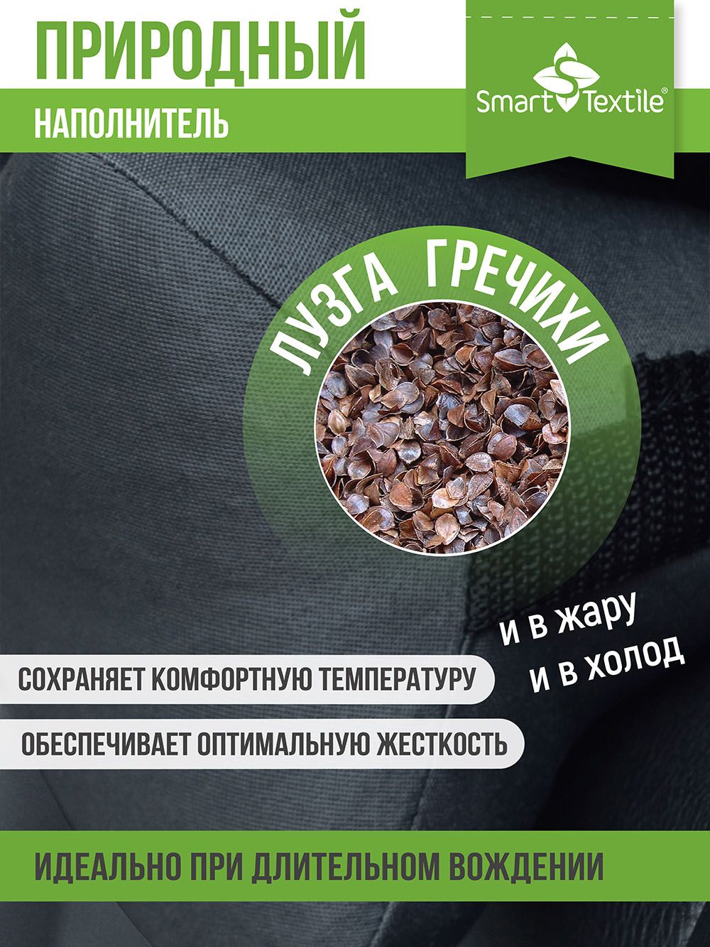Комфорт и вентиляция: Лузга гречихи обладает отличной воздухопроницаемостью, что предотвращает перегрев и обеспечивает свежесть на протяжении всего времени использования.