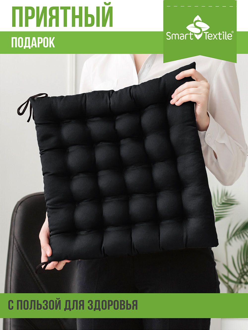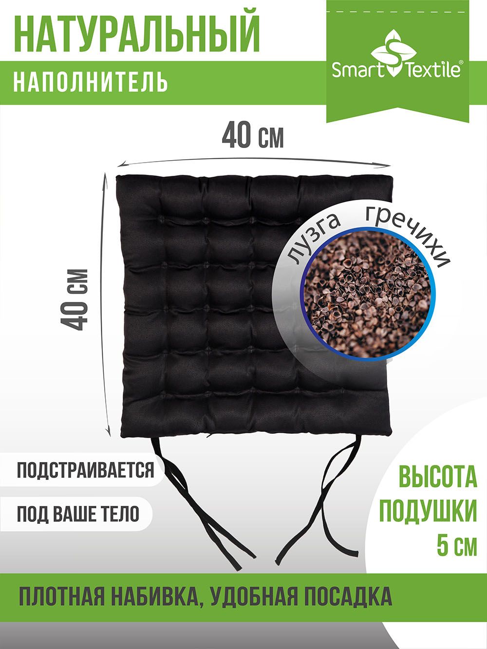 Благодаря форме пошива в виде объемных ячеек и уникальным природным свойствам наполнителя из лузги гречихи, сидеть на такой подушке удобно и полезно. С завязками для стула. Чехол: смесовая ткань. Наполнитель: лузга гречихи.