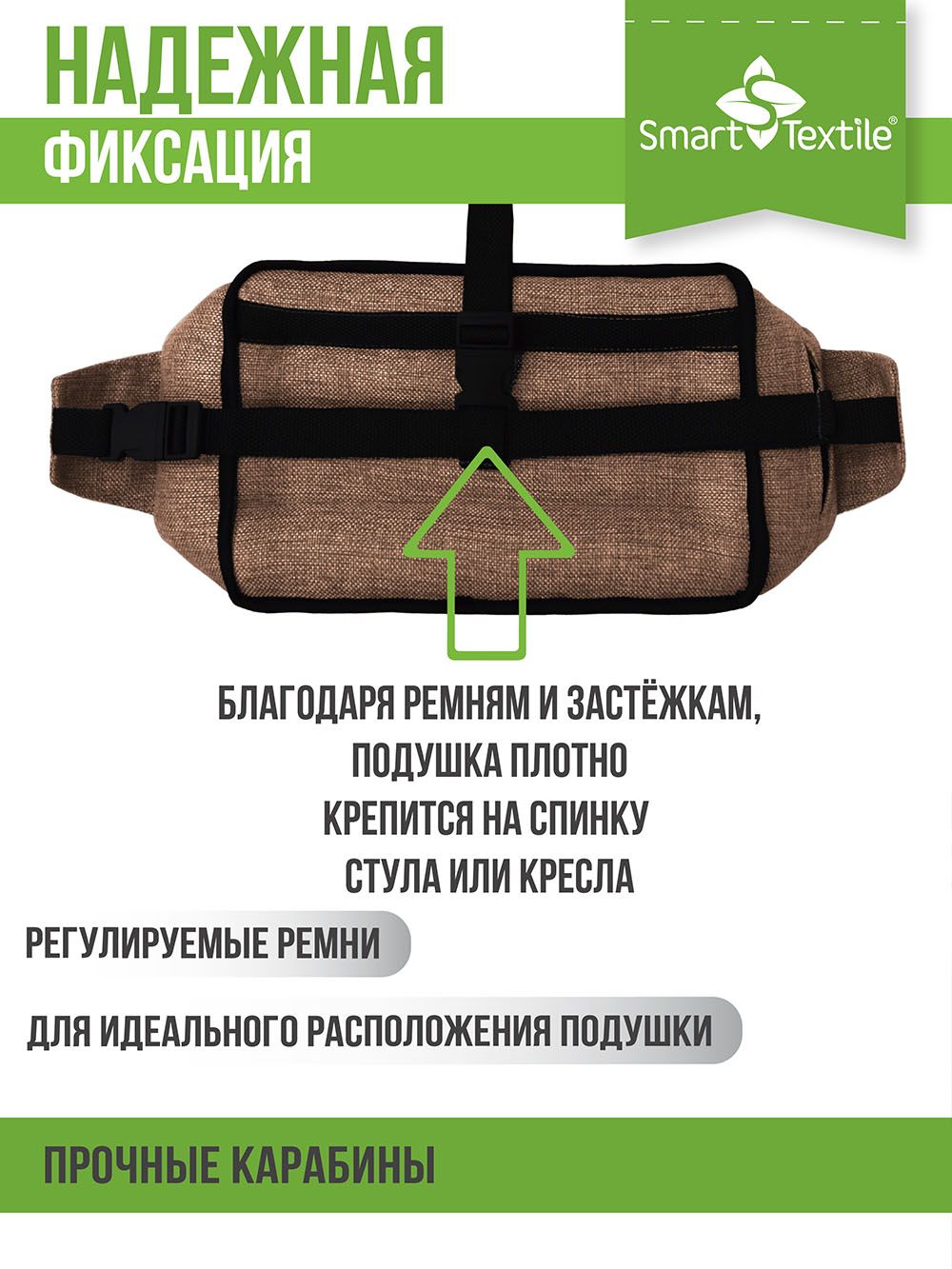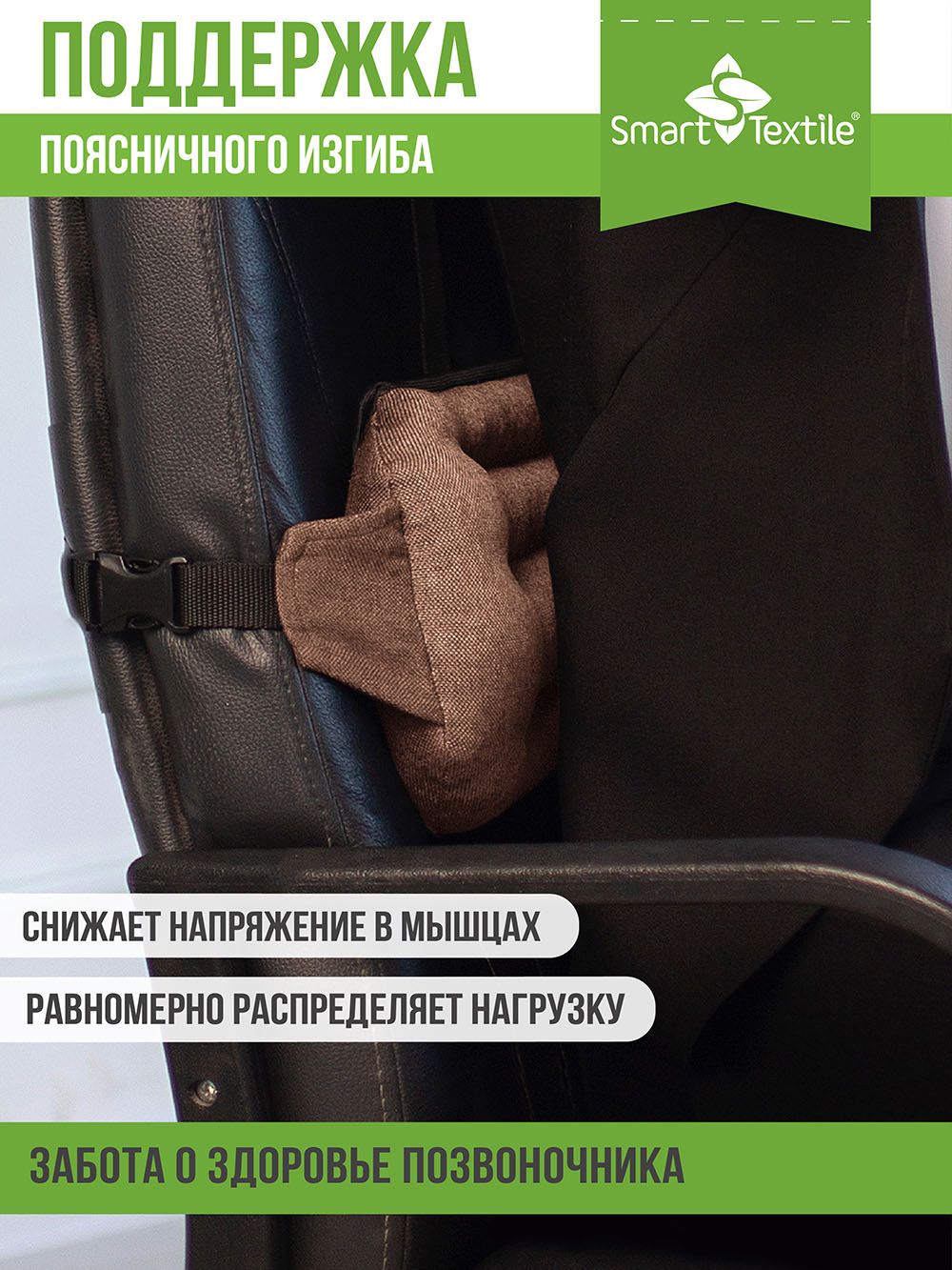 Подушка под поясницу крепится к спинке кресла или офисного стула с помощью регулируемых ремешков. Используемые материалы износоустойчивые, воздухопроницаемые и гипоаллергенные.
