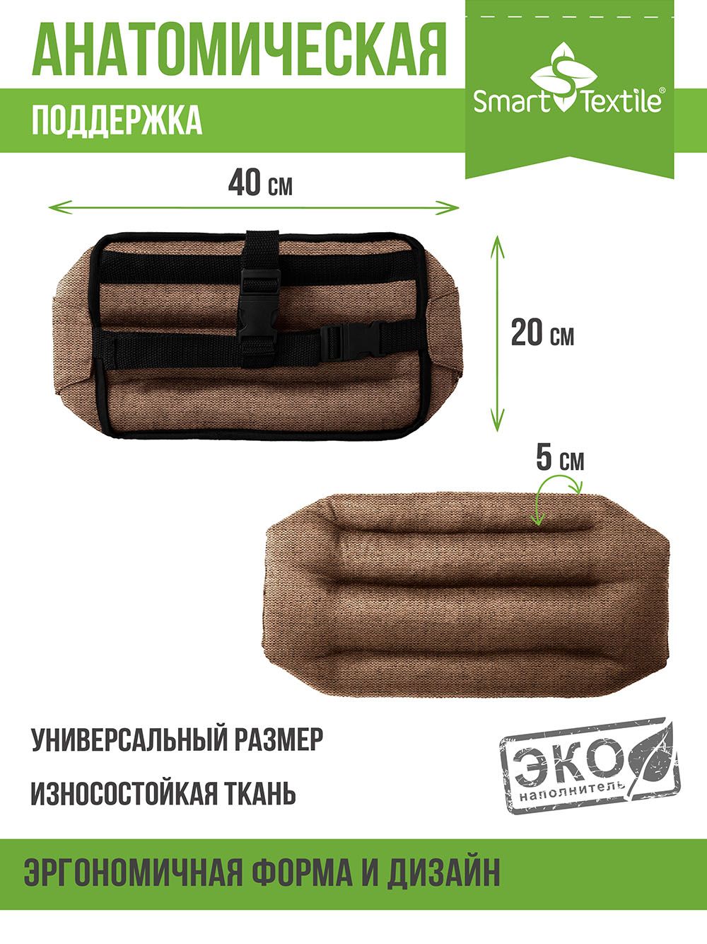 Подушка под спину выполнена в виде горизонтальных валиков, плотно наполненных лузгой гречихи. Такой дизайн обеспечивает отличную циркуляцию воздуха между спиной и креслом, что особенно важно в жаркую погоду. Лузга гречихи не нагревается, поддерживая комфортную температуру.