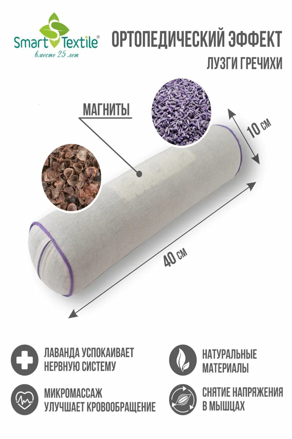 Удобный универсальный валик из натуральных материалов с магнитами является отличным средством для снятия напряжения и восстановления иммунитета. Рекомендуется в лечебно-профилактических целях и для создания комфортного отдыха. Применение валика снимает нагрузку с шейного отдела, предотвращая возникновение остеохондроза, способствует профилактике головных и поясничных болей. Льняной чехол абсолютно гипоаллергенен, обладает хорошими гигиеническими свойствами. Наполнитель из натуральной лузги гречихи придает умеренную жесткость валику и обладает микромассажным свойством, улучшающим кровообращение. Наличие магнитов усиливает лечебно-профилактические свойства валика, помогает восстановить энергетический баланс. Воздействие магнитных полей способствует повышению иммунитета и нормализации биополя, разрушаемого излучением от бытовых приборов. При спазмах и отеках нижних конечностей подушка-валик послужит замечательным профилактическим средством варикозного расширения вен. Аромат лаванды обладает успокаивающим эффектом, поможет быстрее расслабиться и уснуть.