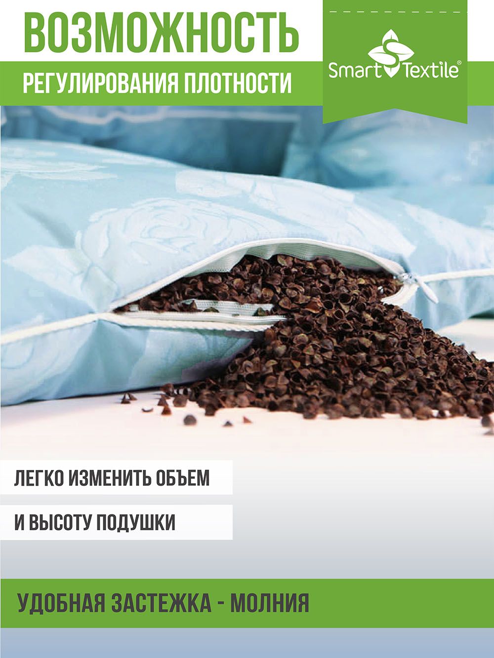 Благодаря сыпучести, наполнитель подстраивается под естественные контуры головы и шеи, создавая вокруг них комфортный, подвижный каркас. Таким образом, позвоночник во время сна и отдыха находится в правильном положении, мышцы шеи расслабляются, выравнивается дыхание, улучшается кровообращение. Лепестки лузги гречихи оказывают микромассажное воздействие на поверхность кожи. Наполнитель гипоаллергенен, используется лузга гречихи высокой степени очистки. Подушка обладает тонким, успокаивающим, приятным природным ароматом.