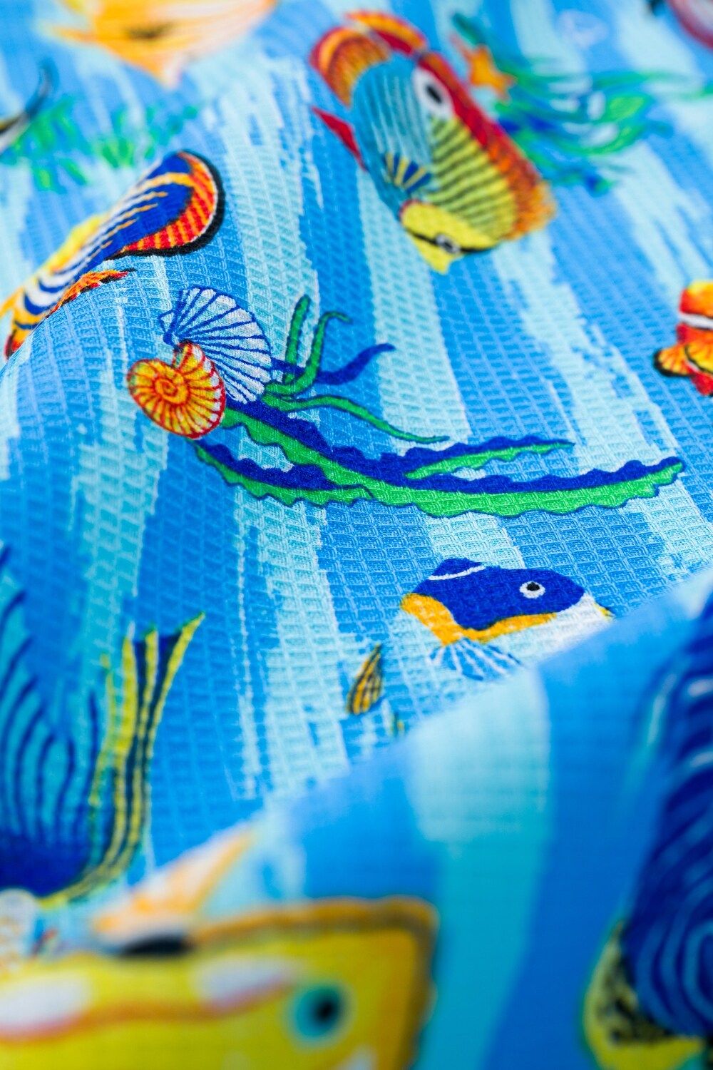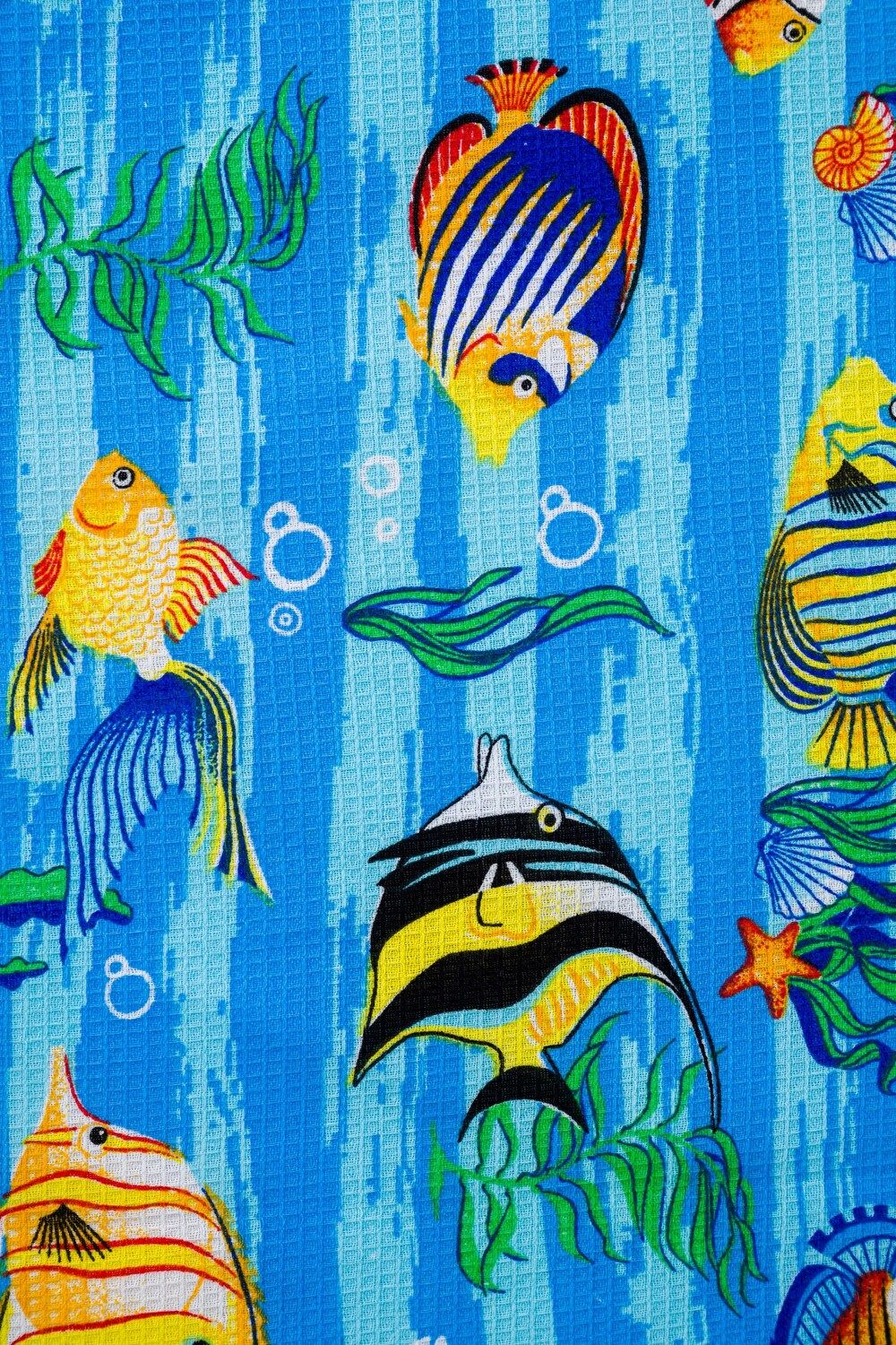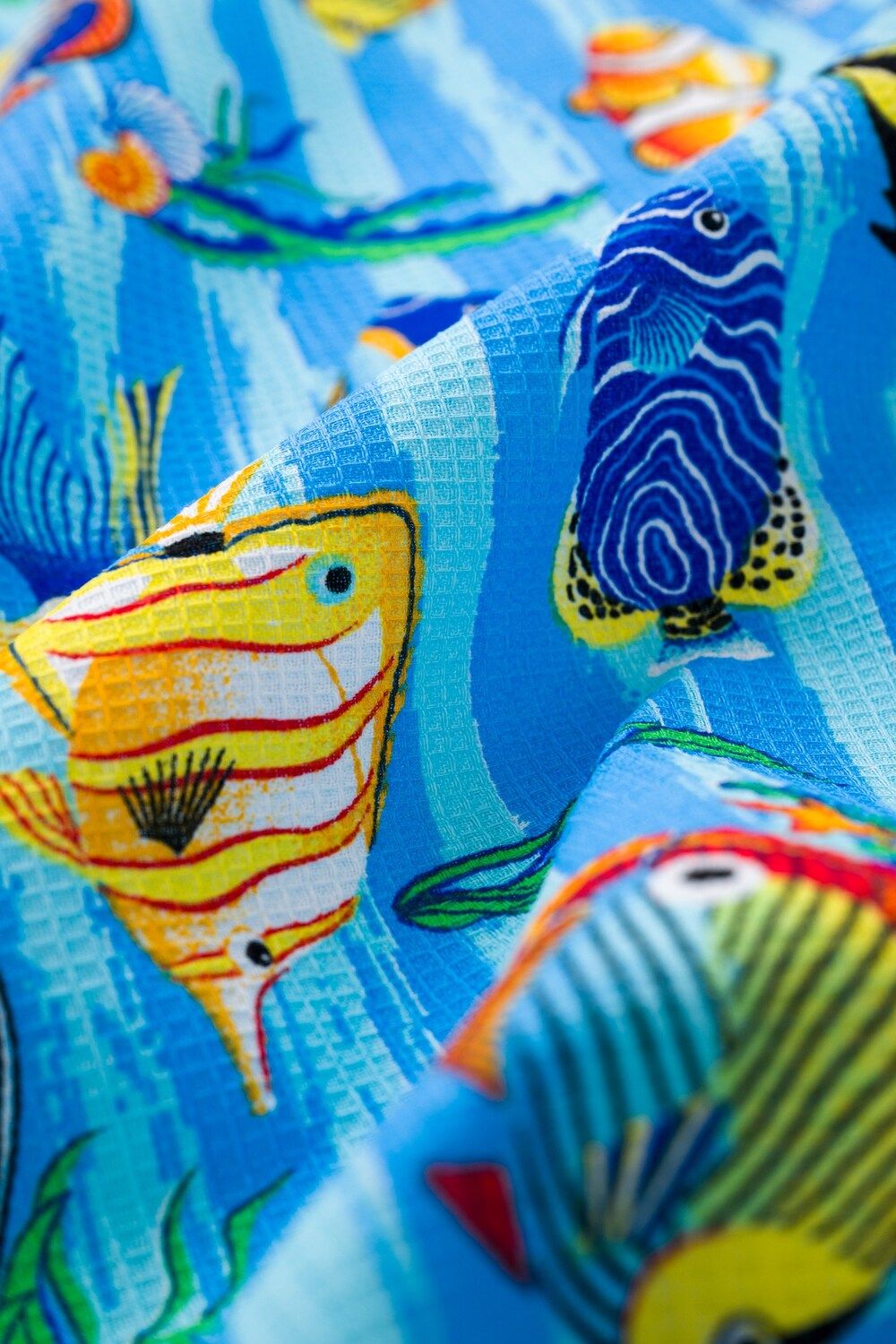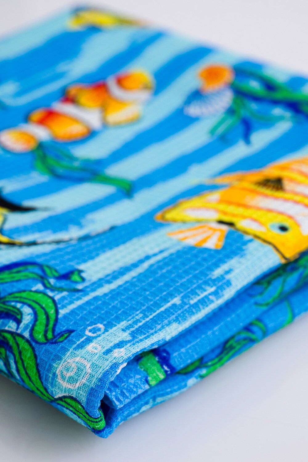 Это пляжное полотенце с рыбками - идеальный выбор для вашего отдыха на пляже или в бане. Размер 80*150 см делает его удобным и практичным для использования как полотенце для пляжа, так и накидки на шезлонг.