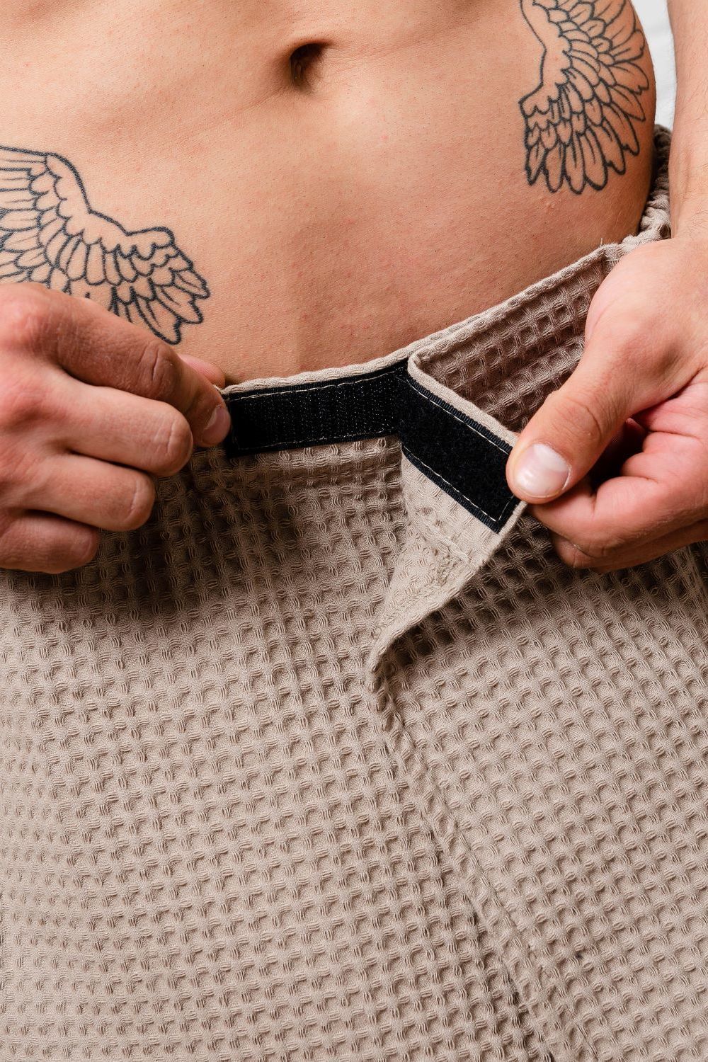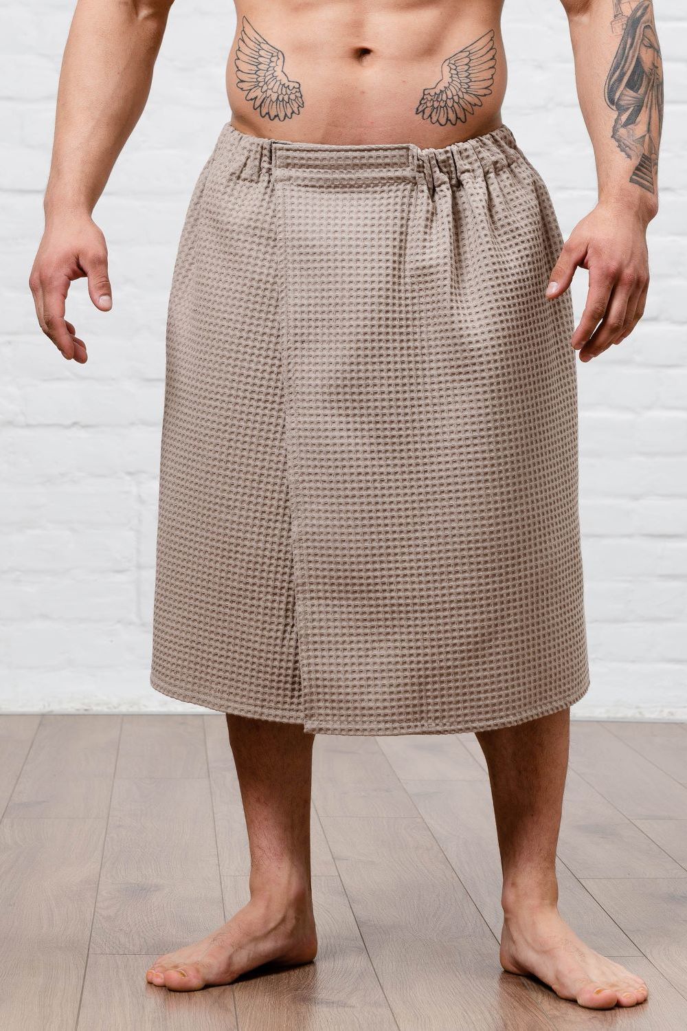 Парео (килт) мужской вафельный на липучке. Плотность ткани: 242 гр/м2. Состав: 100% хлопок. Упаковка: индивидуальный полиэтиленовый пакет. Размер накидки 73*145 см. Парео идеально подойдет для любителей бани и сауны.