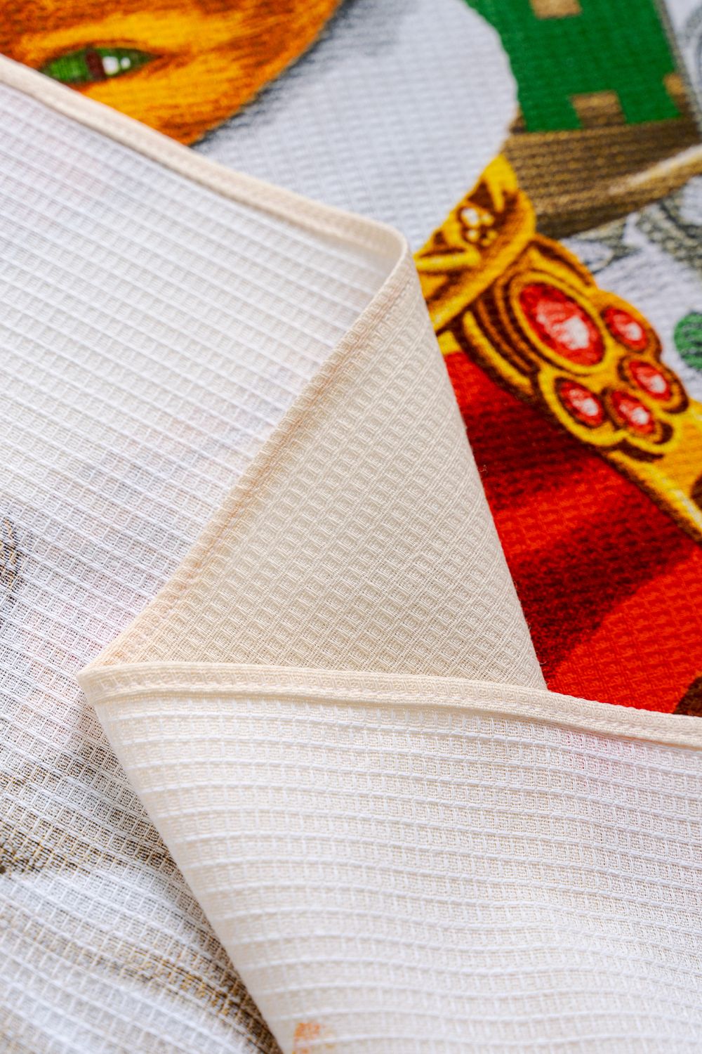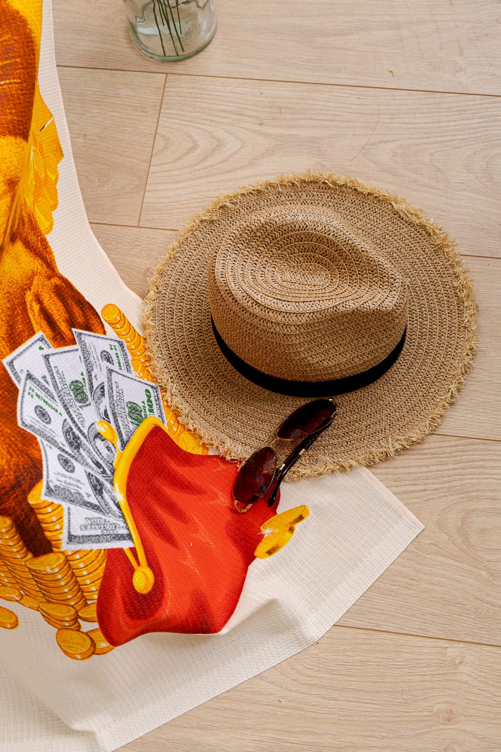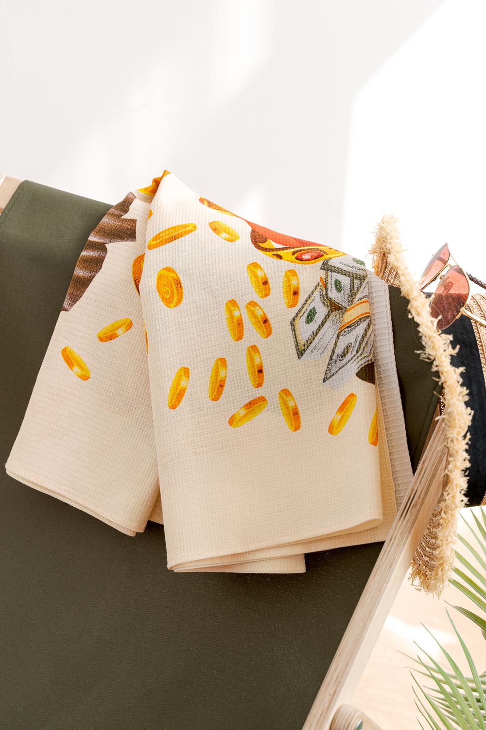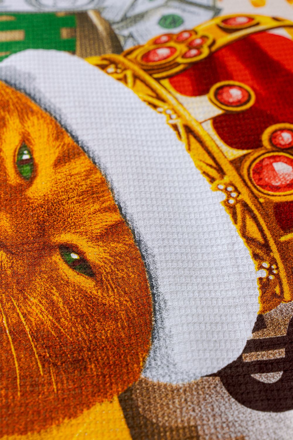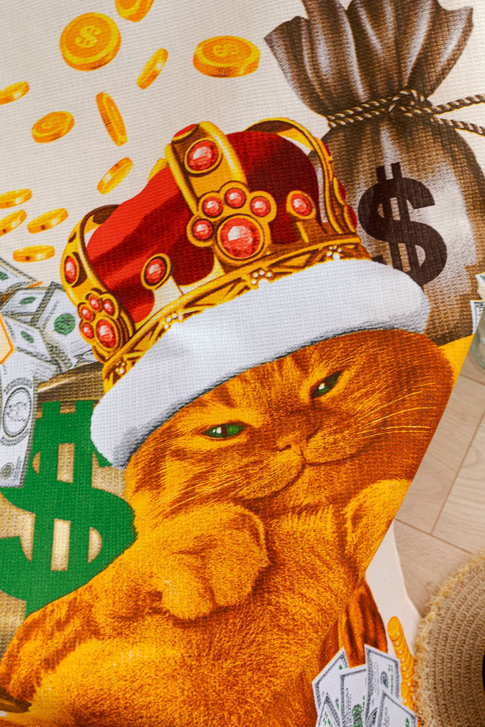 Большое вафельное с забавным котом, купающимся в золоте, выполнено из 100% хлопка. Изделие отлично подойдет для пляжа, ванной, бани и сауны. Пляжное полотенце мягкое легкое и компактное. Изделие отлично впитывает влагу, быстро сохнет и не требует дополнительного ухода. Размер полотенца 150*80, к широкой стороне пришита петелька.