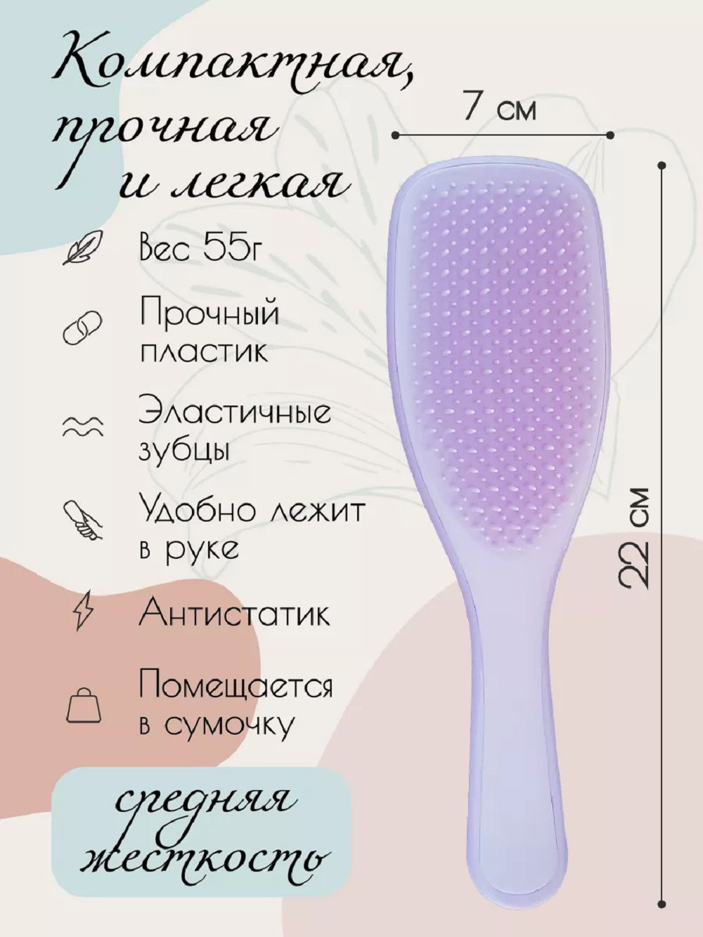 Удобная массажная расческа разных цветов обеспечит бережный уход за волосами. Благодаря жестким щетинкам с круглыми кончиками, она отлично справляется с поставленной задачей. Эффективно разбирает прическу на локоны, а зубья при этом расчесывают тонкие прядки. Для продувки феном на изделии предусмотрены специальные отверстия. Аксессуар удобно использовать как для сухой укладки, так и сушки мокрой шевелюры. Он обладает эффектом антистатика, обеспечивает мягкий массаж кожи головы для разгона крови. Это отличное средство для классического расчесывания и выпрямления, придания объема у корней и создания самых разнообразных женских и мужских, детских причесок.