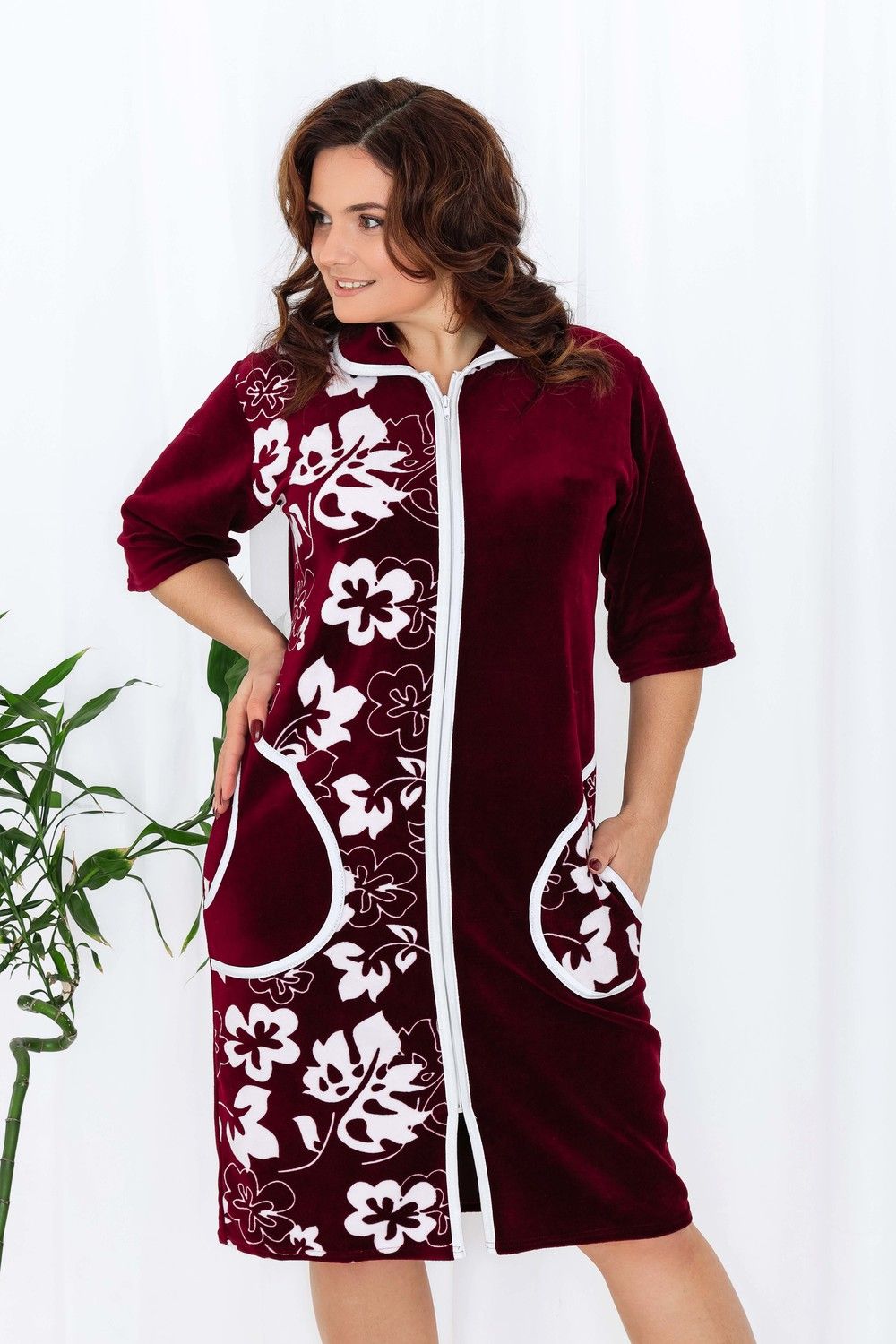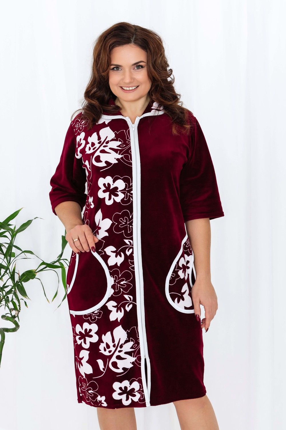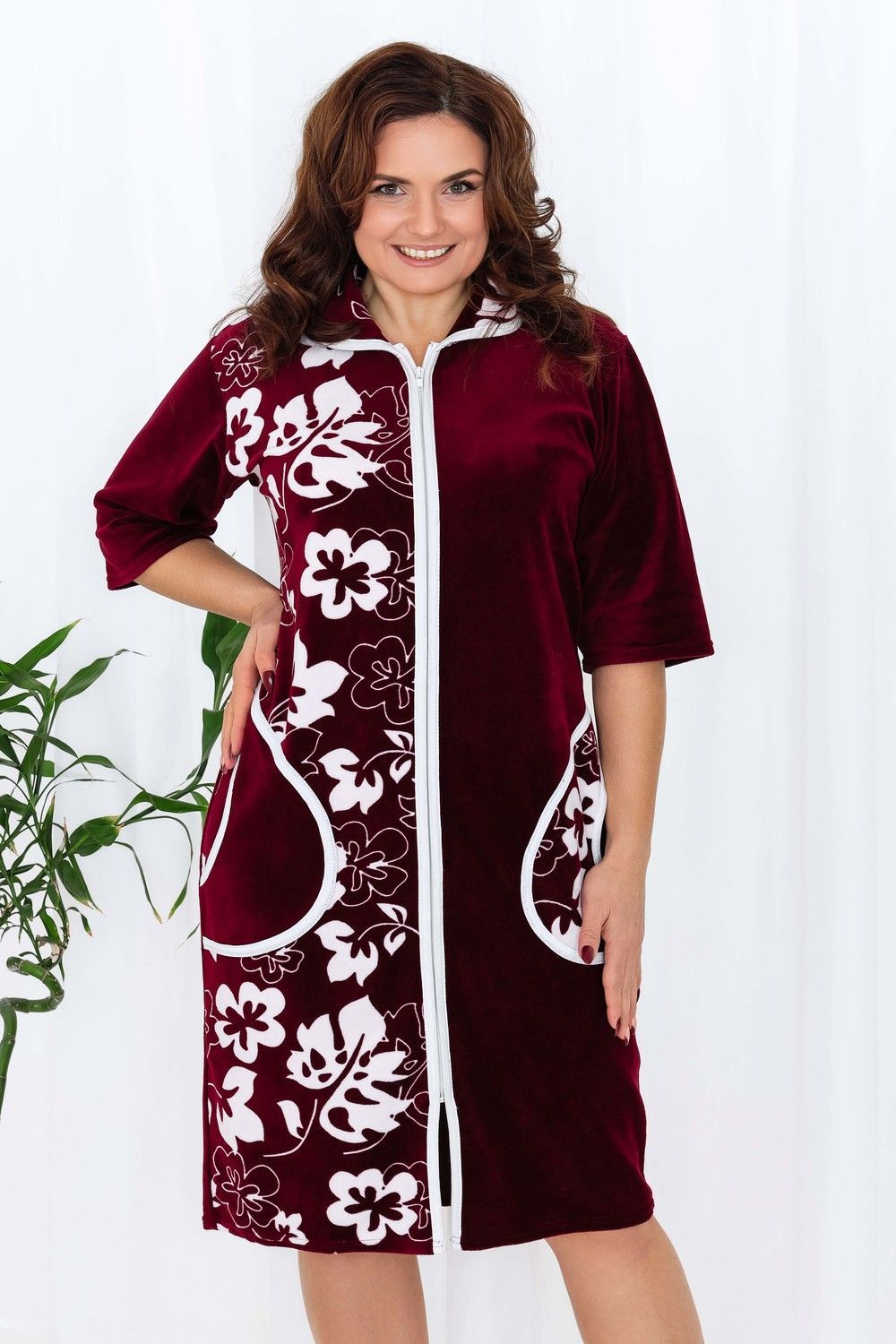 Халат домашний женский на молнии. Рукав короткий, длина ниже колена, в боковых швах два полупояса, воротник круглый. Размерный ряд имеет большие размеры.