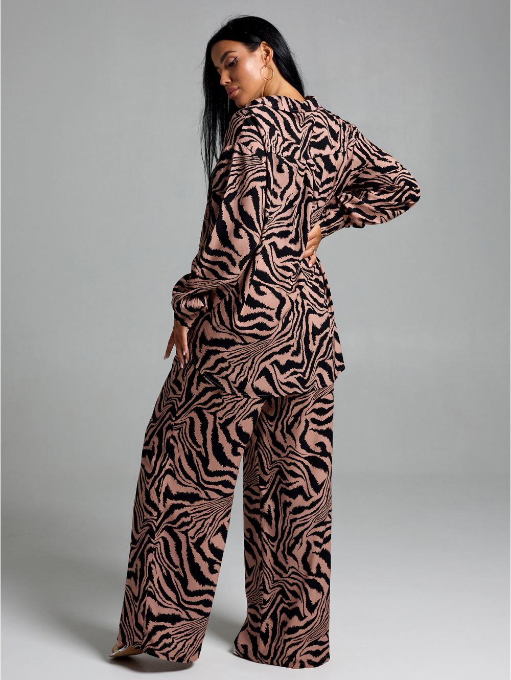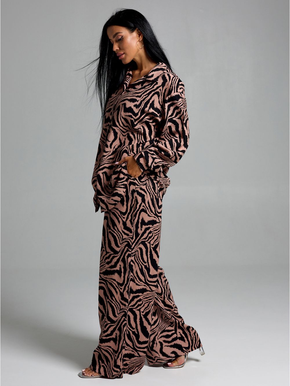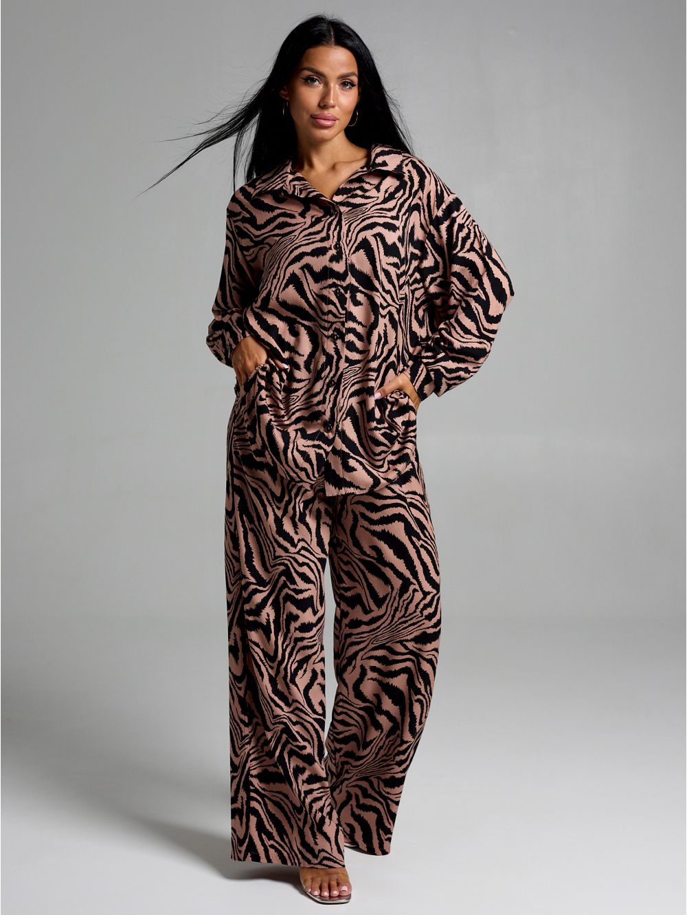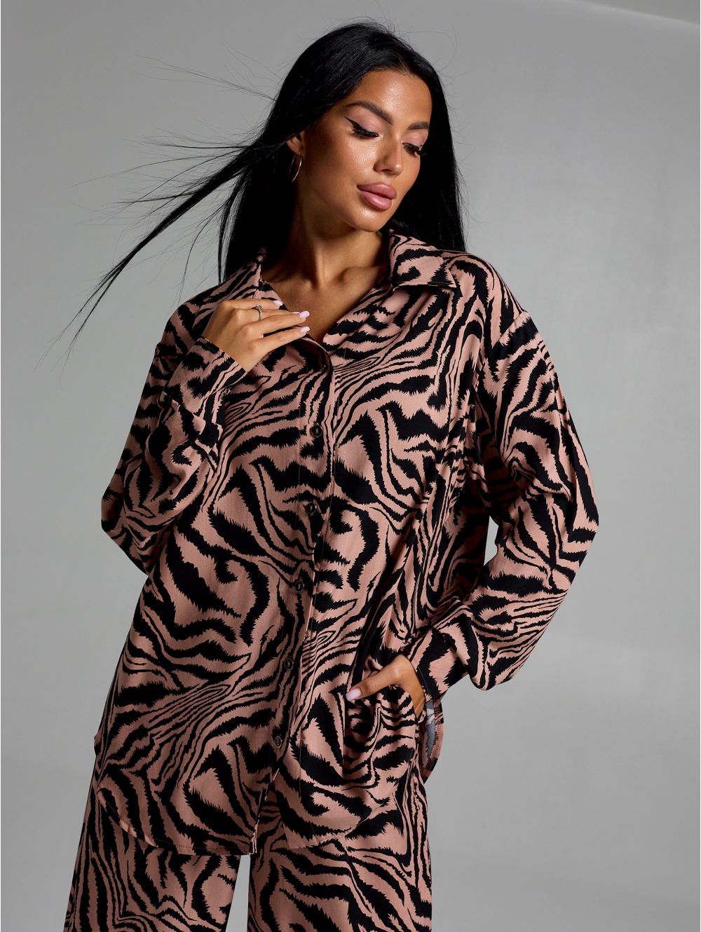 Костюм женский состоит из рубашки и брюк. Рубашка – прямого силуэта. Брюки прямые от бедра с отрезным поясом.