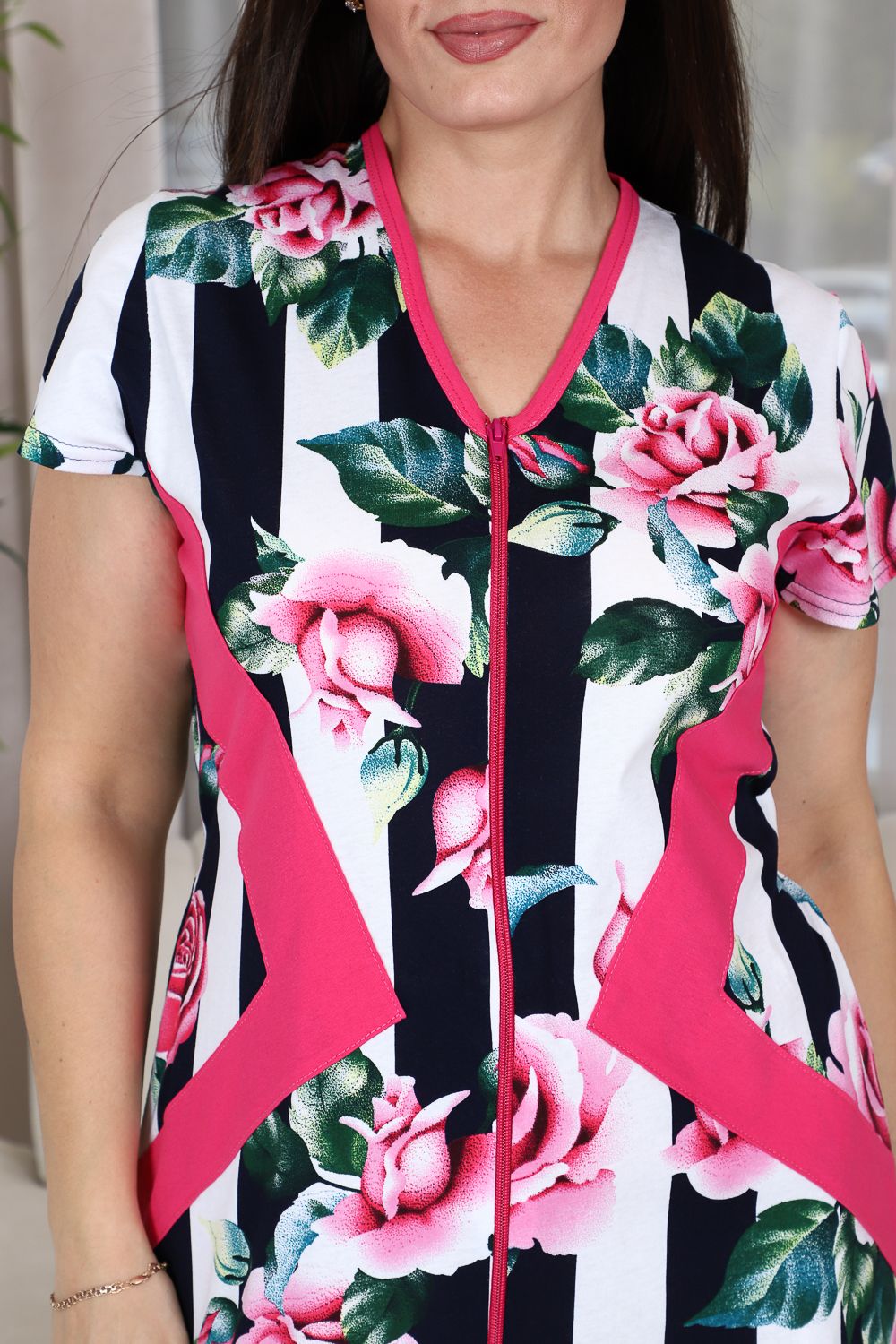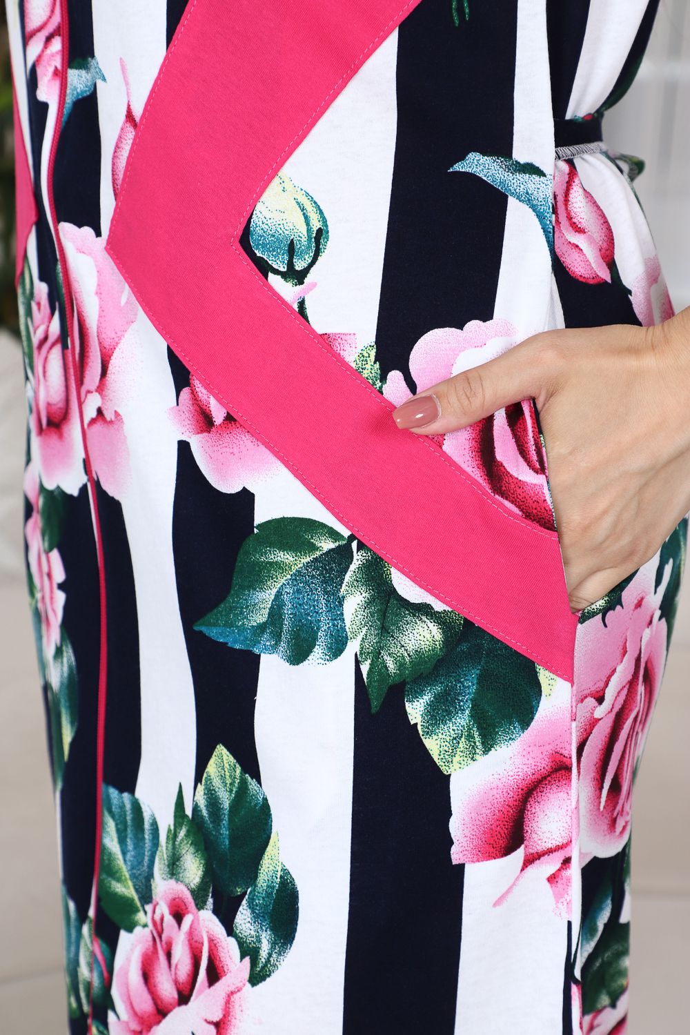 Женский халат средней длины, V-образный вырез горловины, по бокам фигурные вставки черного цвета, визуально корректирующие фигуру