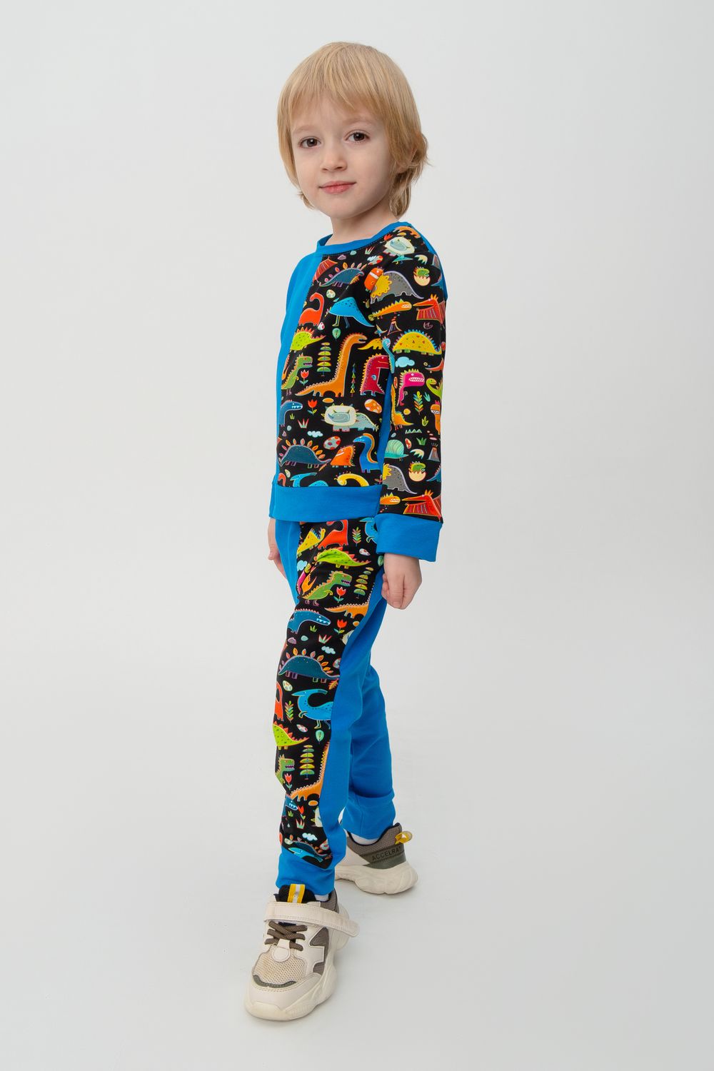 Костюм Дино состоит из свитшота с принтом и брюк. Изделия выполнены из набивного футера, что поможет ребенку не бояться прохладной погоды. Комплект слегка прилегает к телу, не раздражает кожу и легок в уходе. При стирке не деформируется и не пилингуется.