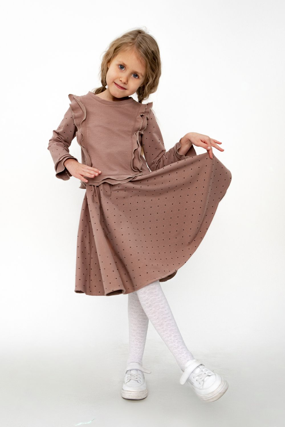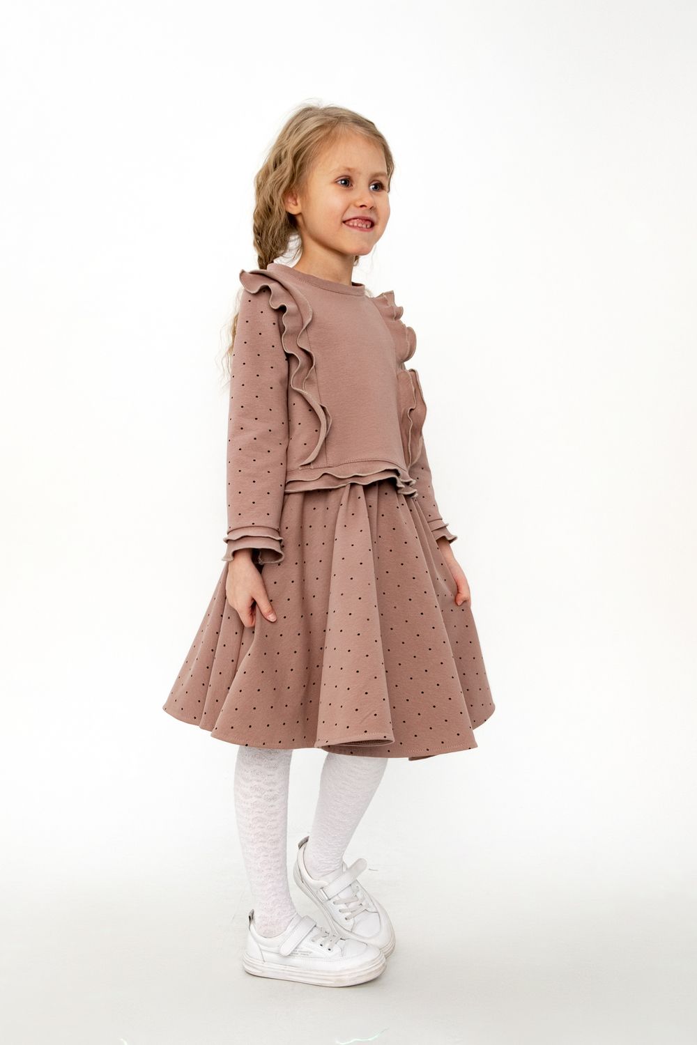 Костюм состоит из лонгслива и юбки, которые имеют узор в мелкий темный горошек. Выполнен из набивного футера, который легок в уходе и стирке. Костюм подойдет как для повседневной носки, так и для особых дней.